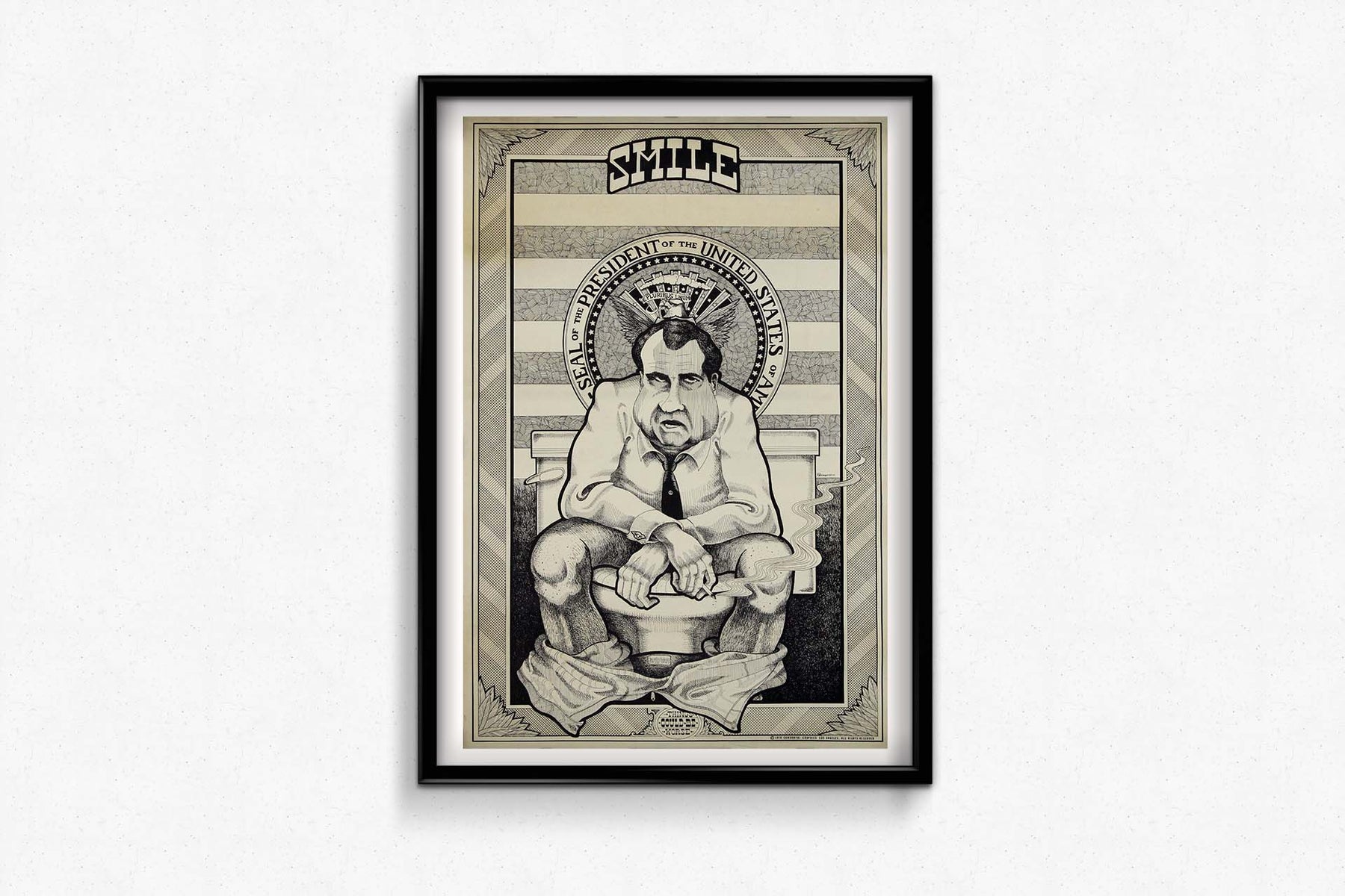 The inclusion of the Seal of the President of the United States of America adds to the irony. The formal emblem, typically representing power and respect, is juxtaposed with the comical scene of Nixon on the toilet, further driving home the point that the dignity of the presidency has been compromised. It reflects the disillusionment and cynicism many Americans felt during Nixon’s time in office.