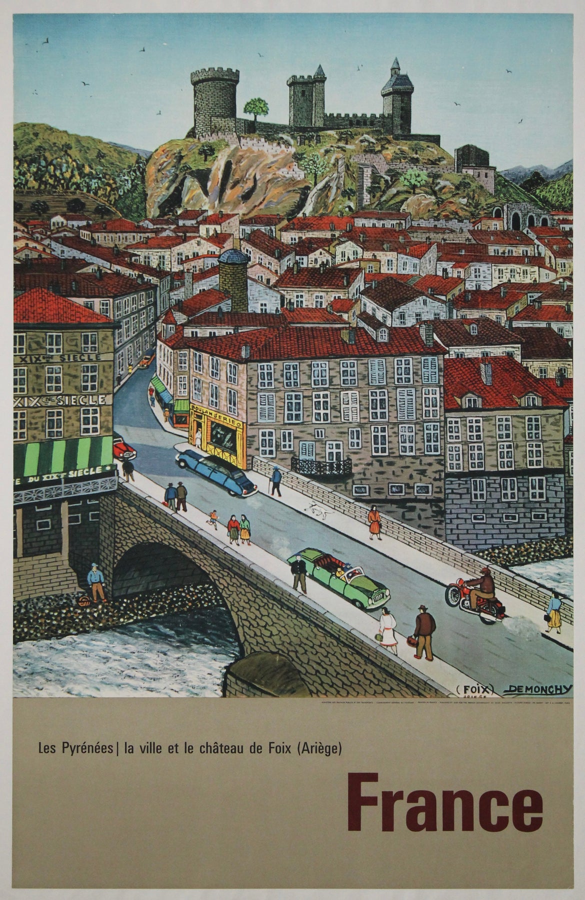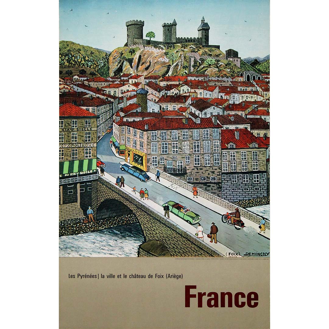 This colorful 1952 tourism poster by the illustrator Demonchy celebrates the historic town of Foix, located in the foothills of the Pyrenees. The poster highlights the dramatic presence of the Château de Foix, which dominates the skyline above the red-roofed houses of the old town.