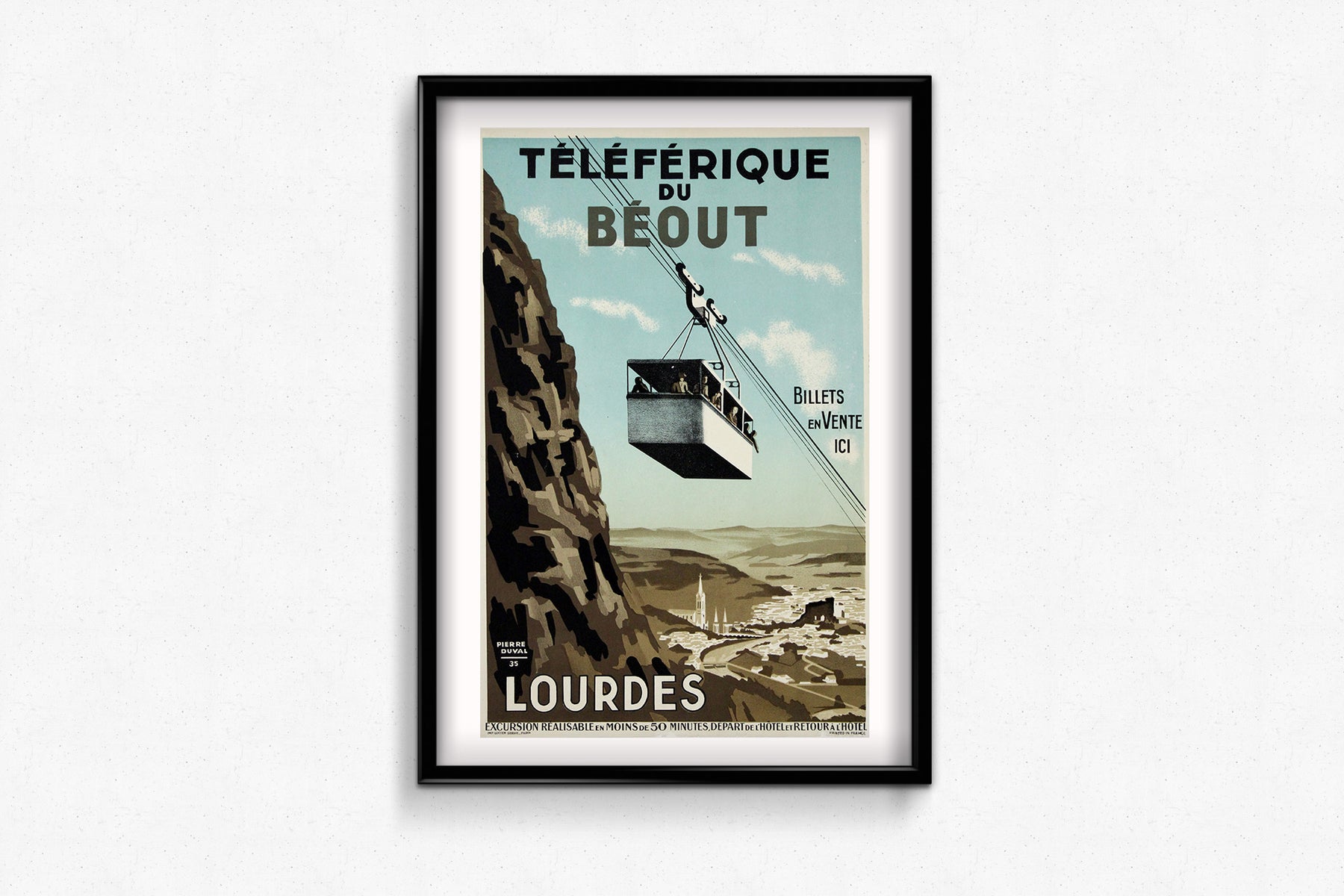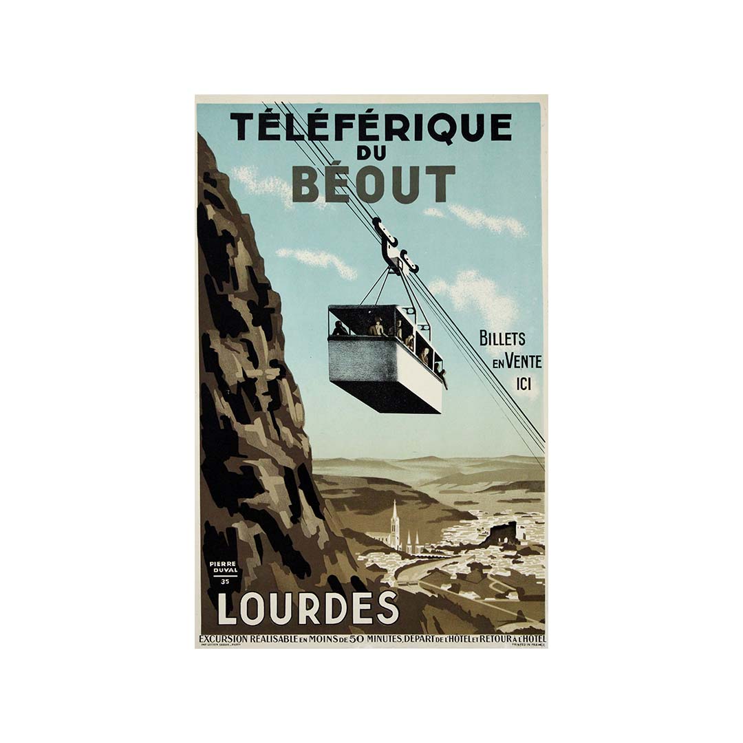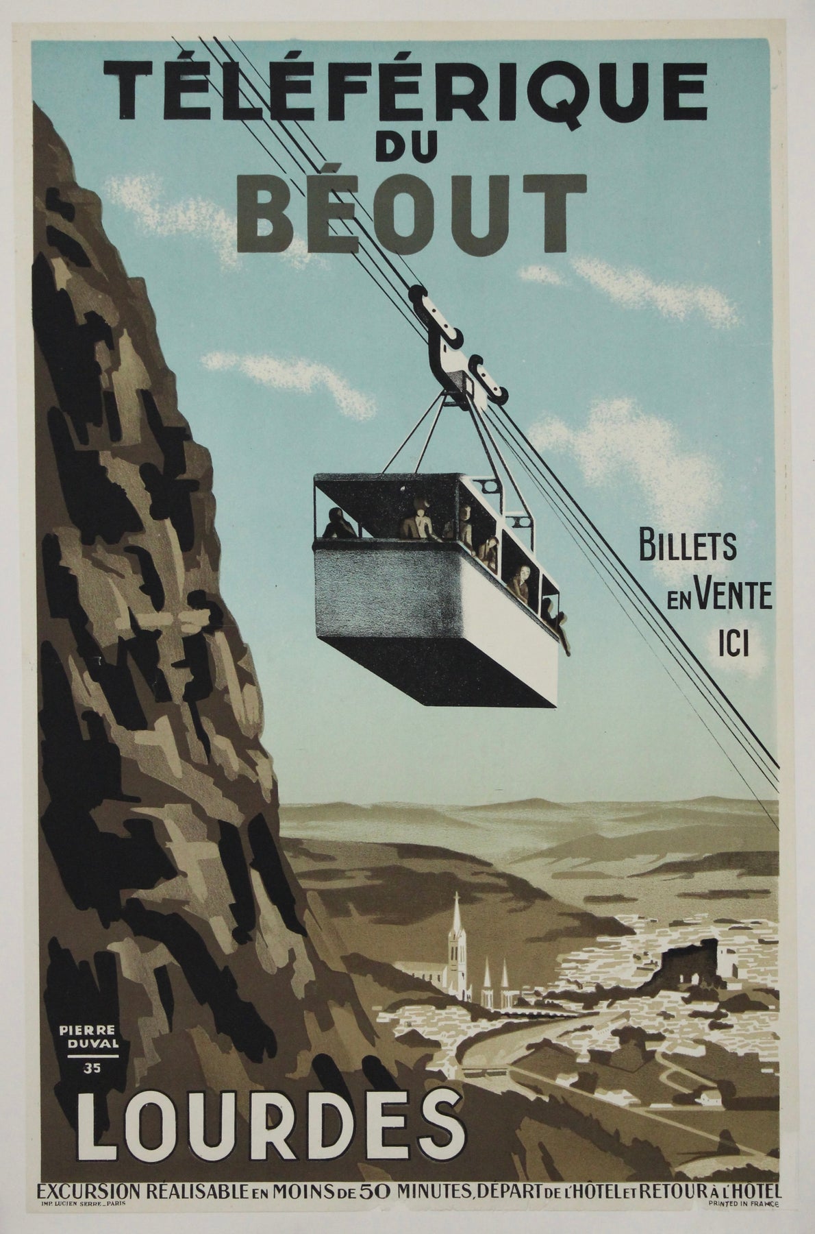 This 1935 original travel poster by the artist Pierre Duval promotes the Téléférique du Béout, an attraction offering spectacular panoramic views above the famous pilgrimage town of Lourdes. Designed to capture the imagination of visitors, the poster highlights both the dramatic mountain landscape and the modern technology that allowed travelers to experience it.