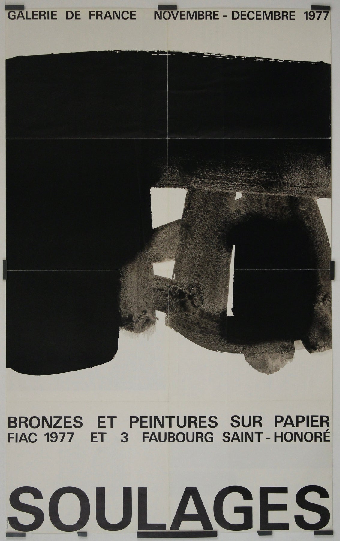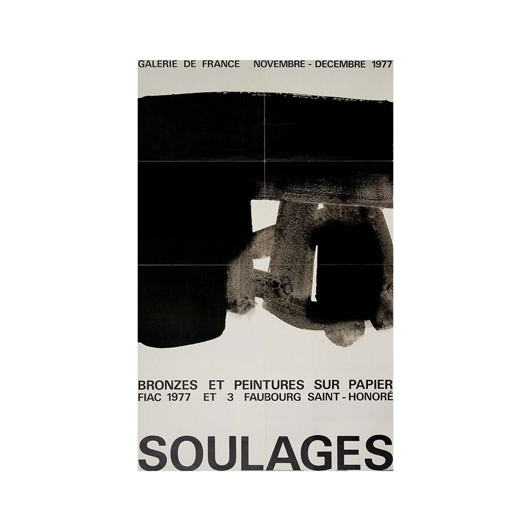 The 1977 original exhibition poster by Pierre Soulages for "Bronzes et peintures sur papier" at FIAC (Foire Internationale d'Art Contemporain) is a testament to the artist's innovative spirit and significant contributions to contemporary art. Held at the prestigious Galerie de France, this exhibition showcased Soulages' mastery in both bronze sculptures and paintings on paper, highlighting his versatility and profound impact on modern art.