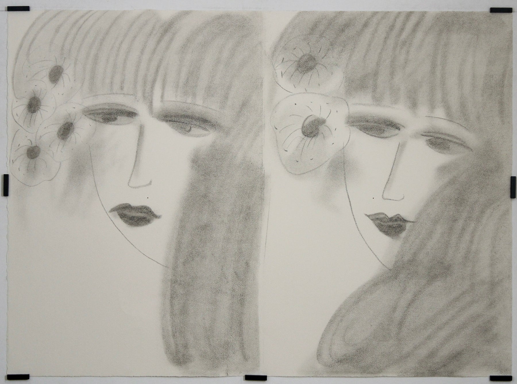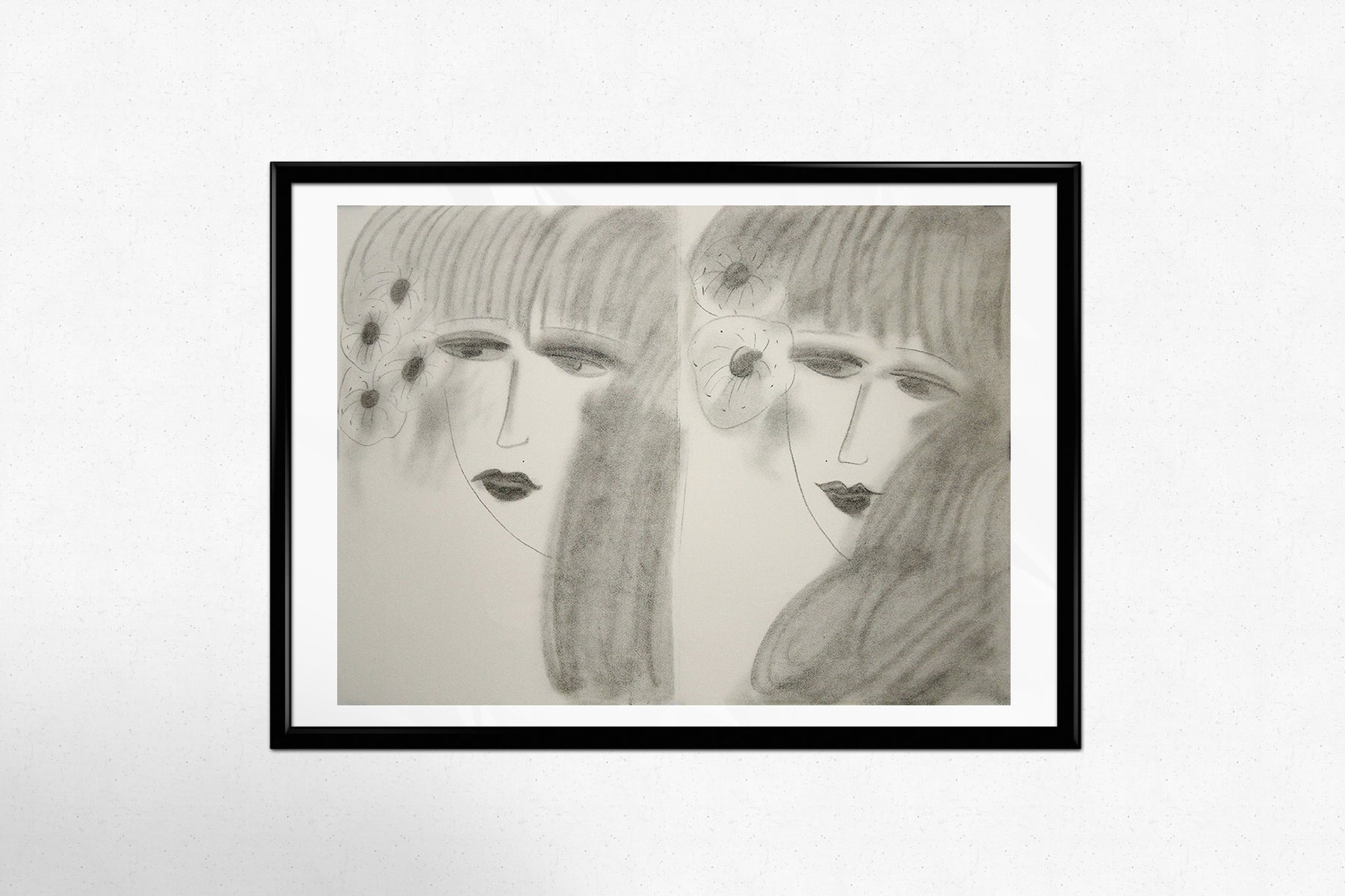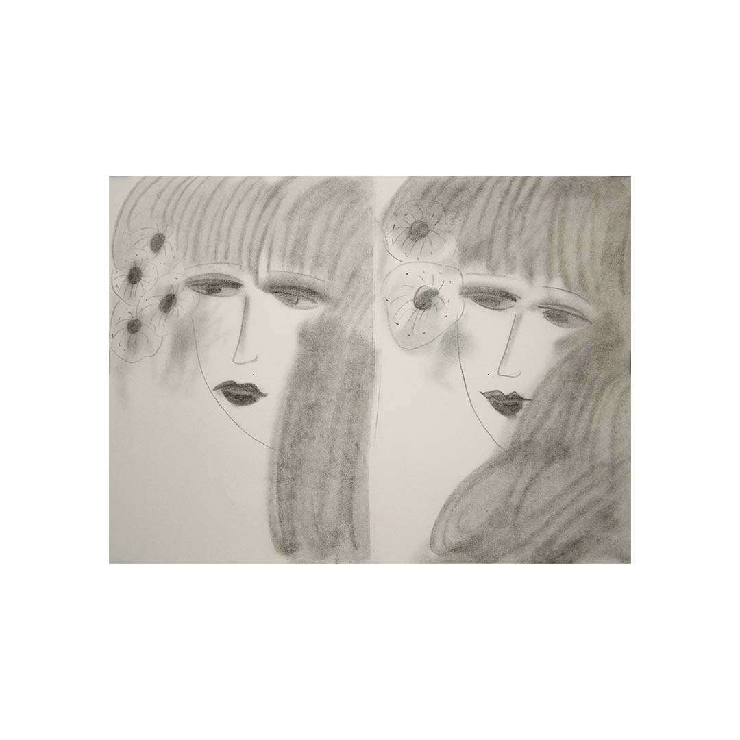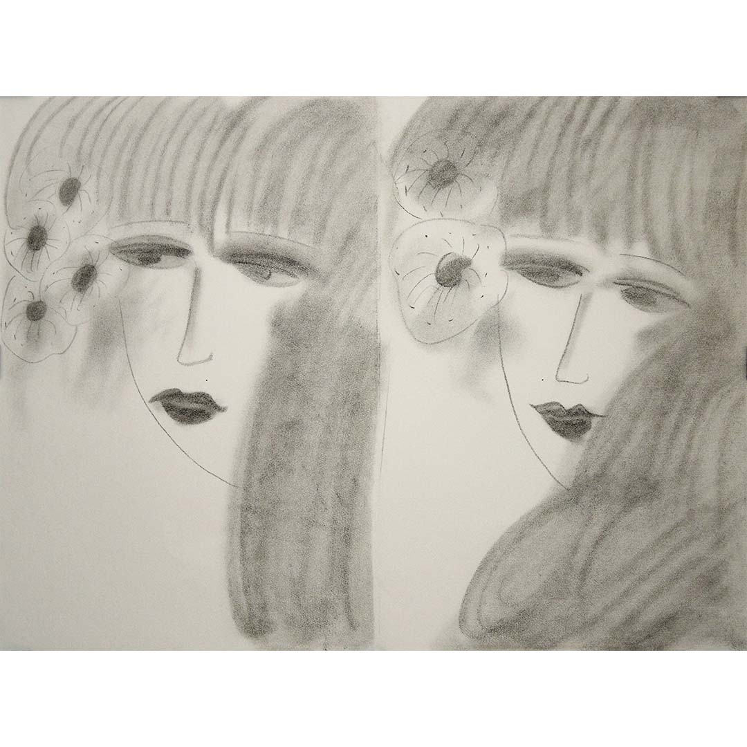 The piece presents two overlapping faces of a young woman, their melancholic gazes imbued with a quiet introspection. Softly shaded and delicately outlined, the composition feels almost weightless, as if the figures exist in a dreamlike state. The six flowers adorning their hair further enhance the sense of natural beauty and transience. Unlike Ting’s more vibrant, color-saturated works, this lithograph explores a subtler, more introspective side of his artistic vision, using soft tonal contrasts to evoke emotion.