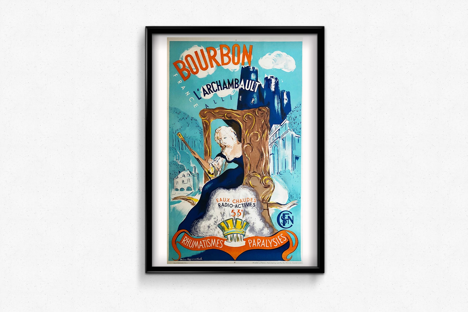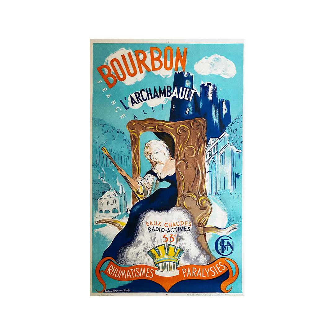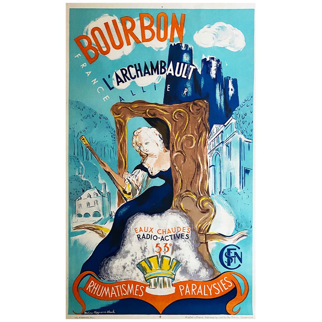 This lovely original poster was created by Ondine Magnard-Vlach π«π· (1904-1968), a French painter. Her work includes this beautiful poster commissioned by the SNCF in 1937. This original poster promotes Bourbon-L'Archambault, a spa town in the Allier region of France. People often went there to get rid of their ailments, almost by magic. The lovely play of complementary blue and orange colors gives this poster a wonderful luminosity.