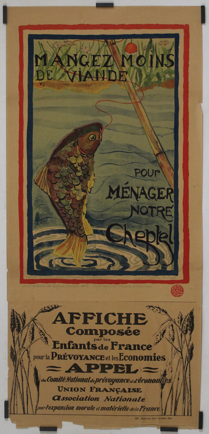 This 1918 original poster by Marthe Picard, titled "Mangez Moins de Viande" ("Eat Less Meat"), is a striking example of wartime propaganda and rationing campaigns during World War I. Designed with a blend of artistic charm and patriotic messaging, this rare piece calls on the French public to reduce meat consumption in order to preserve essential resources.