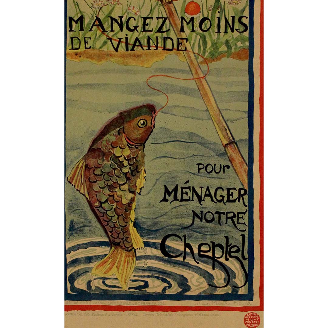 The hand-drawn illustration features a realistic fish caught on a fishing line, symbolizing a shift towards alternative food sources. The delicate watercolor style, vibrant blue and green hues, and rustic framing give the poster a folk-art quality, making it both visually appealing and historically significant.