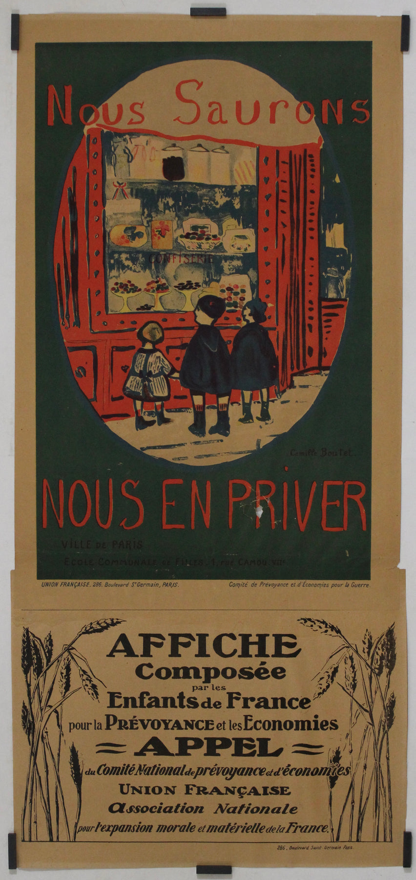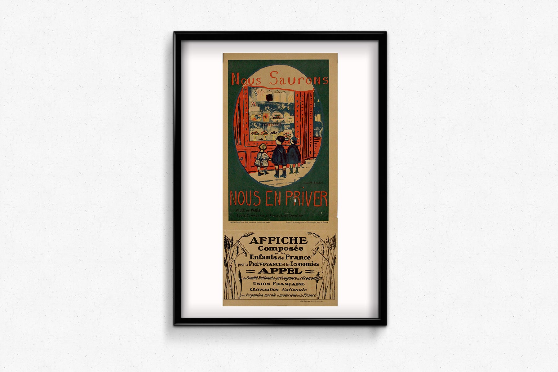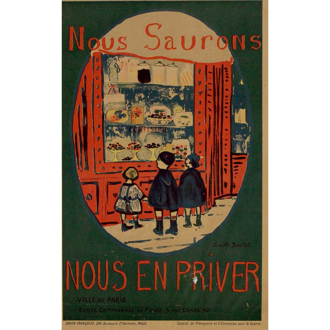This 1918 original poster by Camille Boutet, titled "Nous Saurons Nous en Priver" ("We Will Know How to Do Without"), is a striking piece of World War I propaganda, designed to encourage sacrifice and self-restraint for the war effort.
