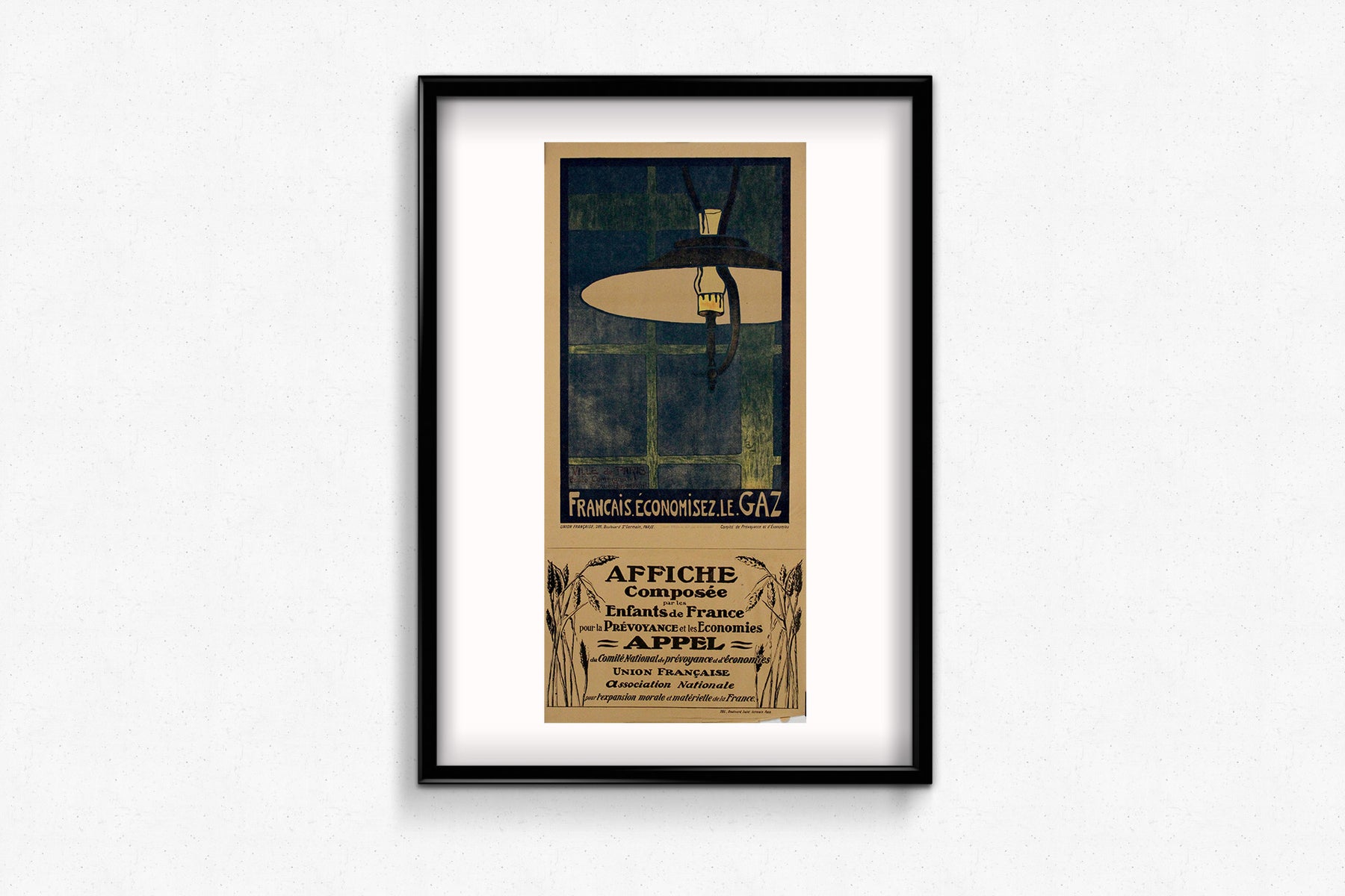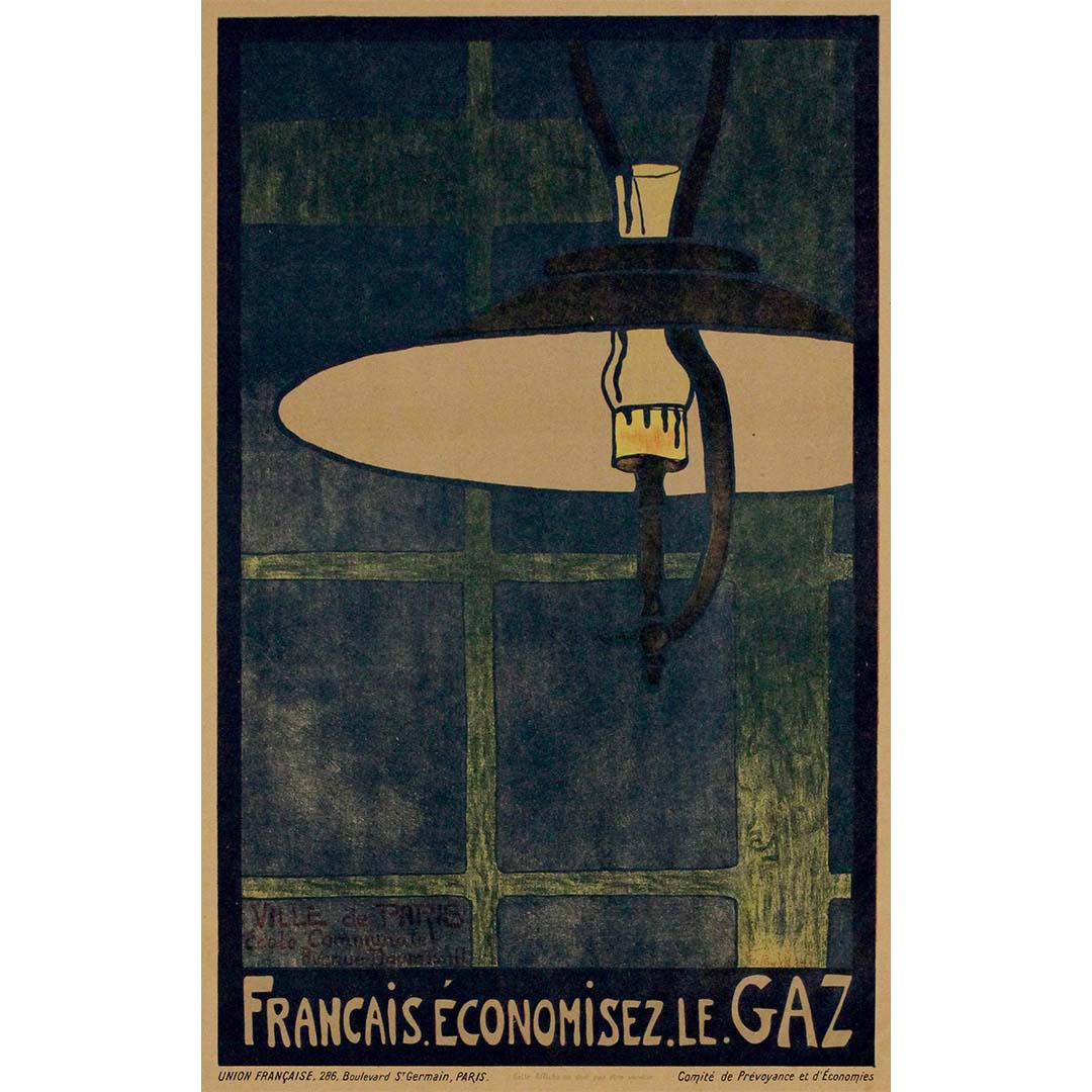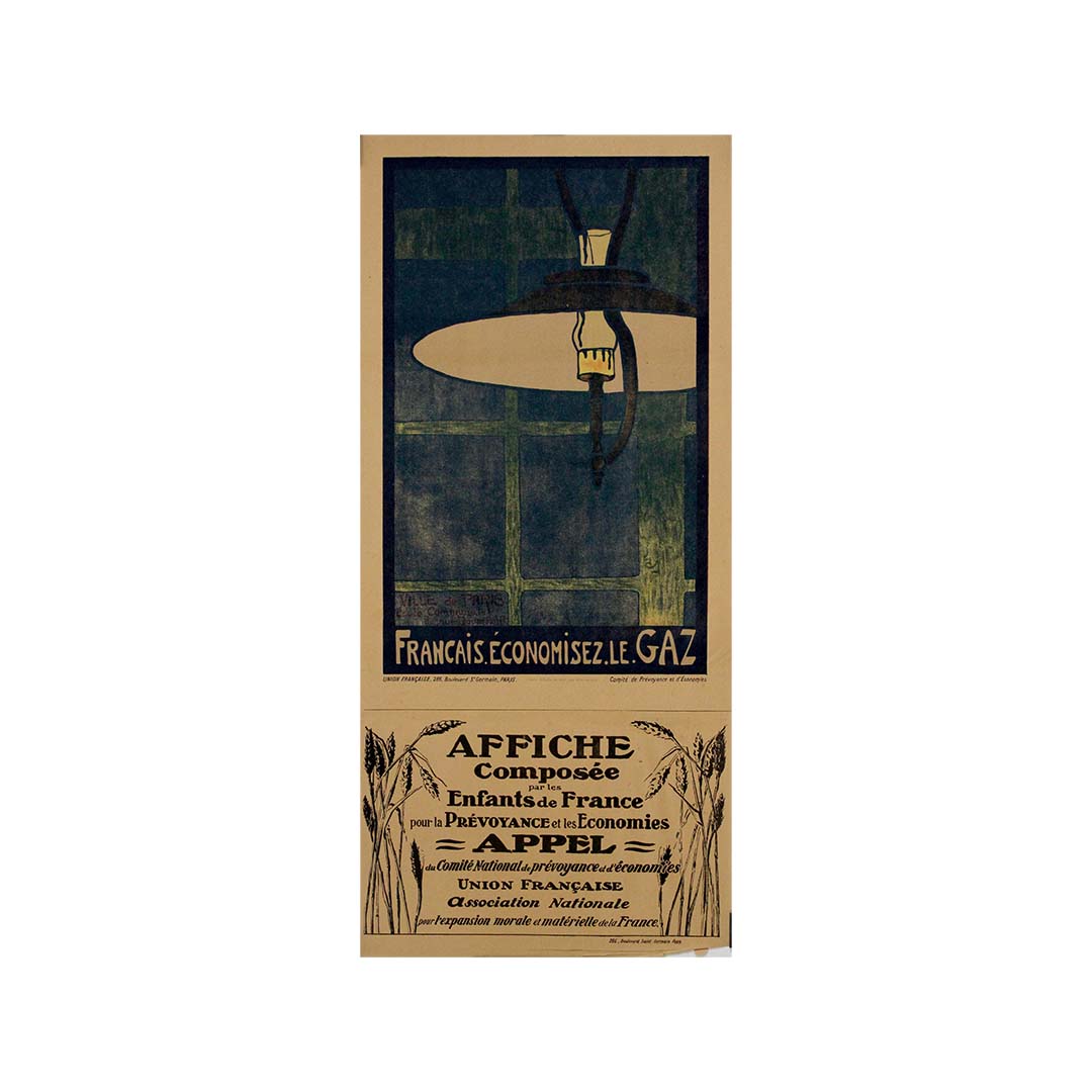 This 1918 original poster, designed by Jean Fapourhaux, is a striking piece of World War I propaganda urging the French population to conserve gas during wartime shortages. Created as part of a broader effort to encourage rationing and resourcefulness, it reflects the economic constraints and civilian sacrifices necessary to support the war effort.