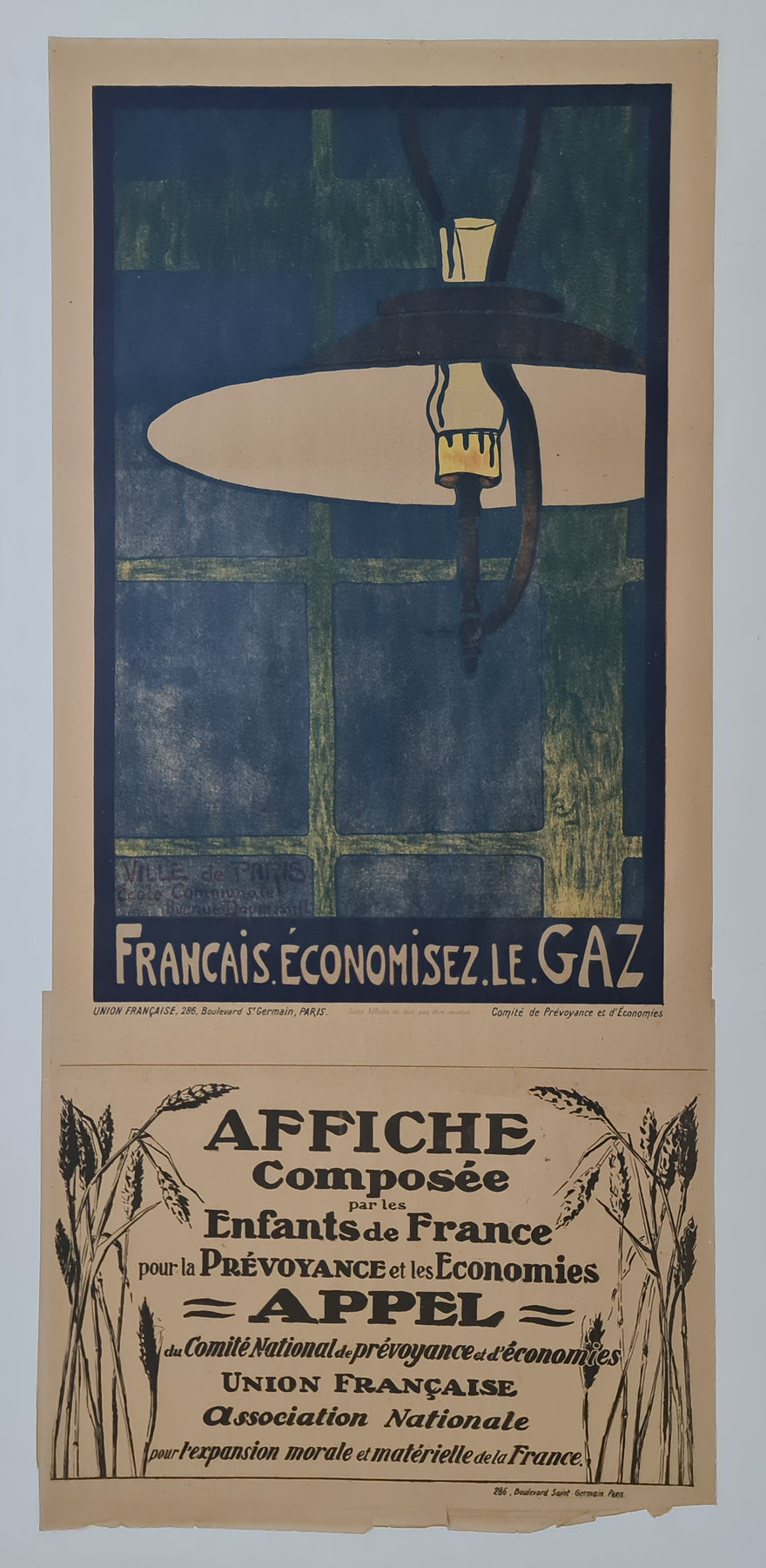 This poster is a rare and poignant example of WWI-era French propaganda, highlighting the home front's role in the war effort. Its minimalist yet evocative design makes it a powerful historical artifact, appealing to collectors interested in wartime conservation, early 20th-century French graphic design, and the social impact of WWI on daily life.