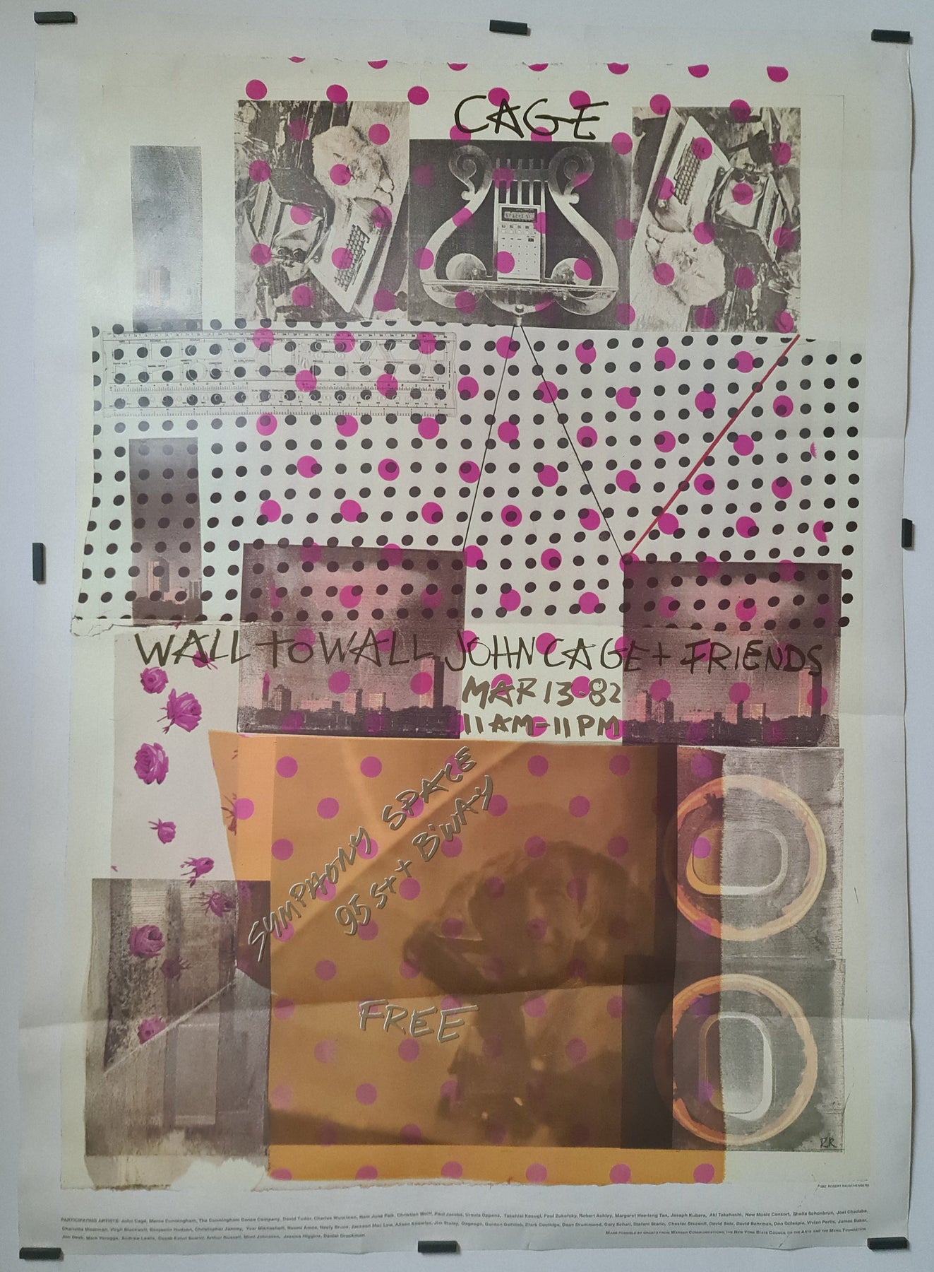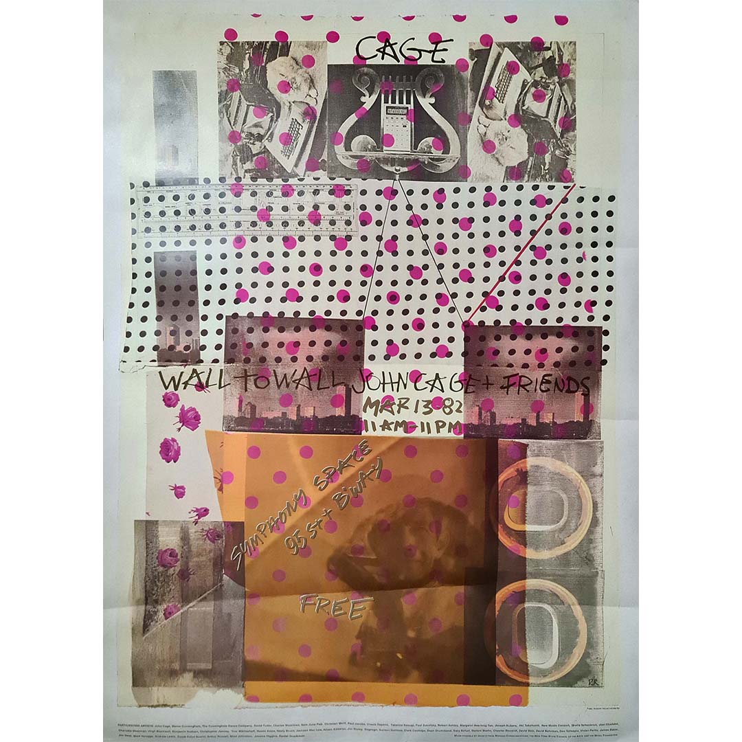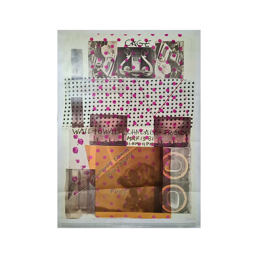 Beautiful poster created for a twelve-hour event at Symphony Space in New York on March 13, 1982, from 11 am to 11 pm. Participants included John Cage, Robert Rauschenberg, Merce Cunningham and the Merce Cunningham Dance Company, Alison Knowles, Charlotte Moorman, David Tudor, Clark Coolidge, Jackson Mac Low, Arthur Russell, Mimi Johnson, Nam June Paik, Christian Wolff, Ursula Oppens, Paul Zukofsky, Margaret Hee-leng Tan, and many others.
