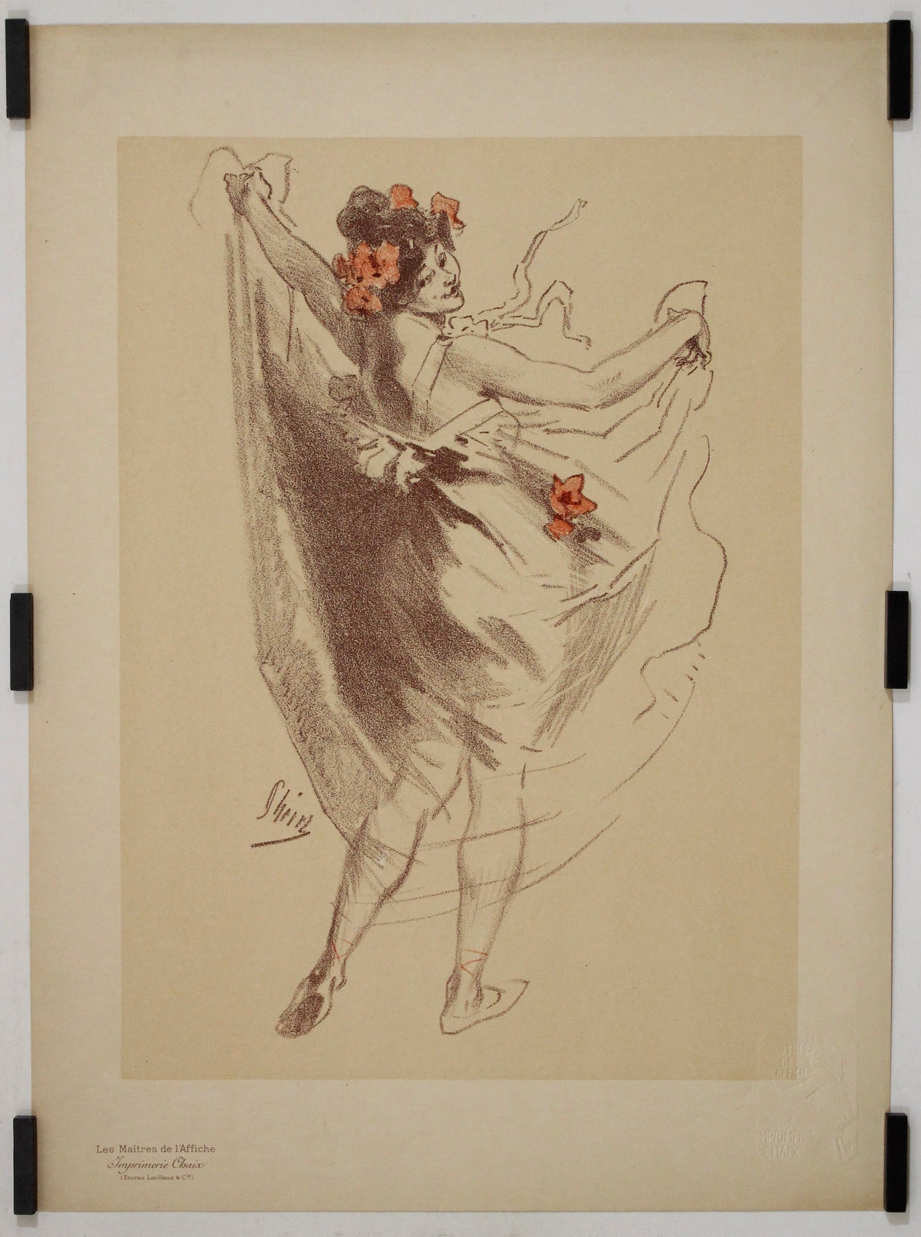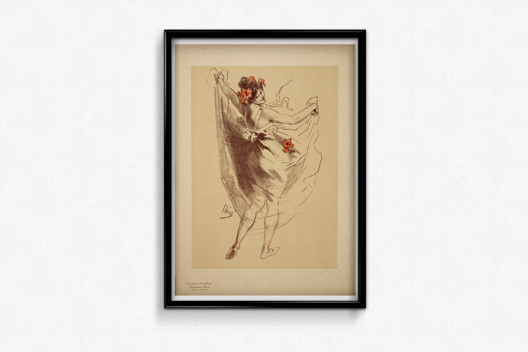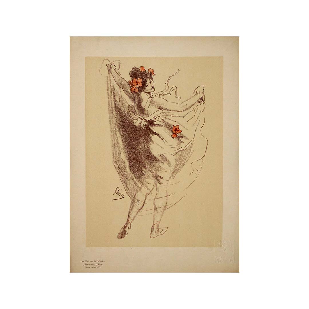 Created in 1898 as the very first supplement to Les Maîtres de l’Affiche, this intimate lithograph distills Jules Chéret’s vision of Belle Époque Paris into a single, buoyant figure. Titled La Danse, it shows a young performer caught mid-turn, lifting her gauzy skirt as orange blossoms flicker at her hair and hip. Chéret draws the body with swift, economical strokes, letting washes of warm sepia carry the motion, then punctuates the image with small sparks of color to keep the eye moving.