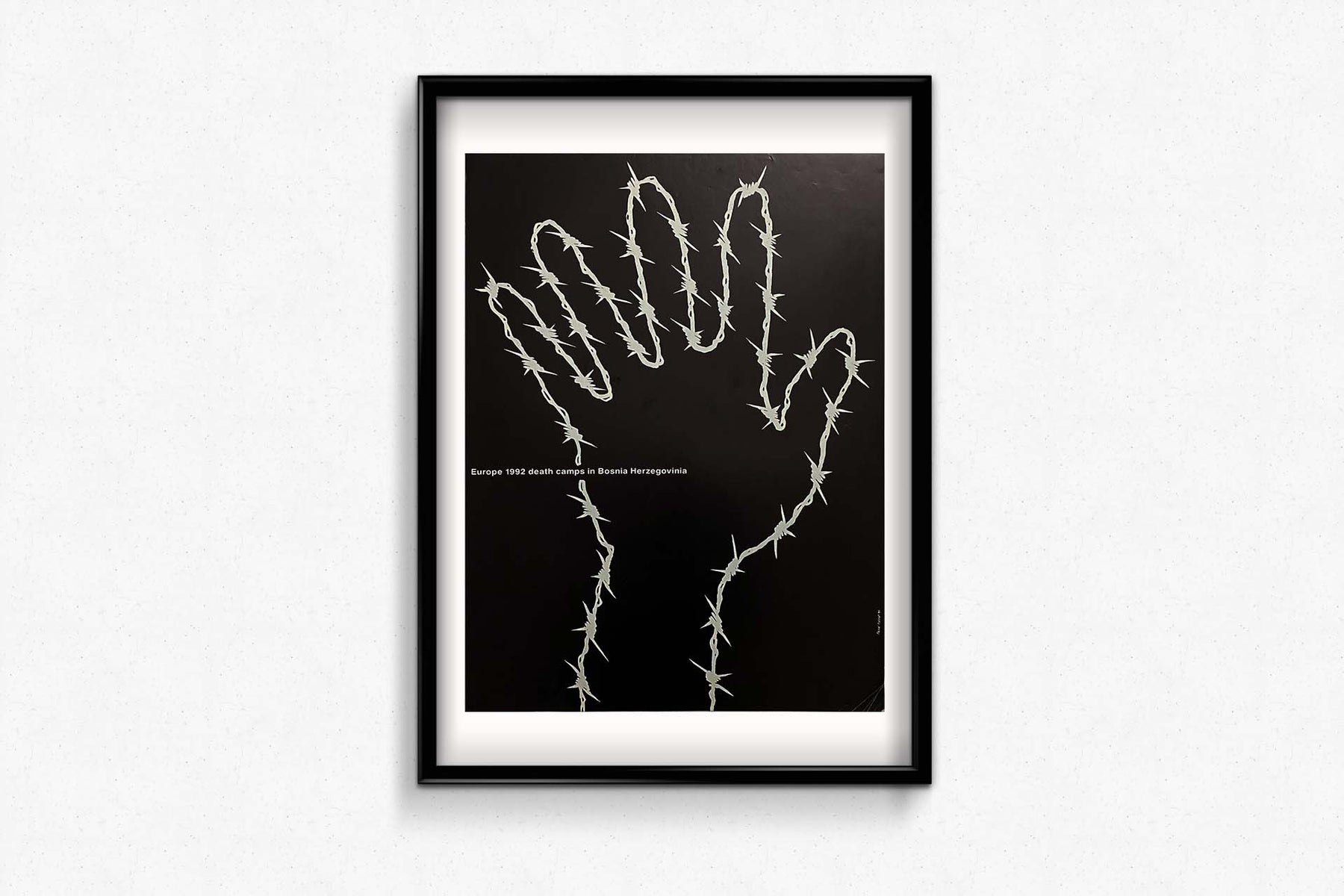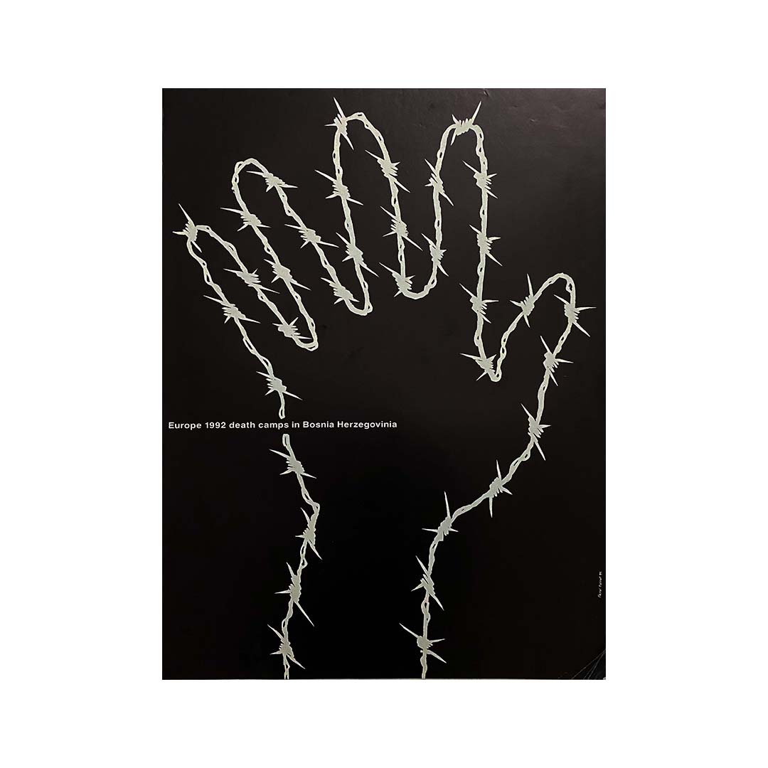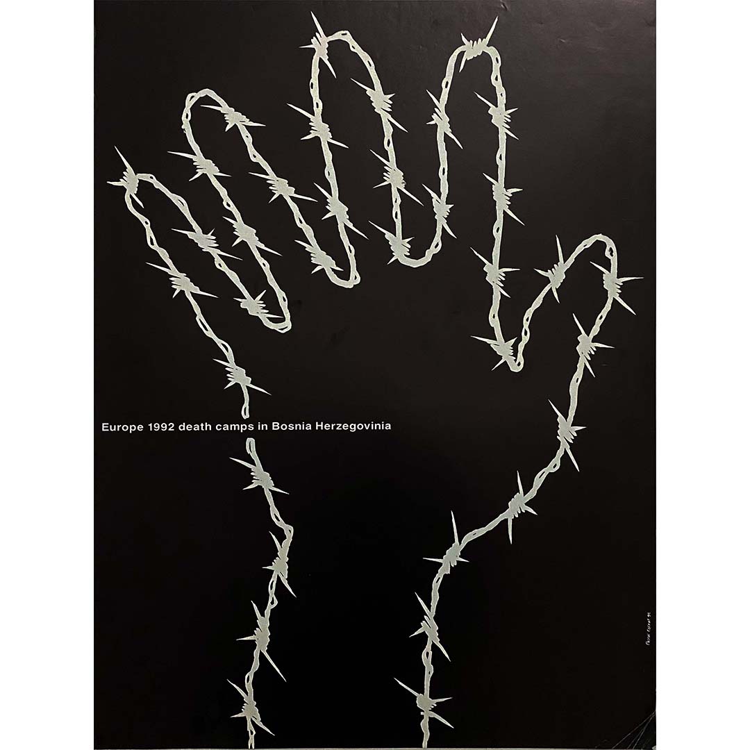 This original poster denounces the atrocities of the war in Bosnia-Herzegovina. It intervenes in a context of national disarray when the existence of a concentration camp in Omarska (Bosnia) was revealed to public opinion.