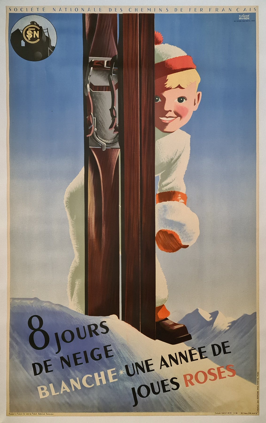 This 1938 original travel poster, designed by Roland Hugon, was commissioned by the Société Nationale des Chemins de Fer Français (SNCF) to promote winter sports tourism in France. With its charming Art Deco aesthetic and inviting imagery, the poster encourages families to embrace the joys of skiing and the benefits of fresh mountain air.