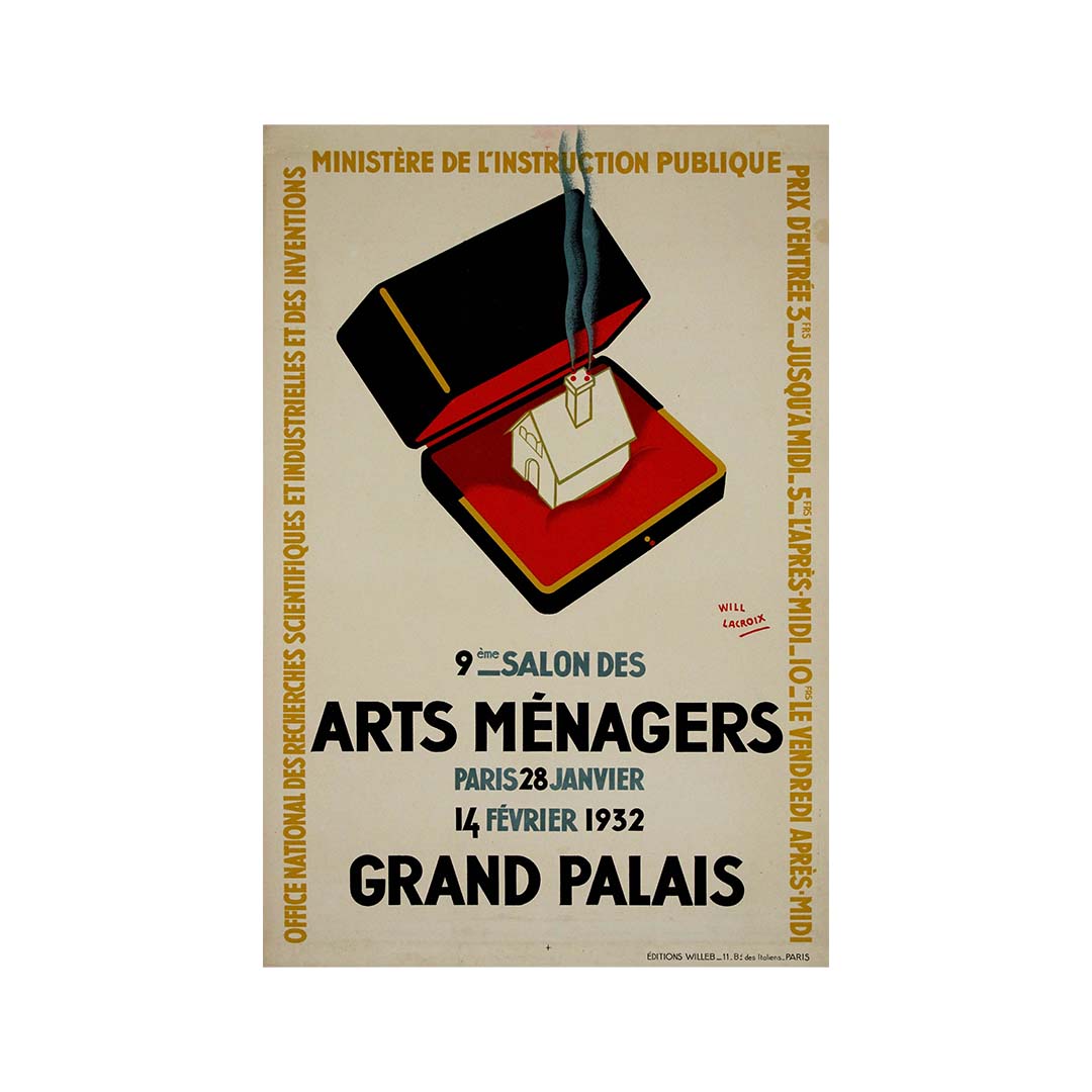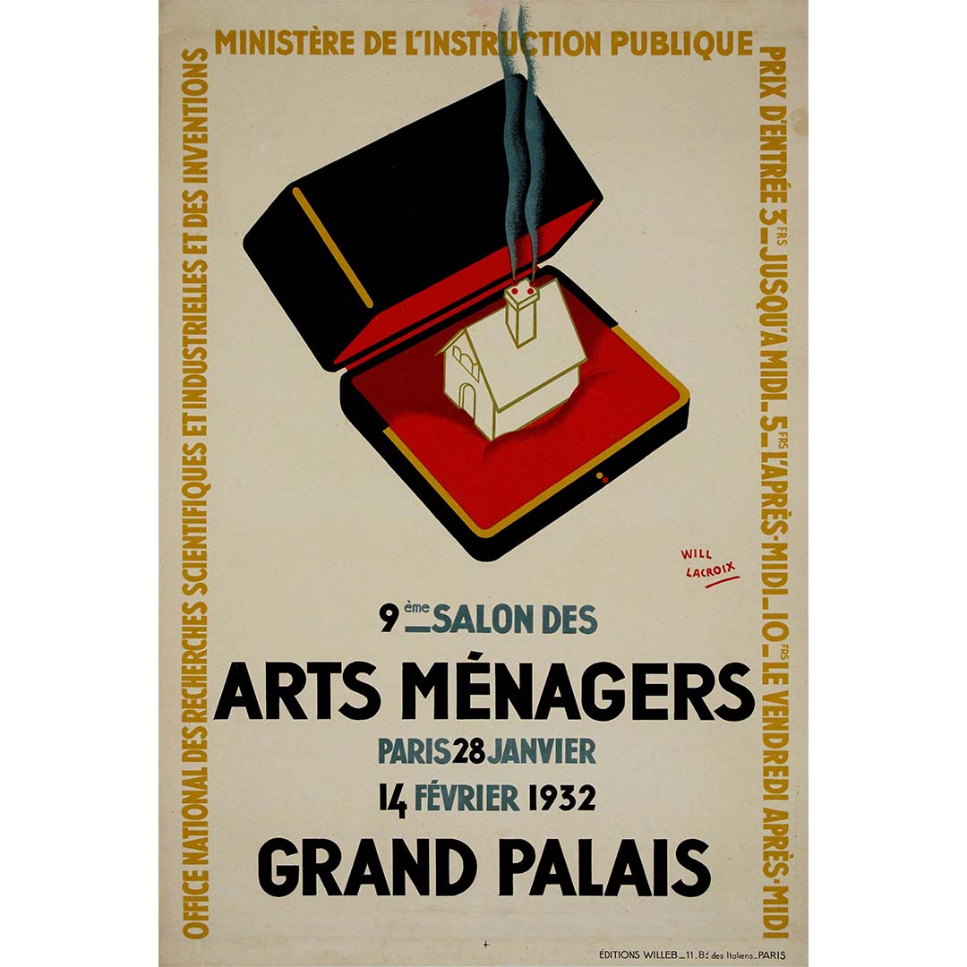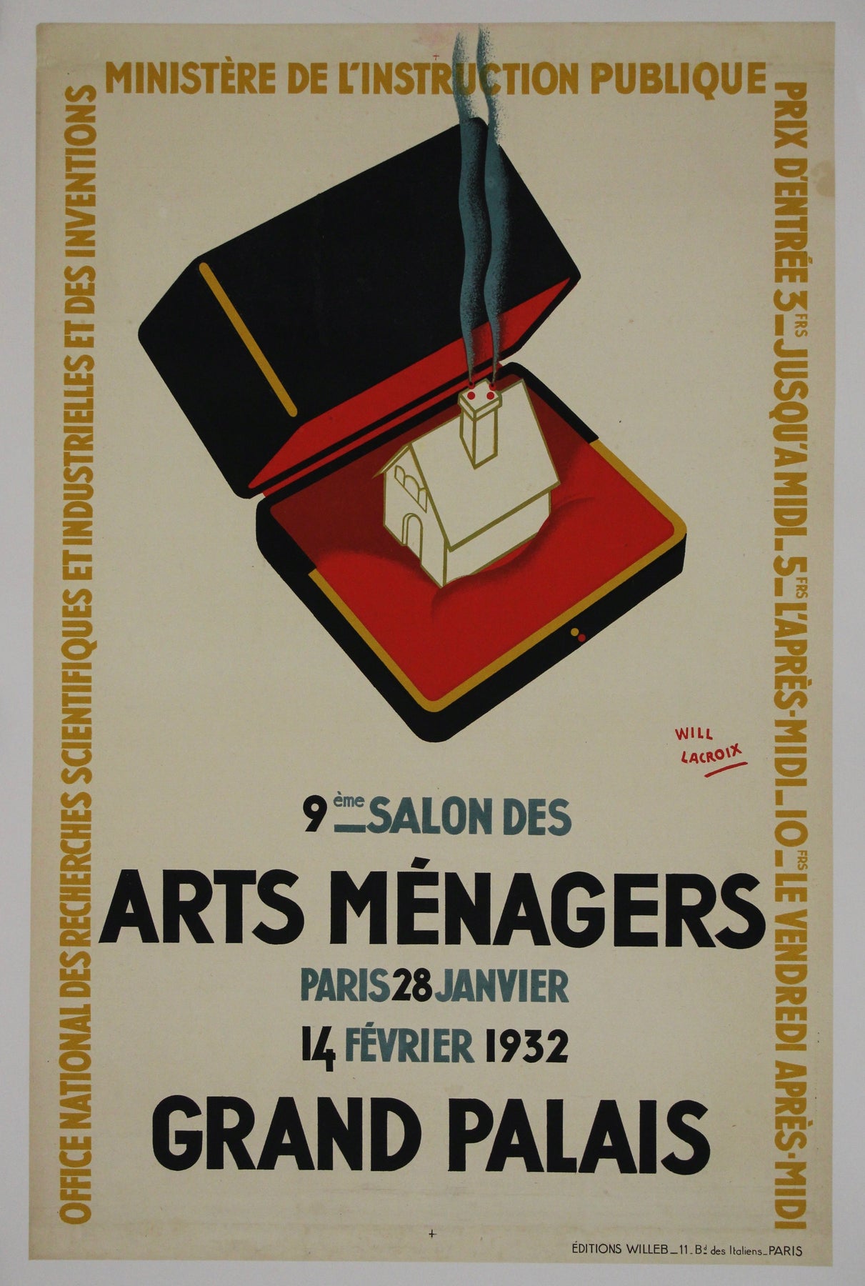 The original 1932 poster by Will Lacroix for the 9th Salon des Arts Ménagers at the Grand Palais, organized by the Office National des Recherches Scientifiques et Industrielles et des Inventions, epitomizes the artistic and industrial fervor of the interwar period in France.