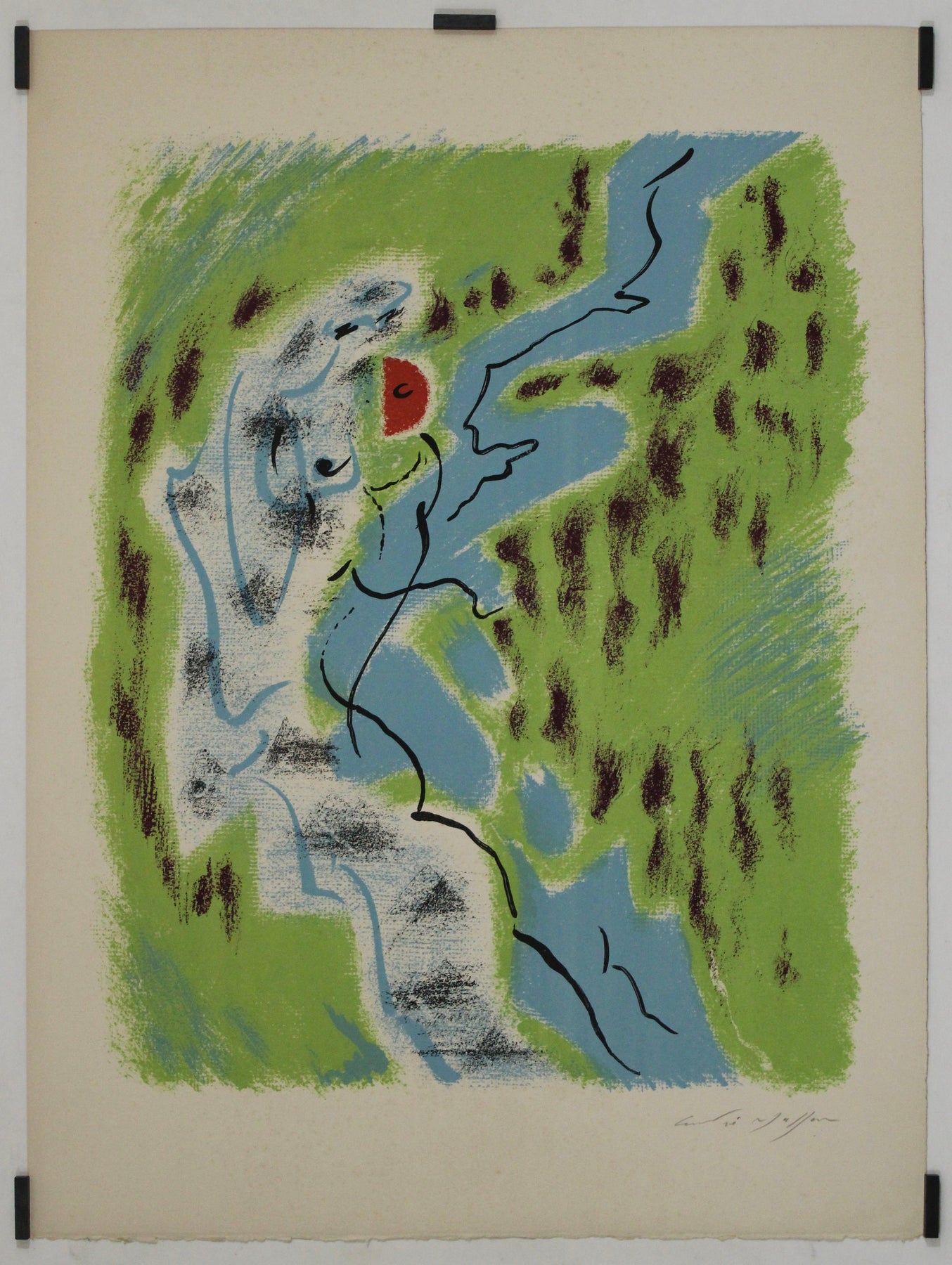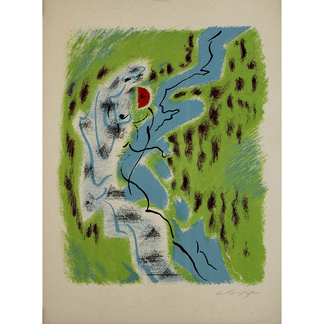 Far more than a promotional piece, this work was hand-signed by Masson himself, asserting its place as a true collectible—an artwork in its own right. Produced at the legendary Atelier Mourlot, the lithograph captures Masson's distinctive flow of automatist linework, overlaid on a lush field of green and blue, with accents of deep crimson that evoke emotional and subconscious undercurrents.