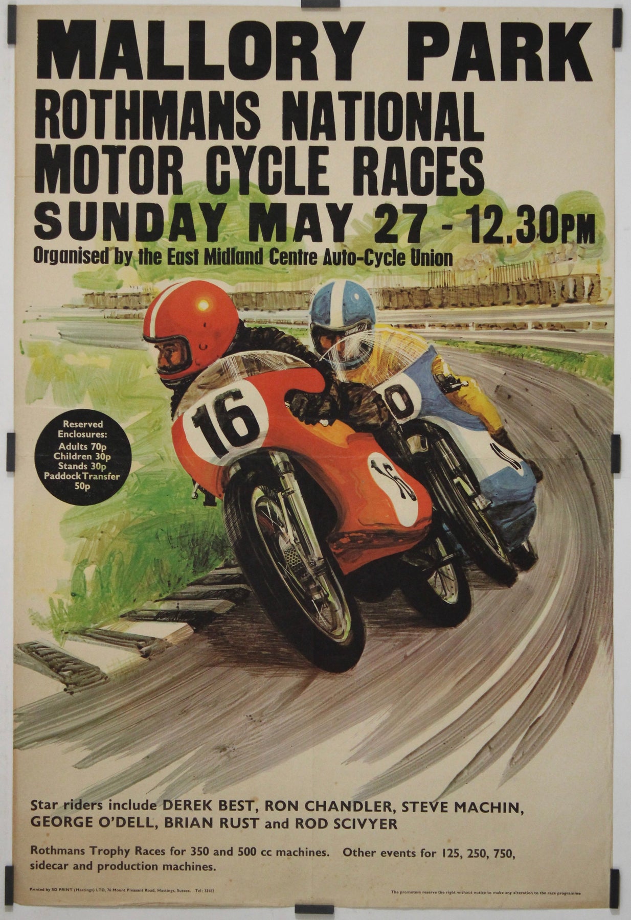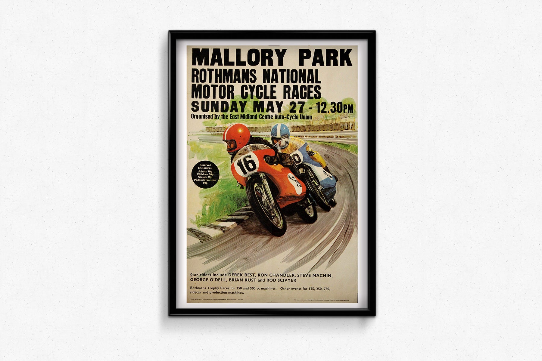 Typography plays a key role: the large, block lettering announcing “Mallory Park – Rothmans National Motor Cycle Races” dominates the upper portion of the poster, immediately establishing both the prestige of the venue and the prominence of the sponsor. Below, practical details about the date, organization, and star riders anchor the image in a real sporting context, bridging graphic impact with factual information.