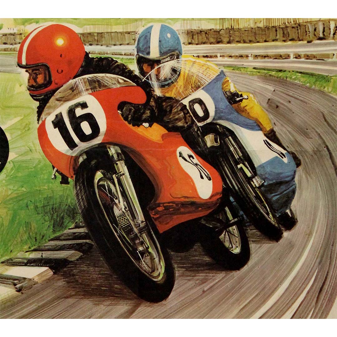 Today, this poster stands as a vivid document of classic motorcycle racing culture. It evokes an era when motorsport was both a popular pastime and a powerful visual subject, and when advertising art transformed speed, sound, and adrenaline into a single, compelling image meant to stop passers-by in their tracks.
