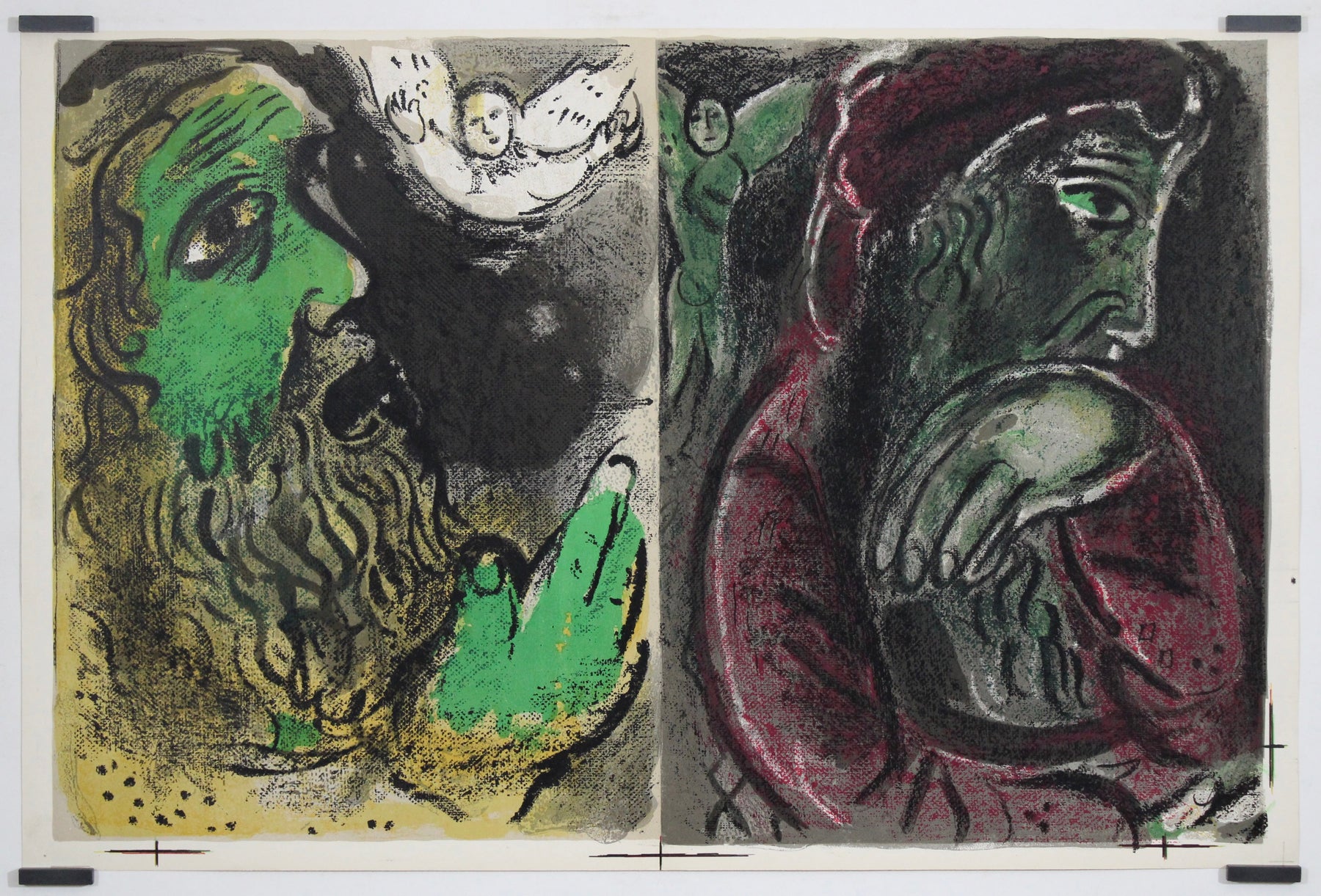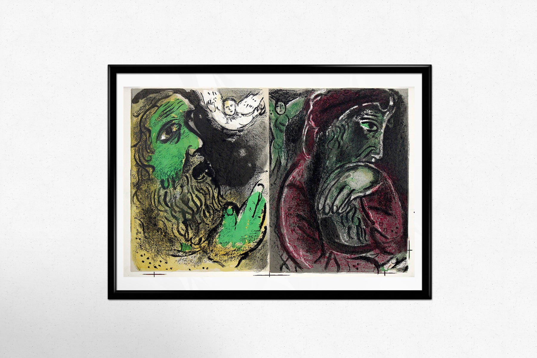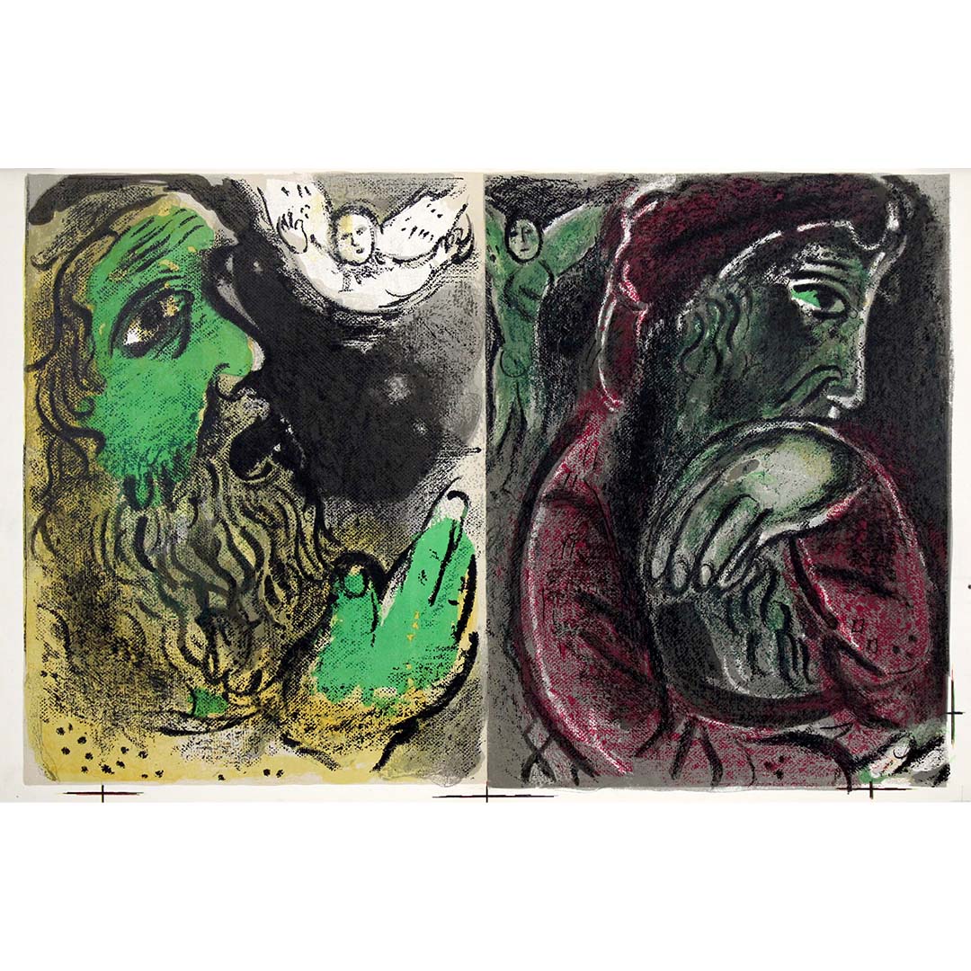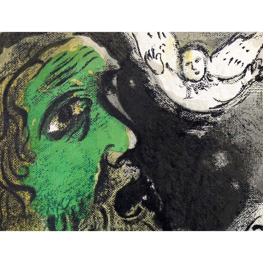 Chagall’s expressive use of color heightens the emotional polarity. Deep greens, reds, and blacks intensify the psychological drama. The layered lithographic textures — rich with crayon-like strokes and velvety shadows — give the work a tactile immediacy. Rather than illustrating scripture literally, Chagall translates spiritual experience into emotional color and symbolic form.