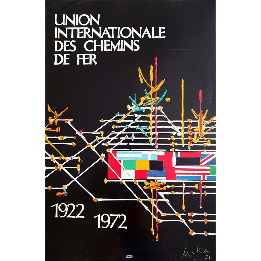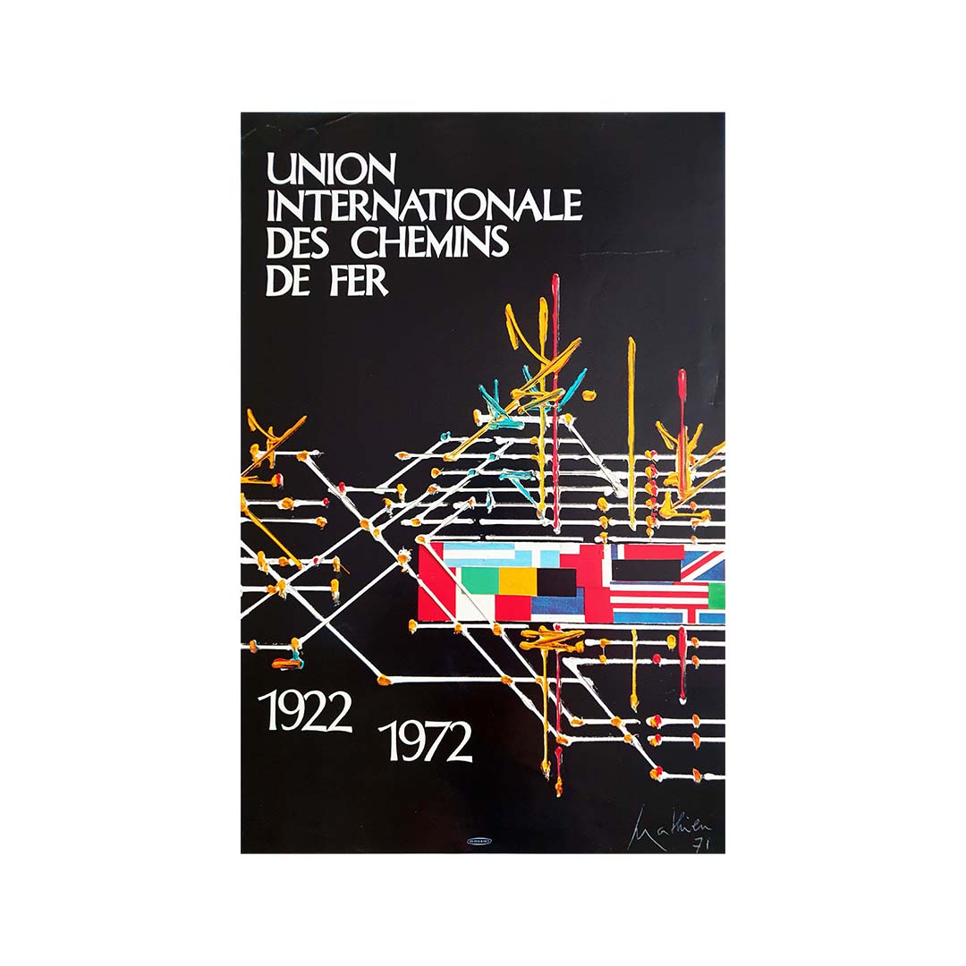 En conclusion, l'affiche originale de Mathieu, réalisée en 1971 pour l'exposition de l'Union Internationale des Chemins de Fer, témoigne du talent artistique et de l'esprit d'innovation propres au monde ferroviaire. Cette affiche continue de fasciner, invitant à découvrir la beauté et la portée du voyage en train, symbole de connectivité et de progrès à l'échelle mondiale.