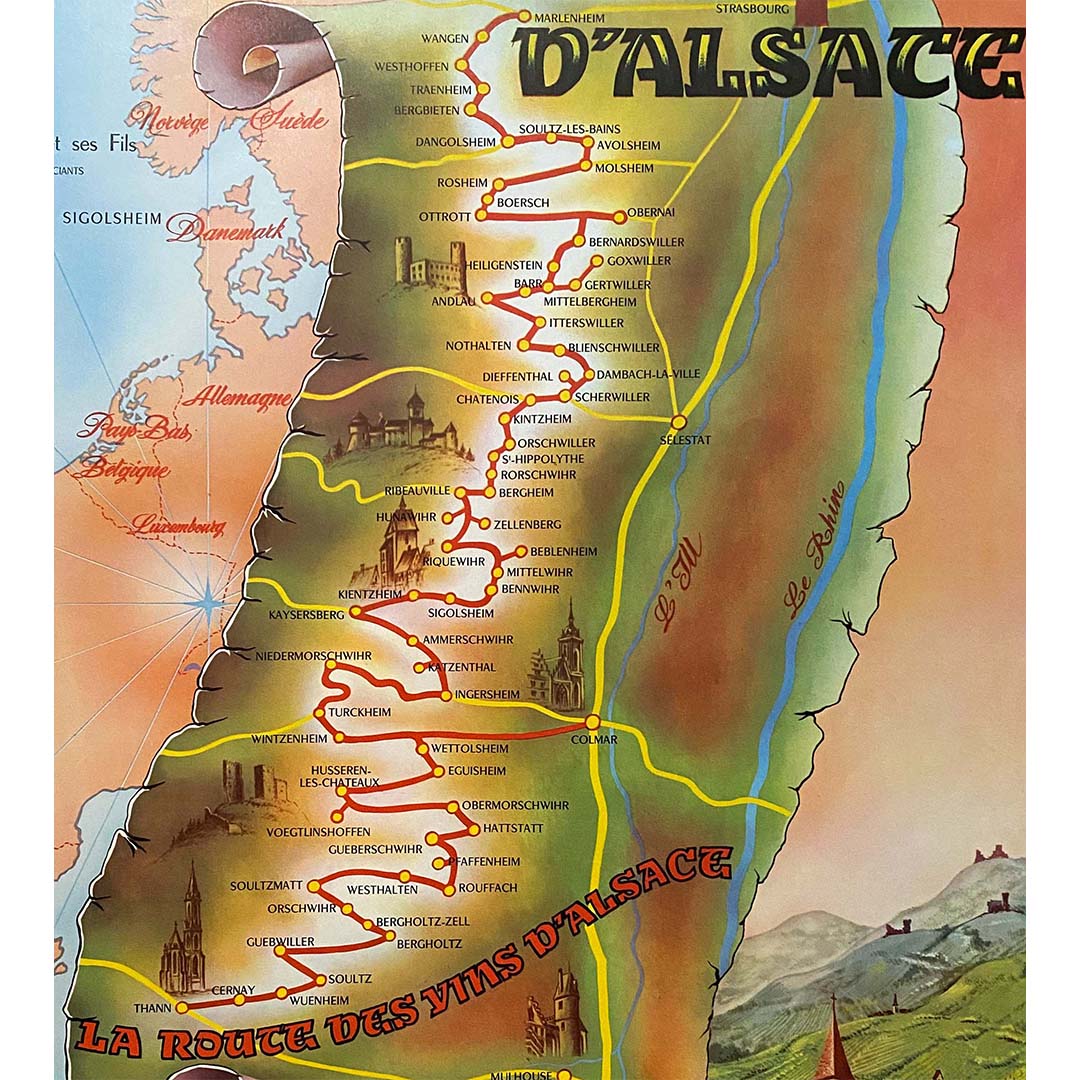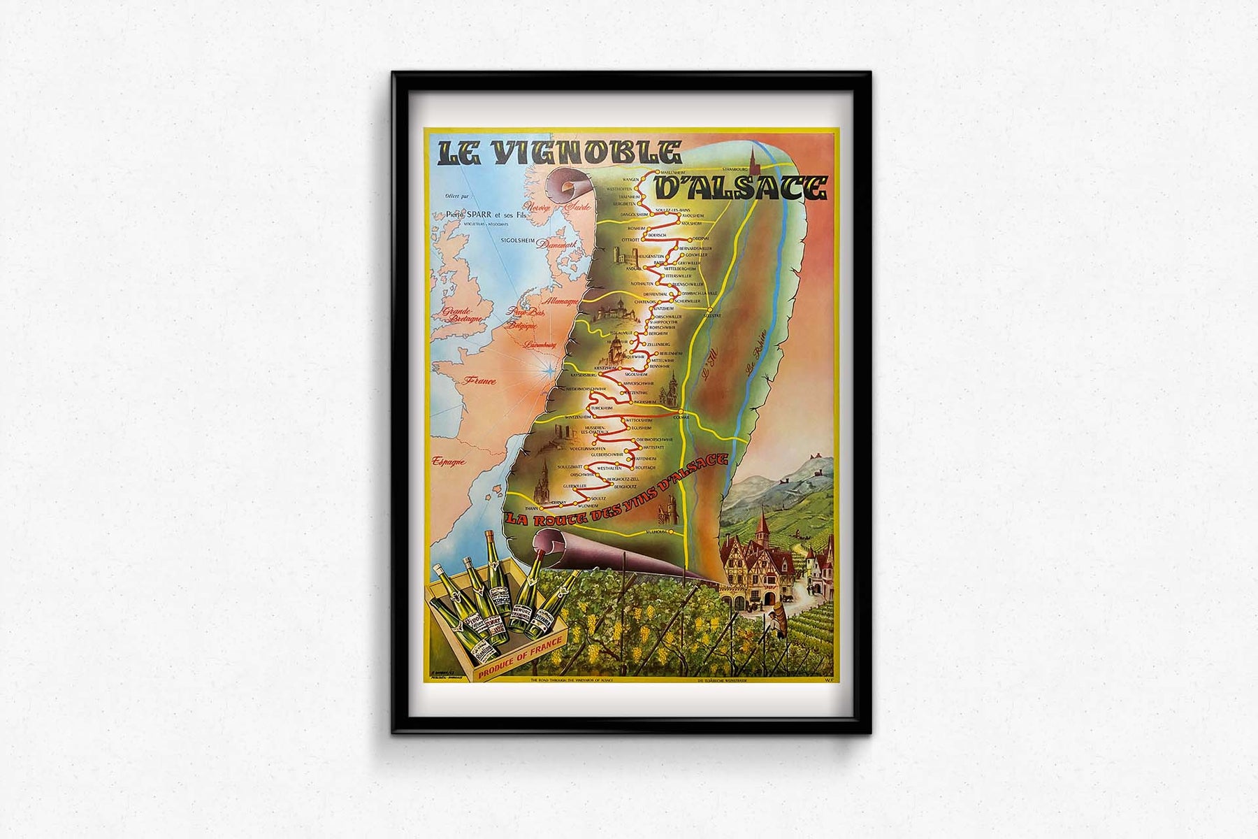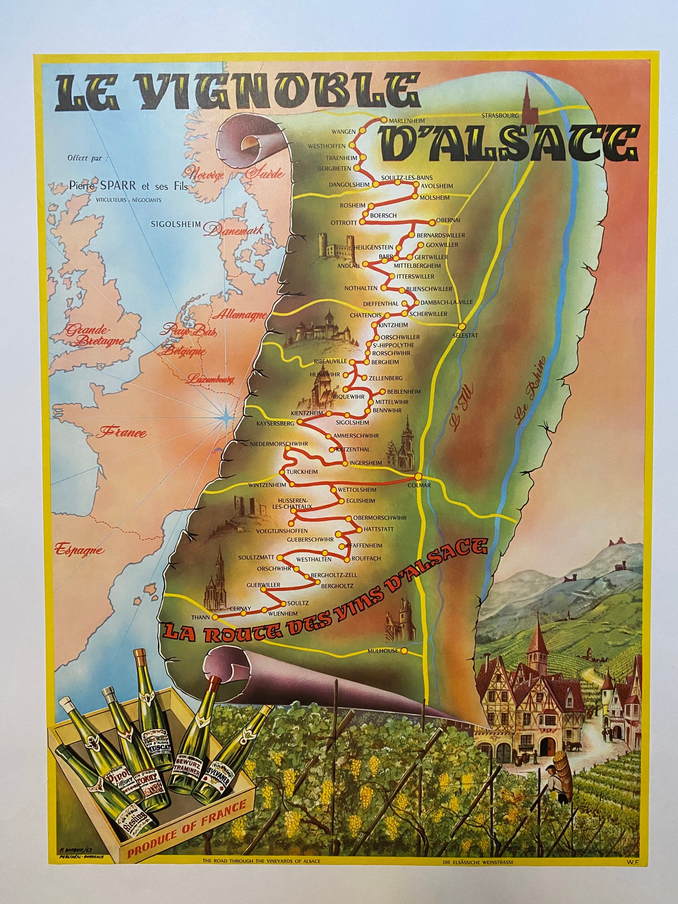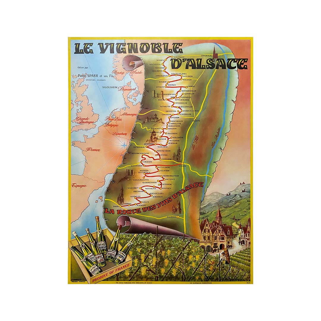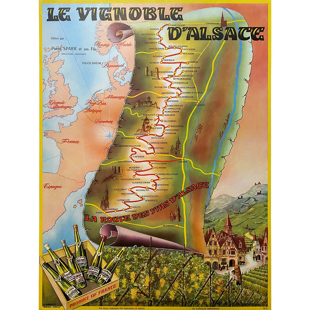 L'affiche originale de P. Barbier, datant de 1963 et faisant la promotion du « Vignoble d'Alsace, la Route des Vins d'Alsace », est une invitation pittoresque à découvrir le riche patrimoine viticole et la beauté des paysages de cette région française renommée. Créée pour promouvoir la Route des Vins d'Alsace, cette affiche est bien plus qu'un simple support publicitaire : elle incarne l'essence même de la tradition, de la culture et du plaisir de la découverte œnologique.