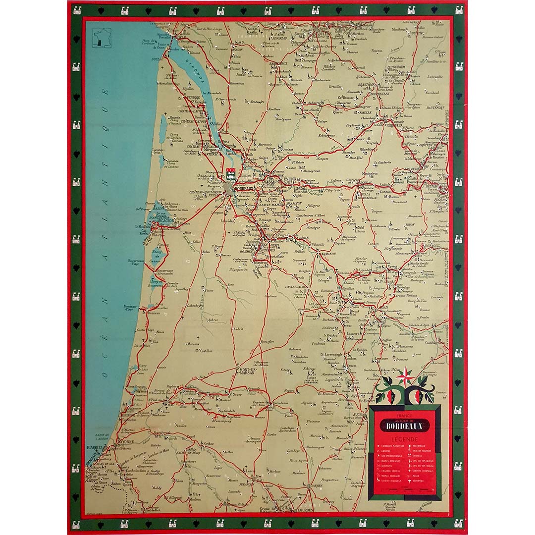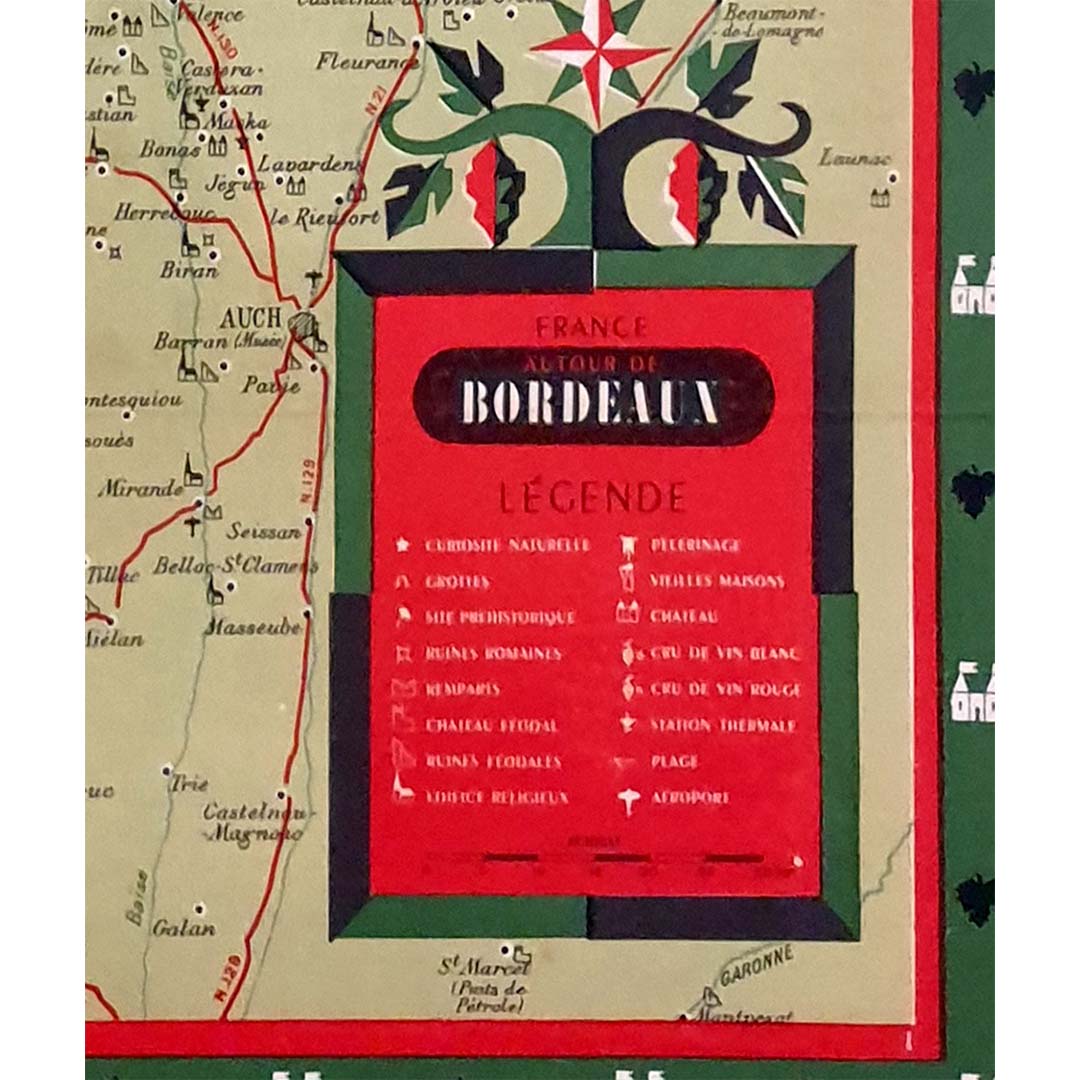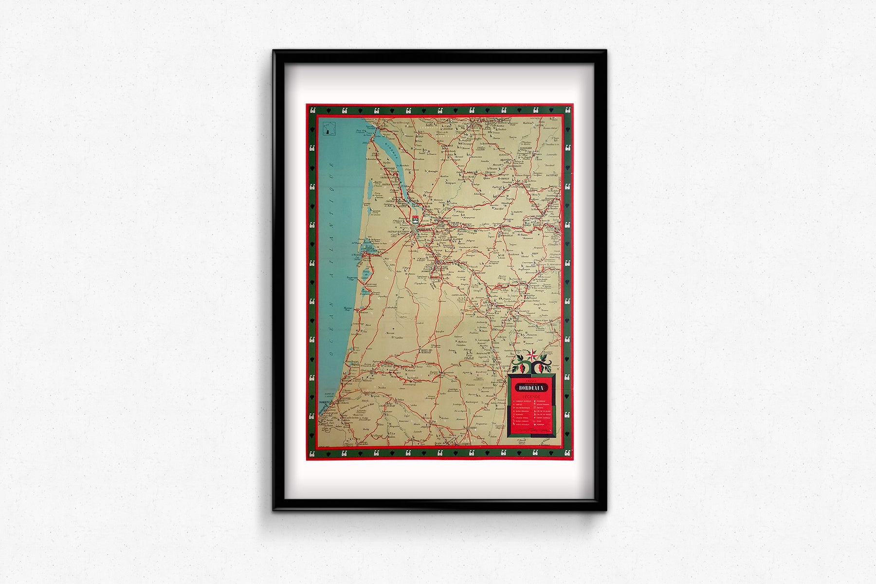 Reflet du style artistique du milieu du XXe siècle, cette carte allie fonctionnalité et esthétique, offrant une immersion dans le lieu et mettant en valeur la beauté et l'importance de Bordeaux et de ses environs. Elle constitue un précieux témoignage historique et un objet de collection pour tout passionné de géographie française, de patrimoine régional et de design des années 1950.