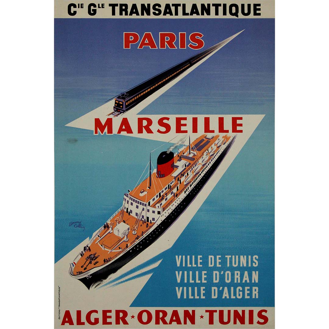 Cette affiche de voyage originale d'Édouard Collin pour la Compagnie Générale Transatlantique invite les voyageurs à découvrir les destinations enchanteresses de Paris, Marseille, Alger, Oran et Tunis. Avec ses couleurs éclatantes et ses images captivantes, elle capture le charme des voyages en Méditerranée au milieu du XXe siècle.