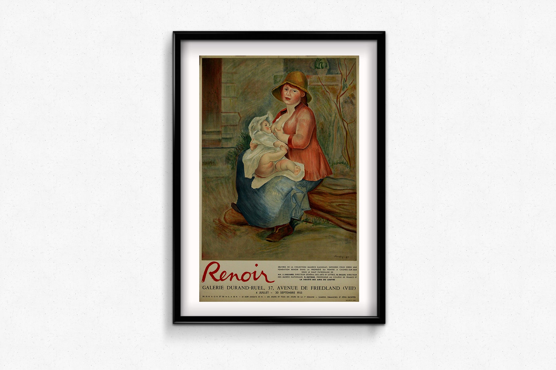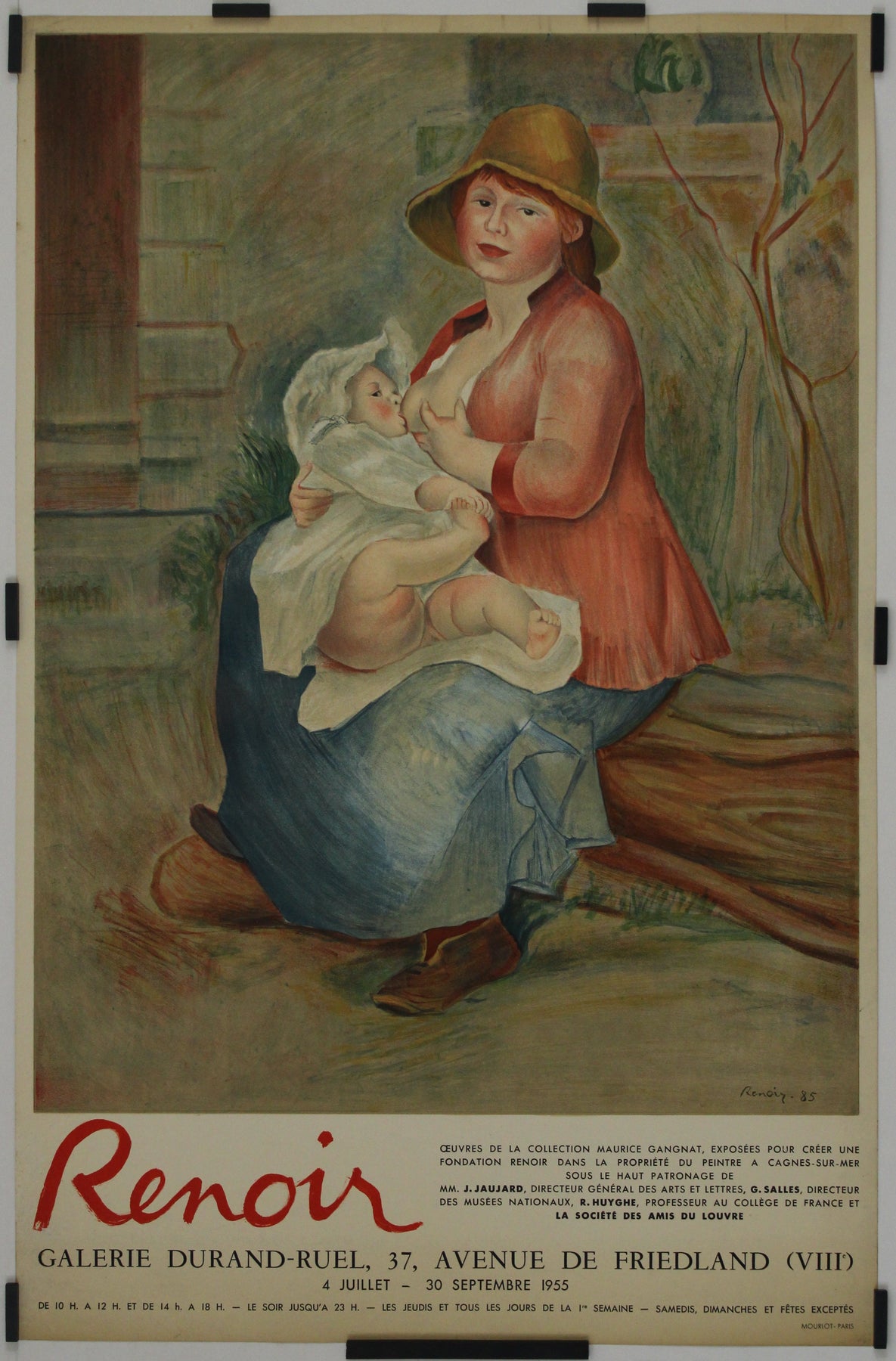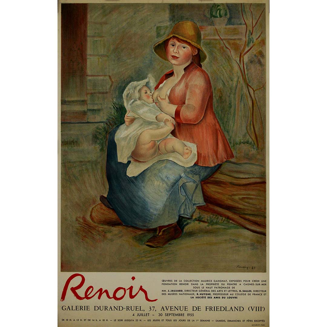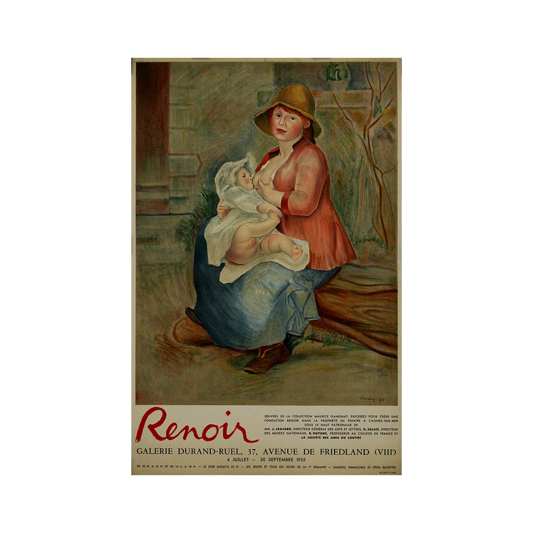 Cette tendre affiche d'exposition de 1955 présente Mère donnant le sein de Pierre-Auguste Renoir. Reproduite pour la Galerie Durand-Ruel, elle annonçait une importante exposition d'œuvres de la collection Maurice Gangnat. Organisée du 4 juillet au 30 septembre 1955, cette exposition, qui réunissait des œuvres destinées à constituer le noyau de la future Fondation Renoir à Cagnes-sur-Mer, fut un moment culturel majeur.