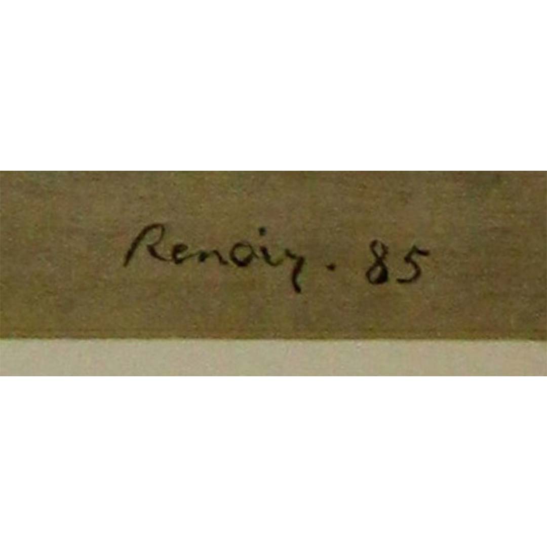 L'œuvre elle-même est un exemple intime et lumineux du style de la maturité de Renoir, célébrant le thème intemporel de la maternité. Une jeune mère, assise dans une simplicité rustique, regarde au loin avec une force tranquille tout en allaitant son enfant. La scène est rendue dans des tons doux et enveloppants de rose, de bleu et d'ocre, la touche caractéristique de Renoir créant une impression de chaleur et de sérénité. Le visage de la mère, rond et serein, fait écho à la plénitude et à la tendresse qui définissaient les portraits de femmes de la dernière période de Renoir. L'enfant, blotti dans un tissu doux et au creux de son bras, rayonne de l'innocence de la petite enfance, faisant du tableau une douce ode aux soins maternels.