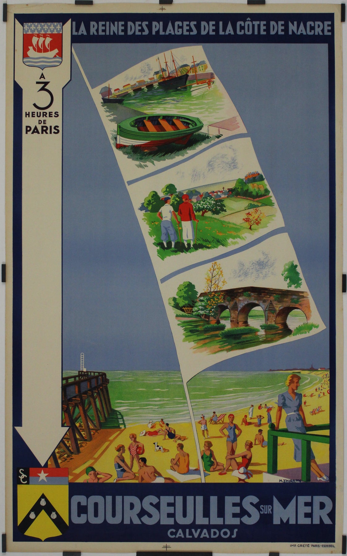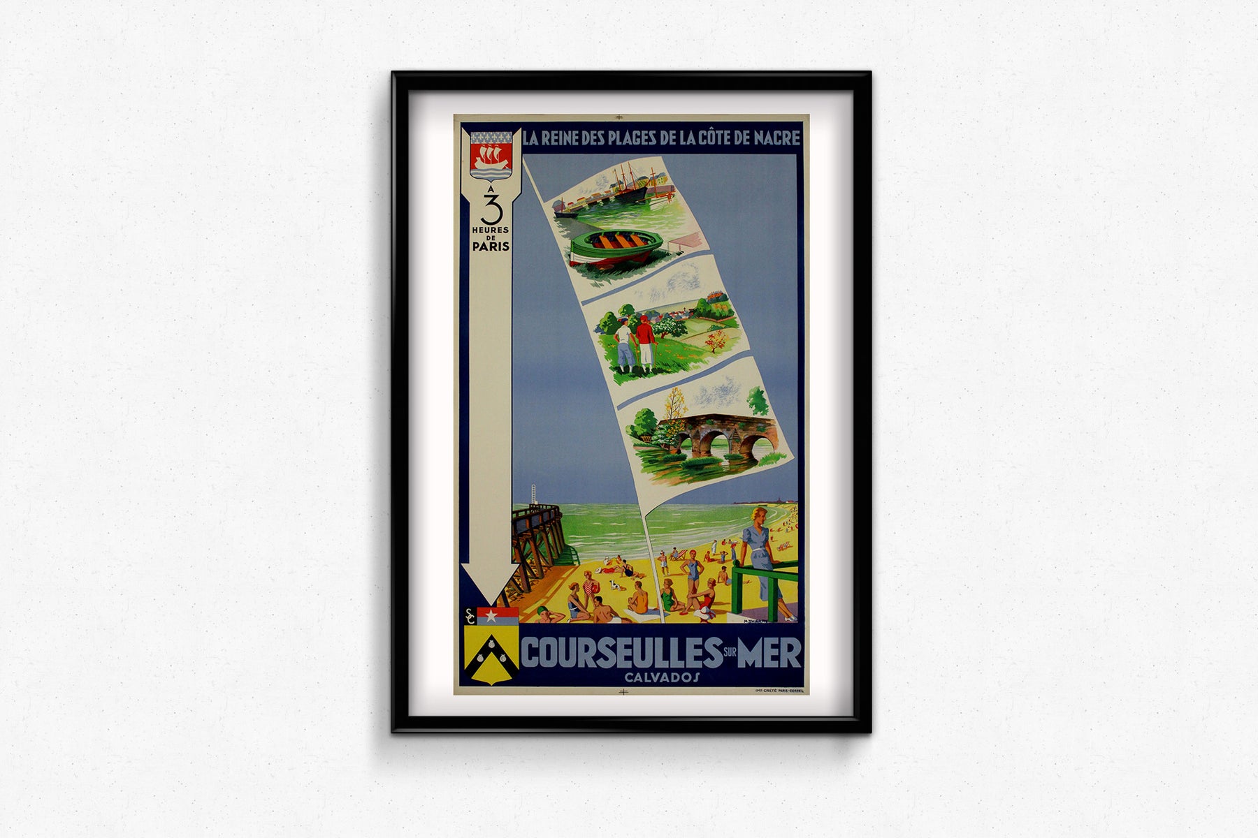 Cette affiche de voyage originale et colorée du début des années 1930, illustrée par M. Thierry, célèbre avec nostalgie la station balnéaire de Courseulles-sur-Mer, située sur la Côte de Nacre, dans le Calvados en Normandie. Avec sa palette joyeuse et ses images idylliques, elle était conçue pour inciter les Parisiens à s'offrir une escapade au bord de la mer, à seulement trois heures de la capitale.