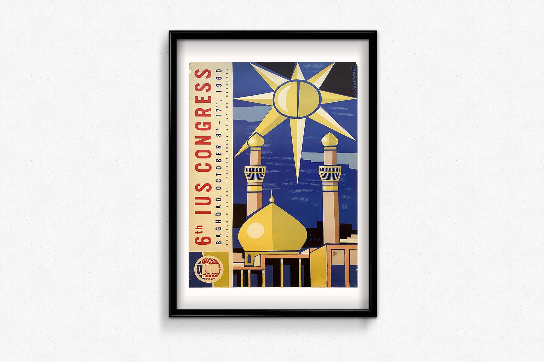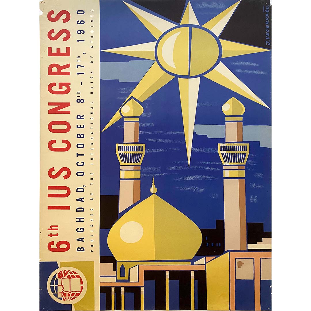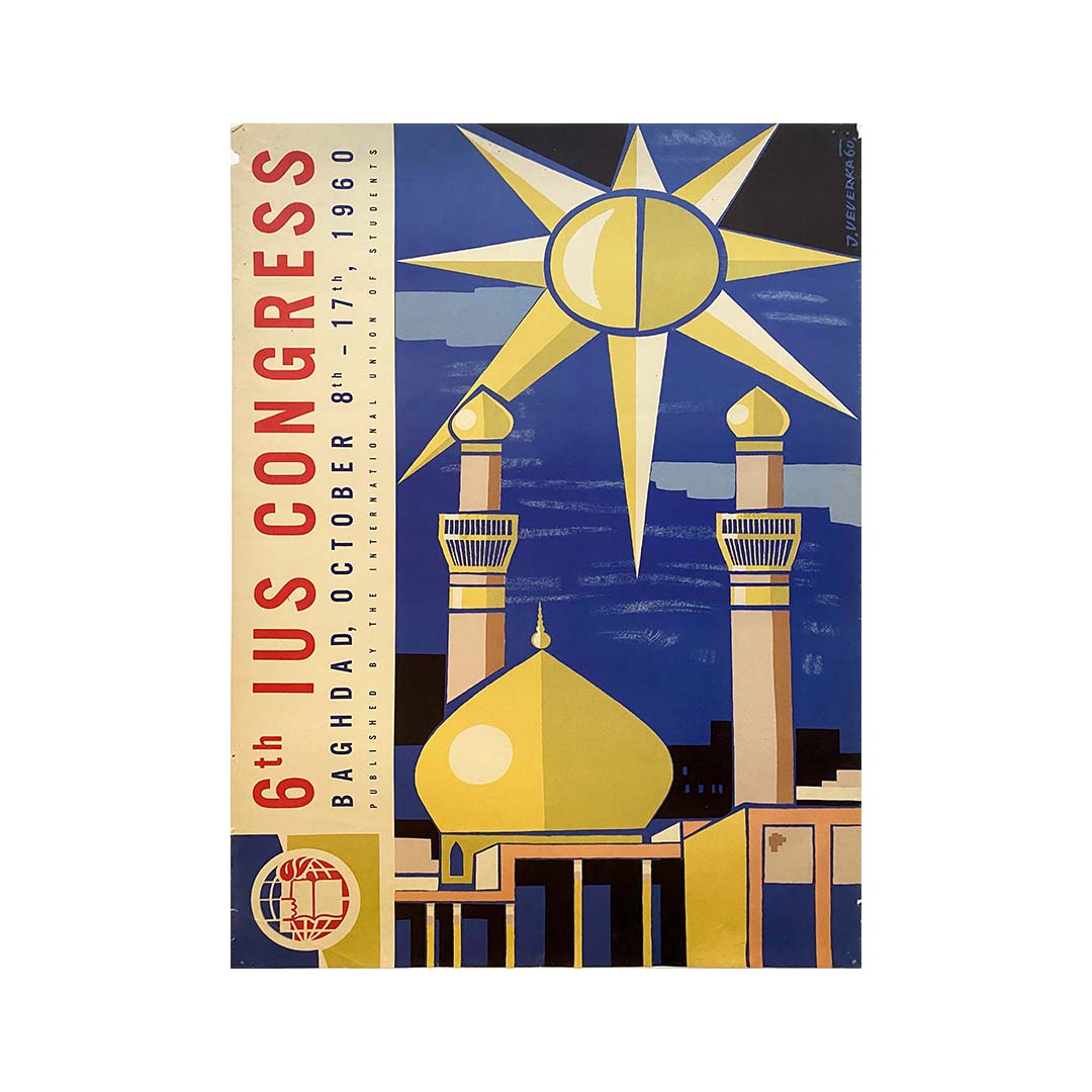 Cette affiche a été réalisée pour promouvoir le 6e Congrès de l'IUS qui s'est tenu du 8 au 17 octobre 1960 à Bagdad, en Irak.
