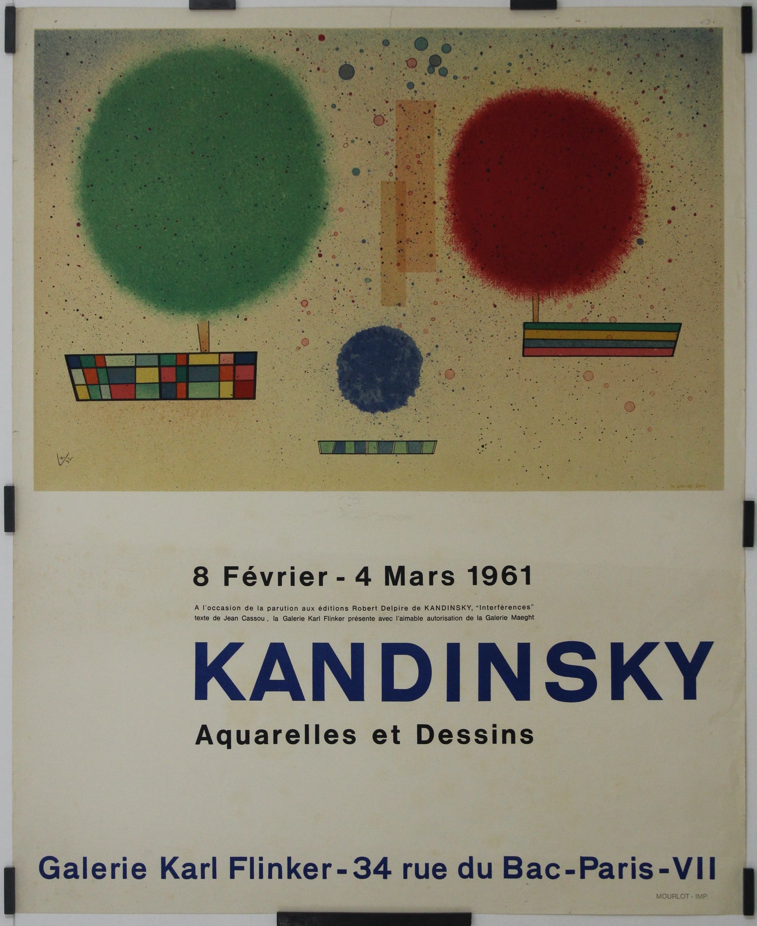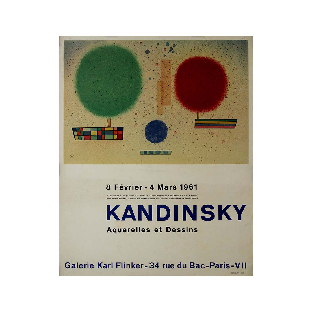 En 1961, la Galerie Karl Flinker devint un véritable carrefour d'exploration artistique en accueillant une exposition extraordinaire consacrée aux œuvres visionnaires de Vassily Kandinsky. Cette affiche originale, conçue pour promouvoir l'événement, incarnait l'essence même de l'expressionnisme abstrait de Kandinsky par ses couleurs audacieuses, ses formes géométriques et ses compositions dynamiques. À la fois annonce et œuvre d'art à part entière, l'affiche invitait les amateurs d'art à plonger dans l'univers avant-gardiste de Kandinsky, où les frontières s'estompaient et où l'imagination s'exprimait librement. Par chaque coup de pinceau, chaque choix de couleur, Kandinsky remettait en question les notions artistiques conventionnelles, invitant les spectateurs à un voyage de découverte visuelle et d'éveil artistique. L'affiche de l'exposition, reflet vibrant de l'esprit révolutionnaire de Kandinsky, témoigne de l'héritage durable de l'un des artistes les plus influents du XXe siècle.