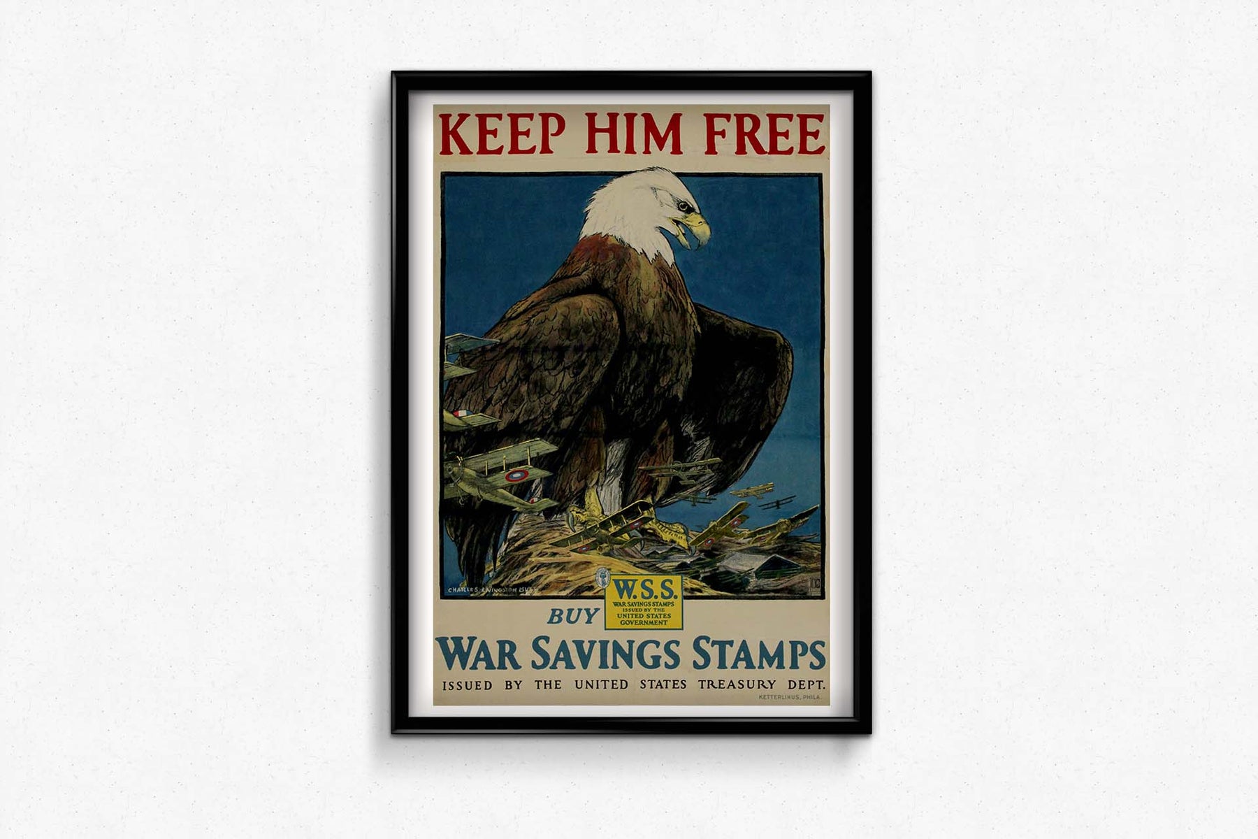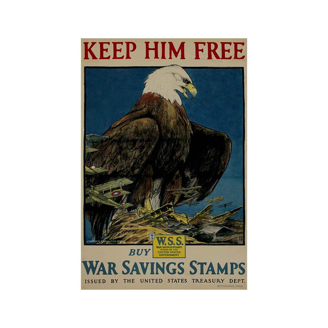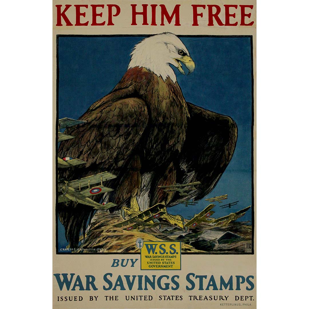 L'affiche originale de 1917 de Charles Livingston, « Préservez sa liberté grâce aux timbres d'épargne de guerre », présente une image saisissante d'un aigle majestueux planant au-dessus d'une flotte d'avions, symbolisant la force et la liberté des États-Unis pendant la Première Guerre mondiale. Imprimée par Ketterlinus à Philadelphie, l'affiche incitait les citoyens à soutenir l'effort de guerre en achetant des timbres d'épargne de guerre.