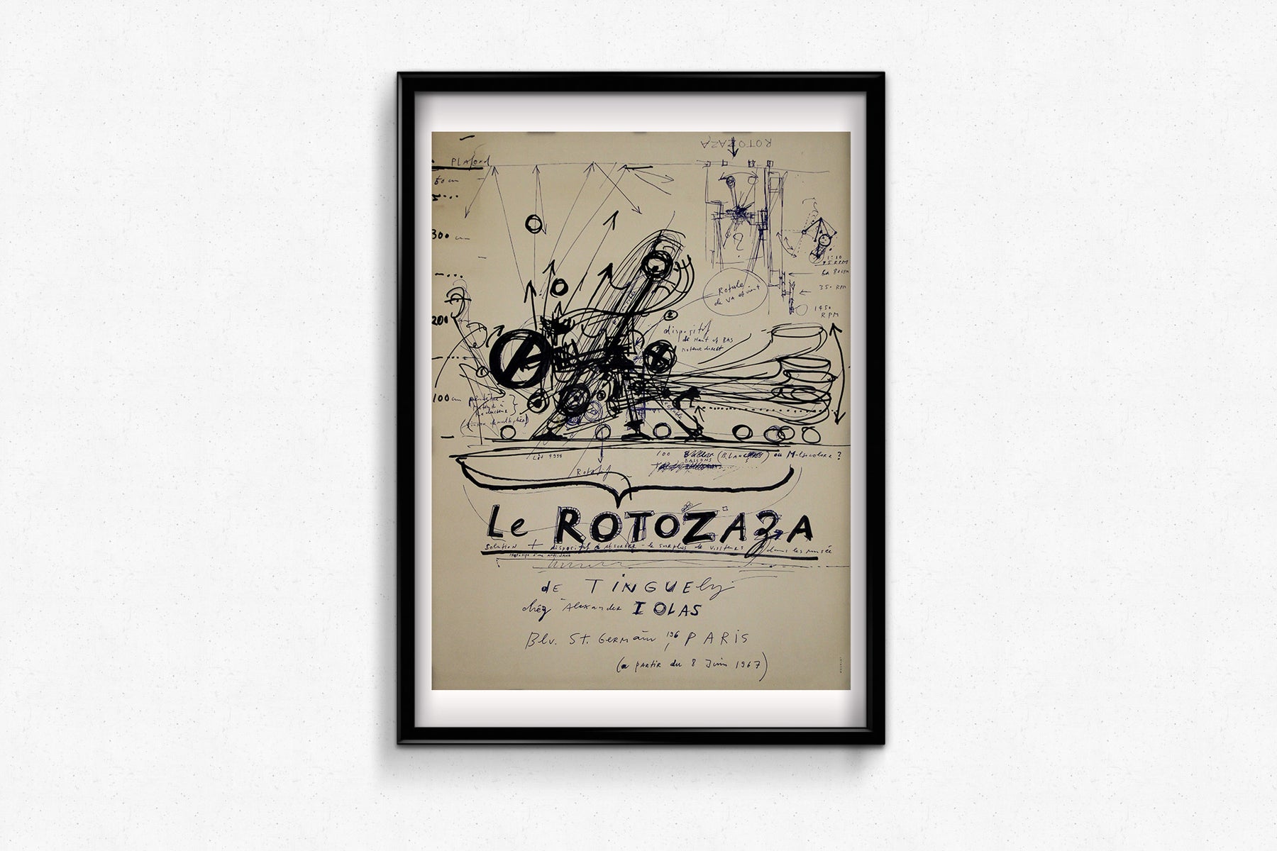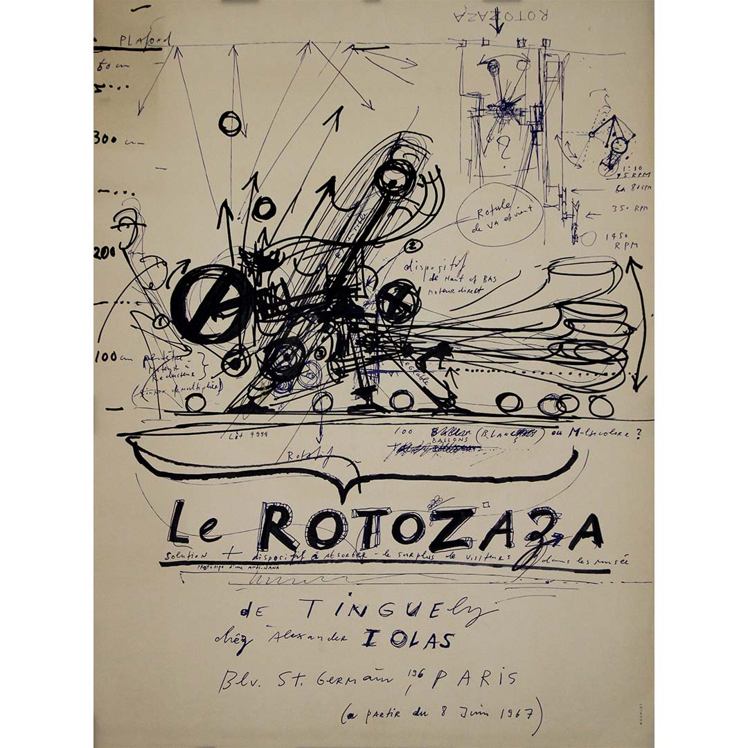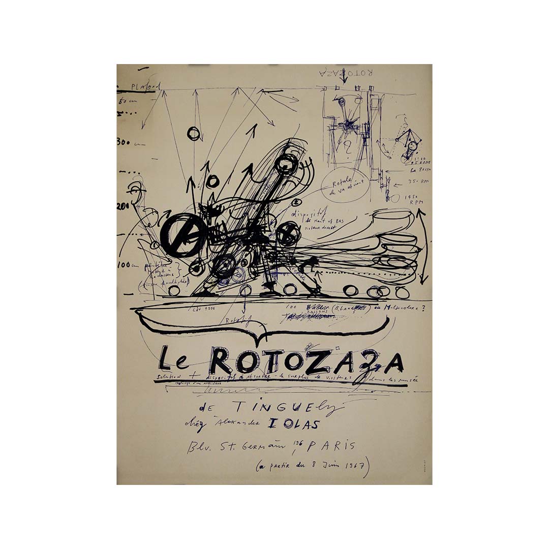 Cette affiche originale de l'exposition de 1967 a été conçue par le célèbre artiste cinétique suisse Jean Tinguely pour son exposition novatrice Le Rotozaza à la Galerie Alexandre Iolas, située au 196 boulevard Saint-Germain à Paris.