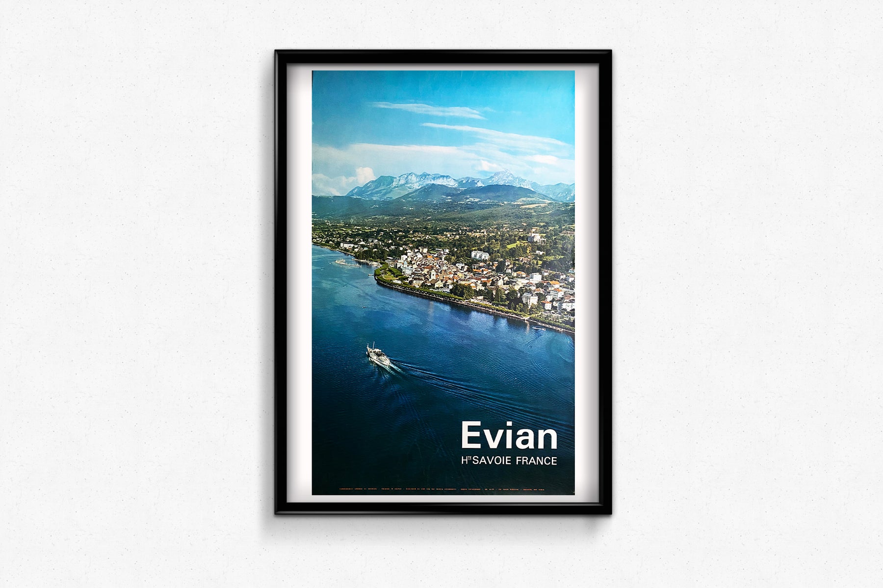 On aperçoit un bateau naviguant paisiblement sur le lac Léman, l'un des plus grands lacs d'Europe, en passant devant la ville d'Évian-les-Bains, ville mondialement connue pour son eau minérale.