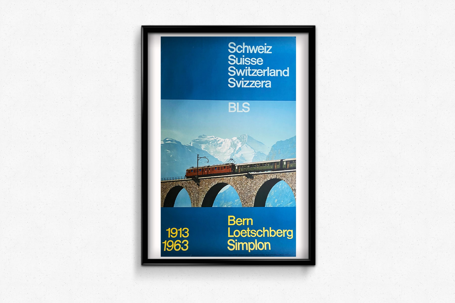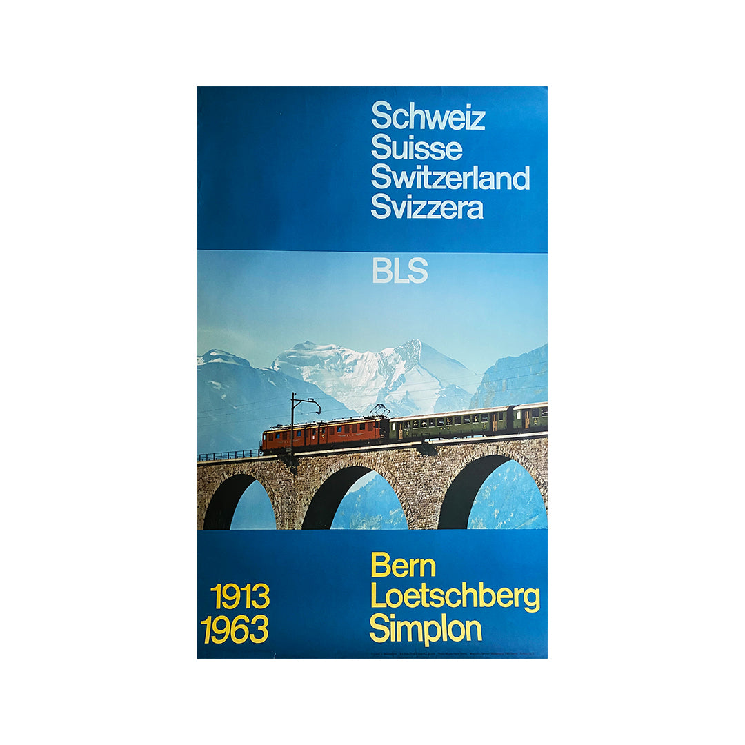 Une belle affiche réalisée pour le 50e anniversaire de BLS, la compagnie ferroviaire suisse Berne-Lötschberg-Simplon. En 2006, elle a fusionné avec Regionalverkehr Mittelland AG pour former une nouvelle société appelée BLS AG.