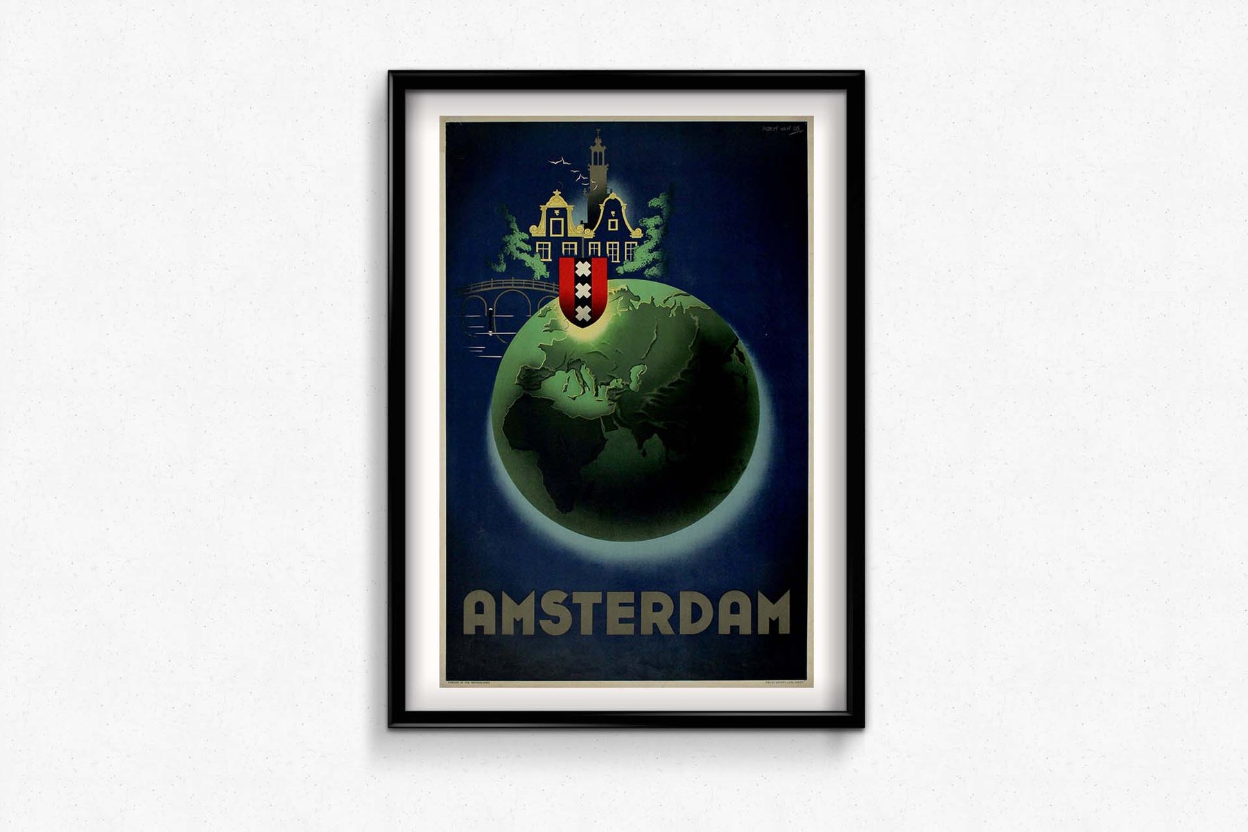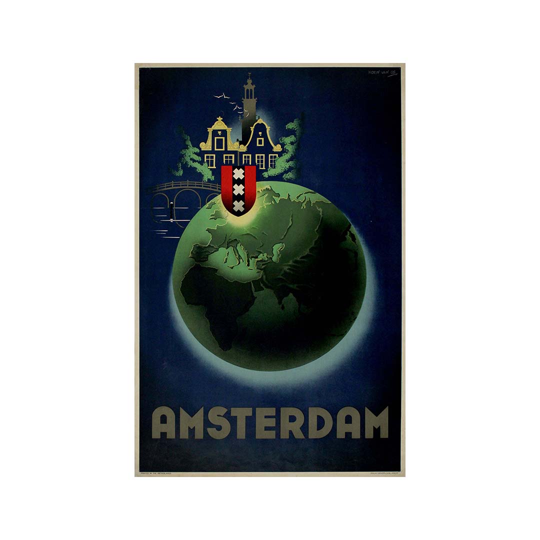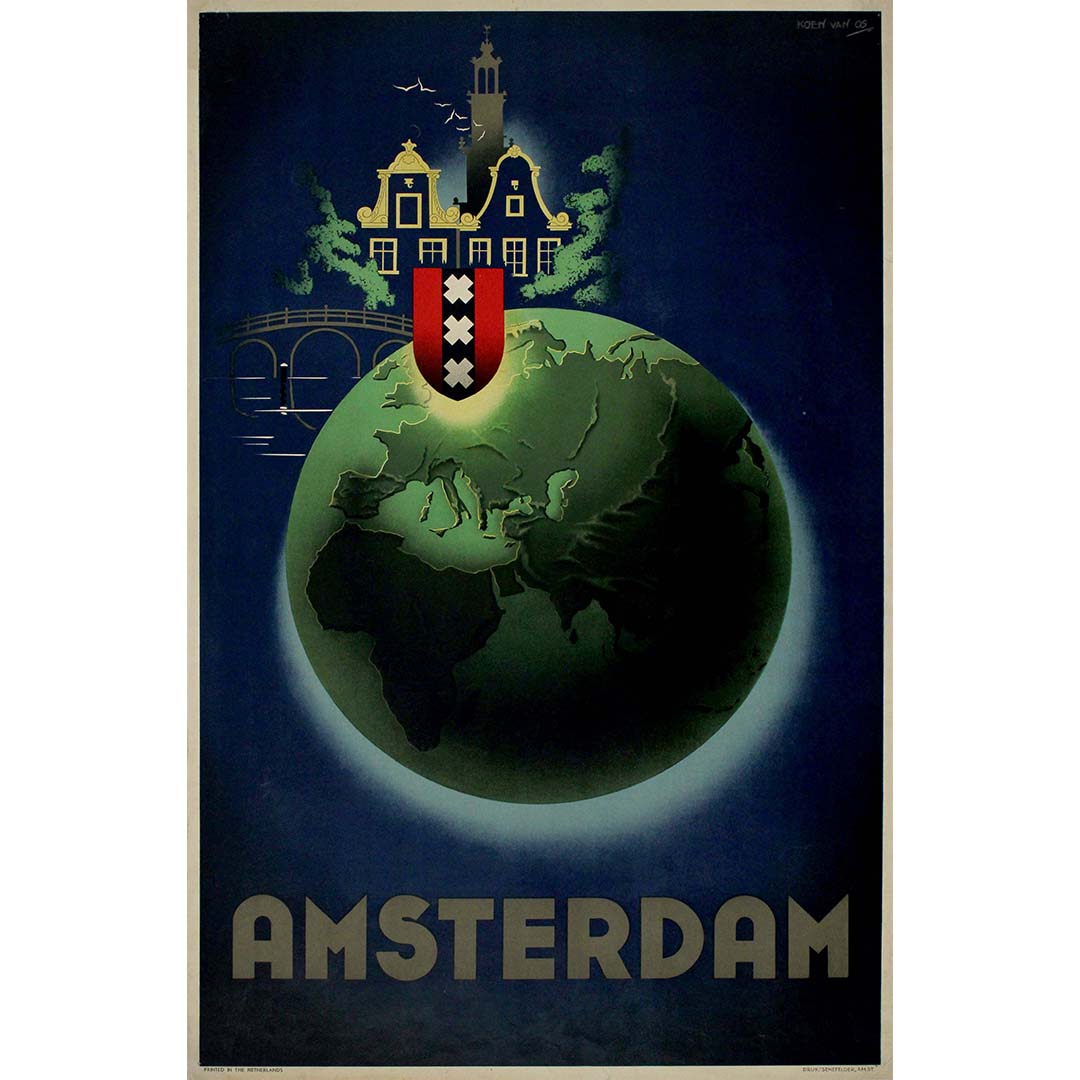 En résumé, l'affiche d'Amsterdam de Koen van Os, datant des années 1950, est un chef-d'œuvre de design moderniste et de symbolisme culturel. L'utilisation de la Terre comme motif central souligne l'importance mondiale d'Amsterdam, tandis que la maison de canal, les armoiries et la typographie minimaliste créent une identité visuelle forte pour la ville. Cette affiche sert non seulement de support promotionnel pour Amsterdam, mais constitue également une œuvre d'art qui capture l'essence de la ville avec audace, élégance et modernité.