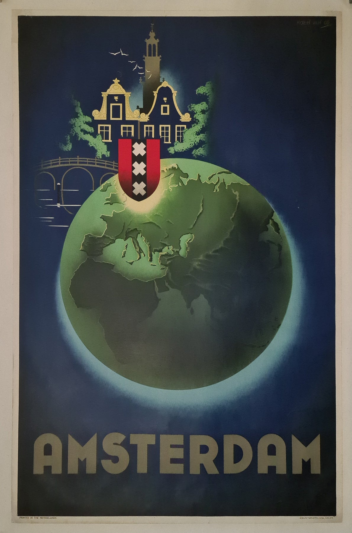 L'élément central de l'affiche est constitué des armoiries d'Amsterdam, occupant une place de choix au centre de la composition, superposées au globe terrestre. Ces armoiries se composent d'un écu rouge traversé d'une bande noire centrale, orné de trois croix de Saint-André blanches, symbole emblématique de la ville. La disposition de l'écu sur le globe confère une impression de puissance et d'autorité, soulignant le rayonnement d'Amsterdam sur la scène internationale. La simplicité des armoiries, alliée à l'éclat de leurs couleurs rouge, noir et blanc, crée un contraste visuel saisissant avec les tons plus sobres du globe et du fond, en faisant le point focal de l'affiche.