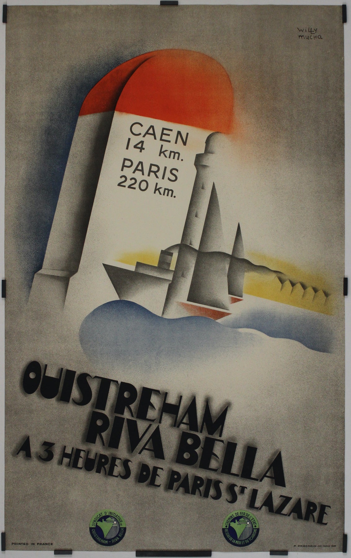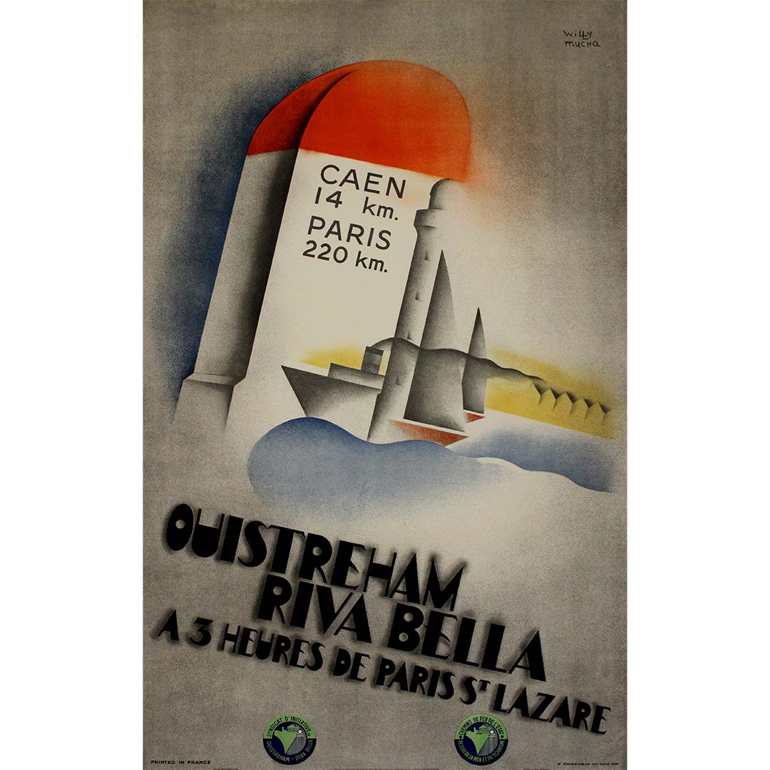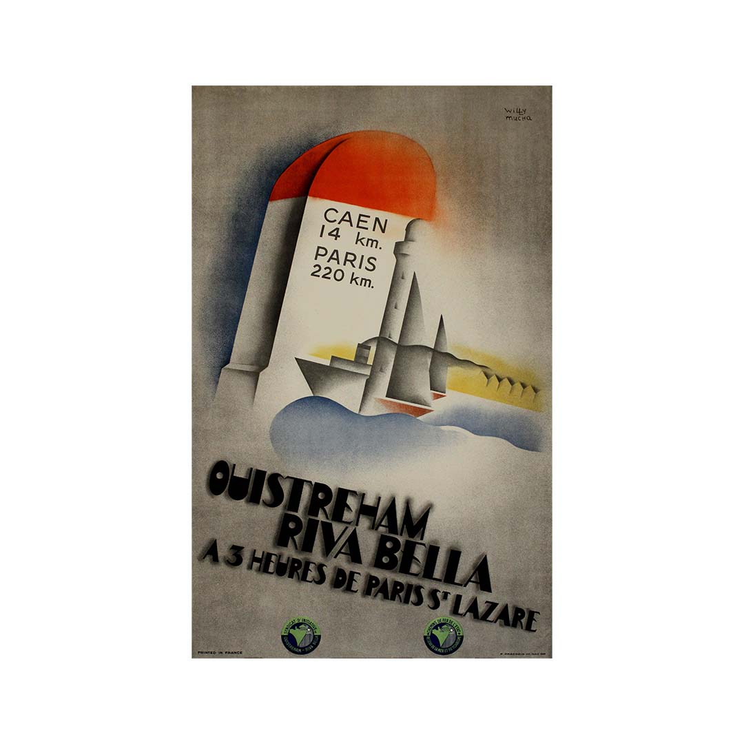 Le dessin de Mucha capture l'élégance et l'optimisme du mouvement Art déco. L'affiche présente des formes géométriques audacieuses, des lignes épurées et un mélange harmonieux de couleurs à la fois douces et vives. Dominée par une bouée rouge éclatante et un phare imposant, la composition invite à imaginer le charme d'Ouistreham Riva Bella, joyau de la côte normande. L'inscription « Caen 14 km. Paris 220 km. » souligne la proximité et l'accessibilité de cette destination, mettant en avant la praticité du voyage en train.