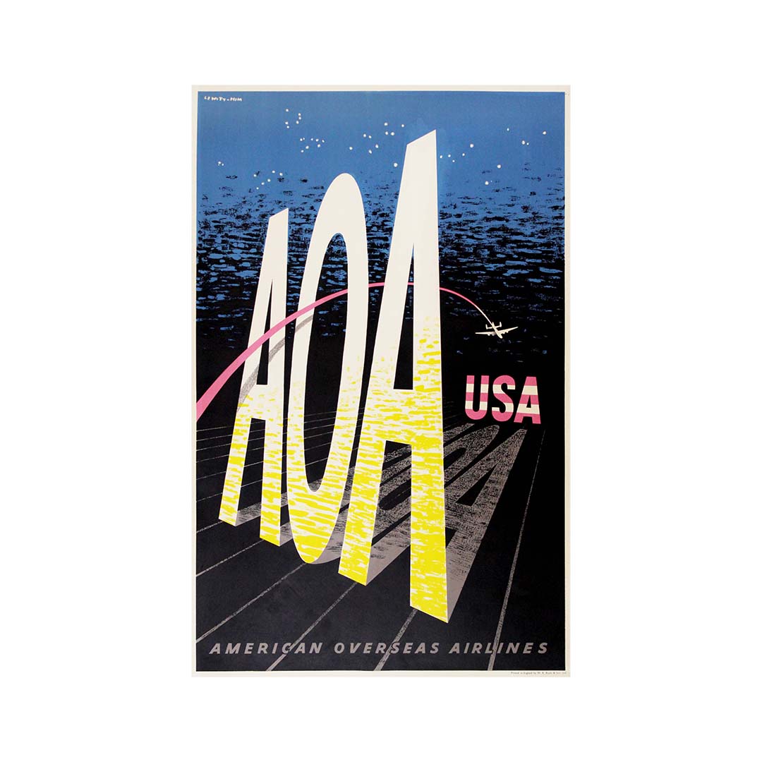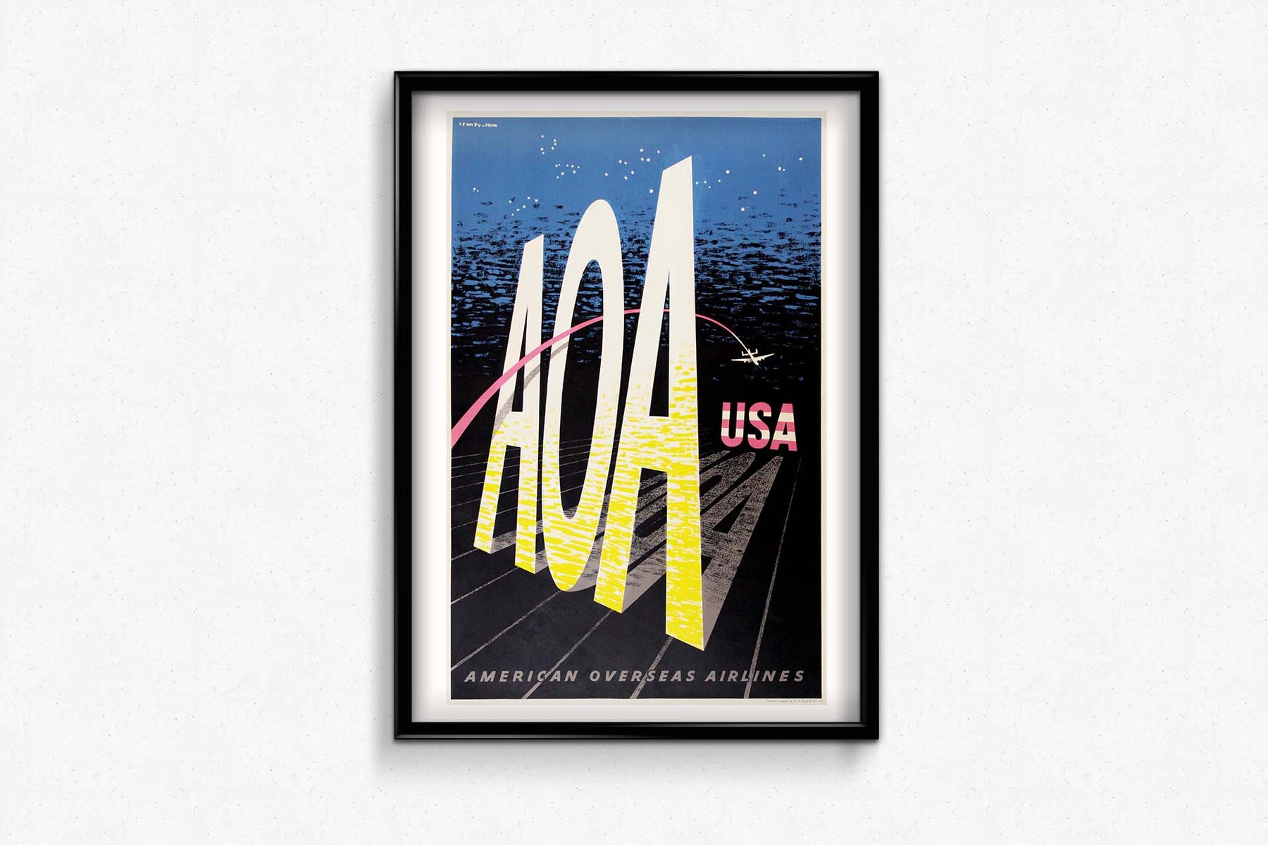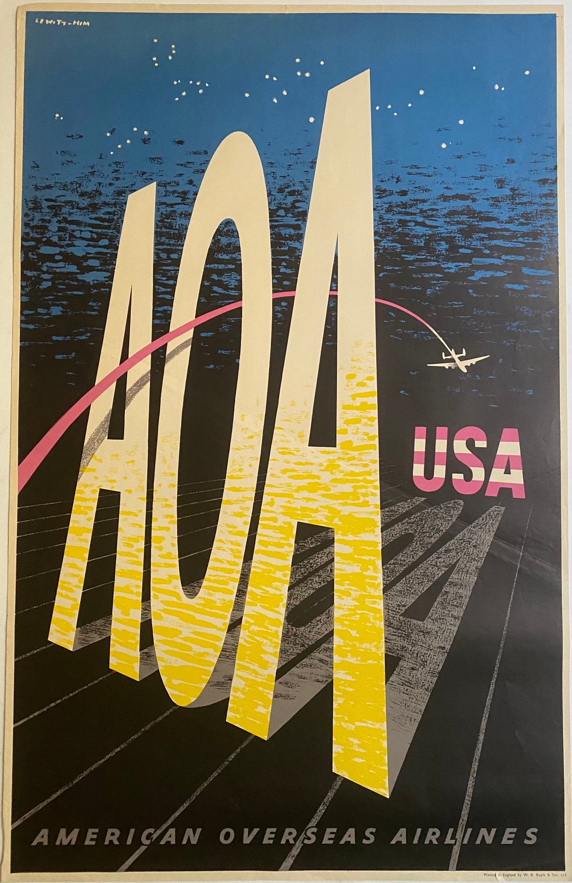 Plongez dans l'univers vibrant des voyages américains avec l'affiche originale de Him Lewitt pour AOA (American Overseas Airlines), datant des années 1950. Cette superbe œuvre d'art vintage vous invite à un voyage visuel à travers les paysages variés des États-Unis, capturant l'essence même de l'aventure et de la découverte.