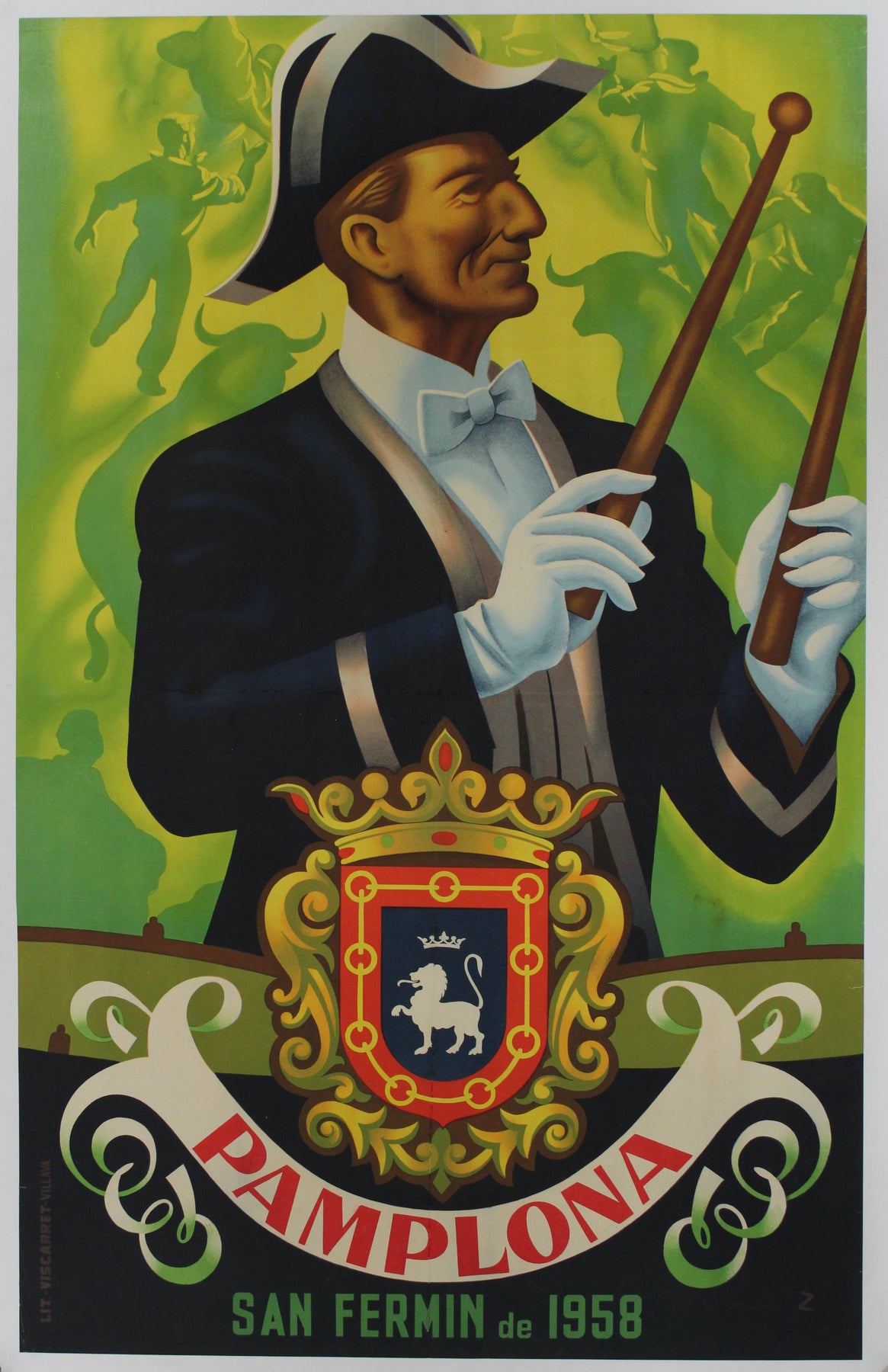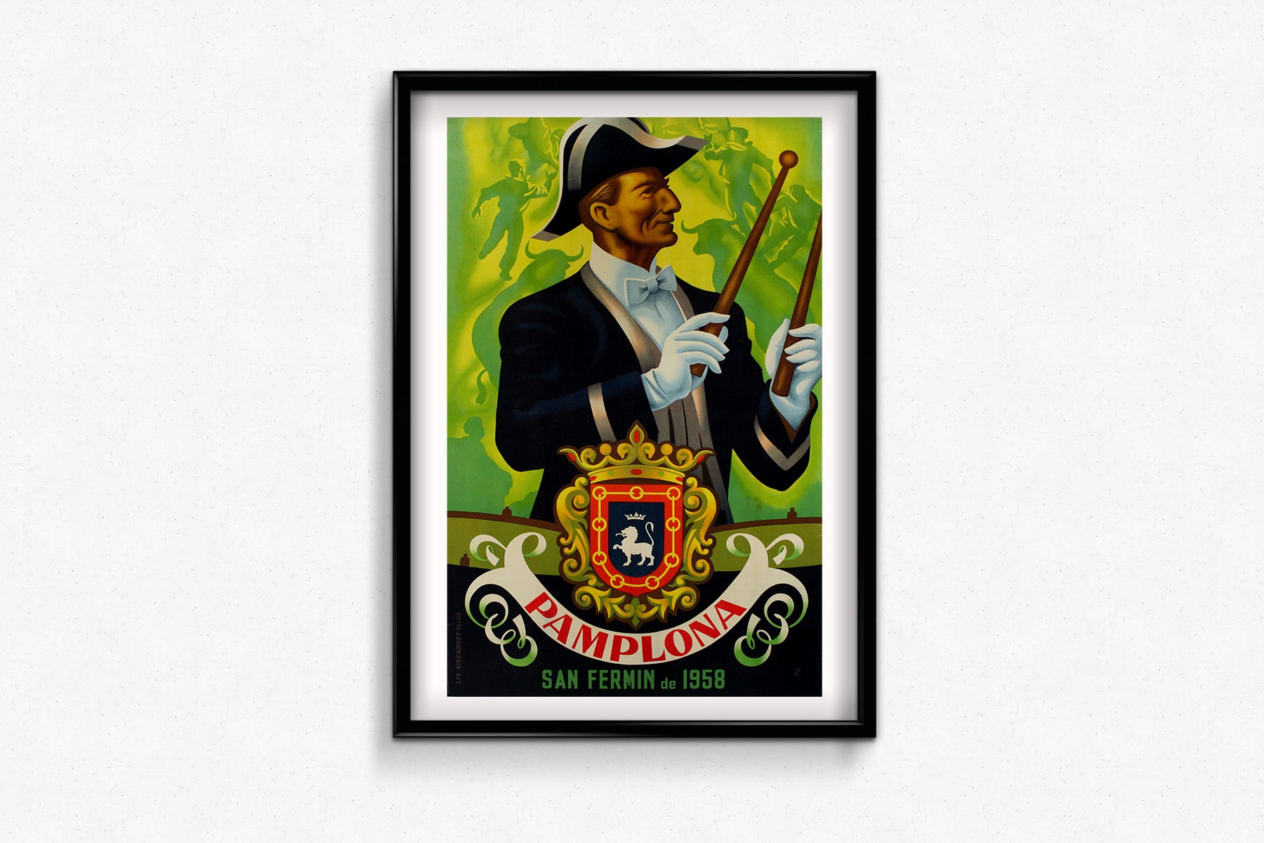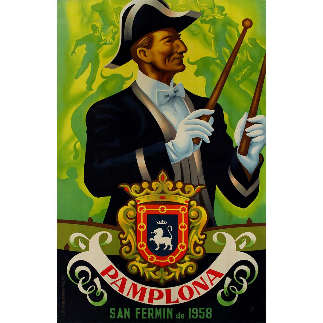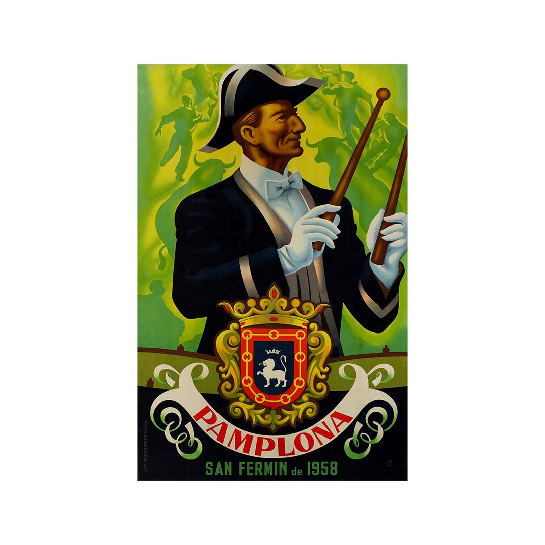 L'emblème héraldique de Pampelune, orné d'un lion et d'une couronne, figure en bonne place dans la partie inférieure de l'affiche, symbolisant la fierté historique et culturelle de la ville. Le blason, avec ses détails raffinés et ses couleurs royales, rappelle le riche passé de Pampelune et ses traditions vivaces. En dessous, on peut lire « Pamplona San Fermín de 1958 », année de cette fête.