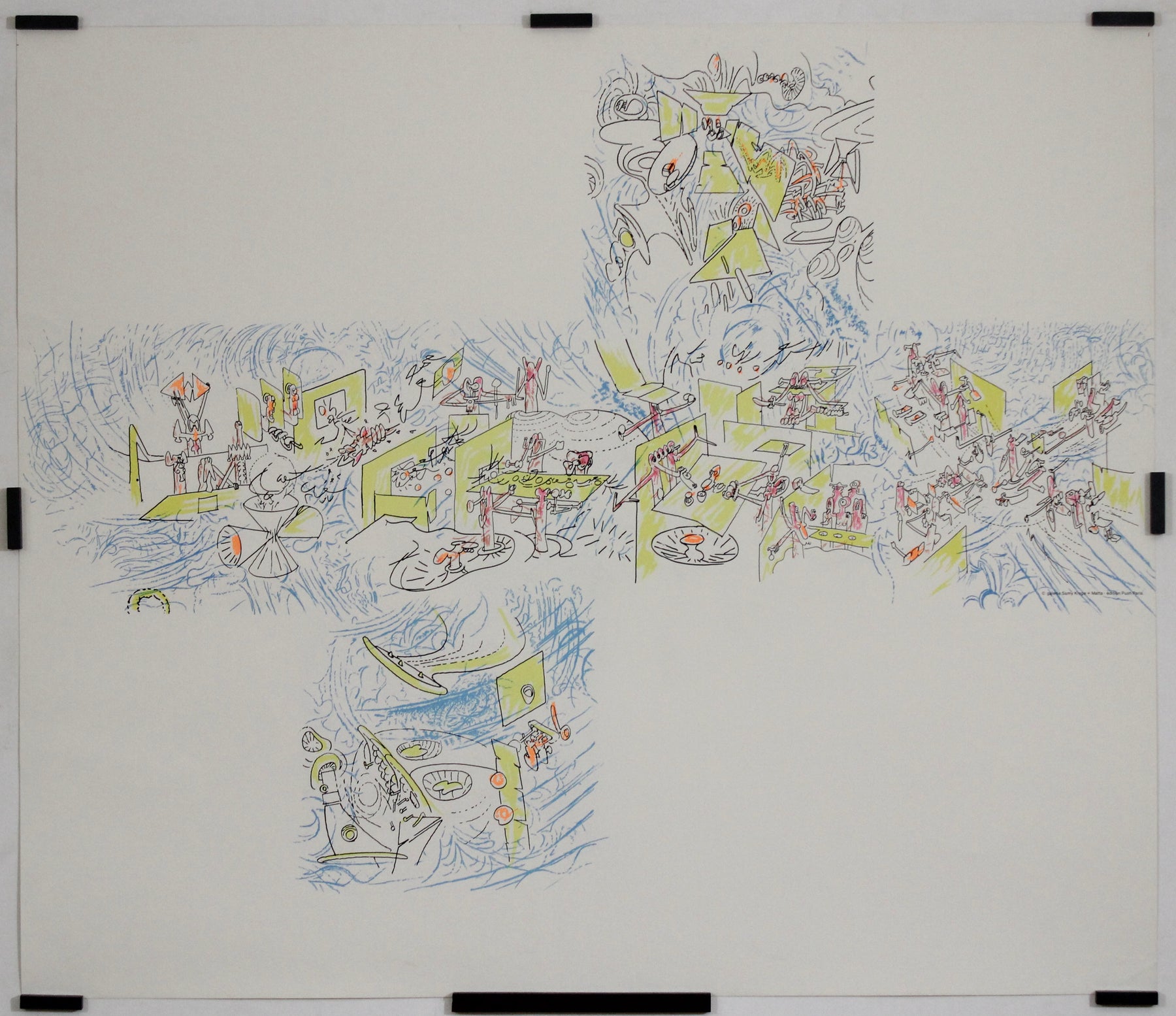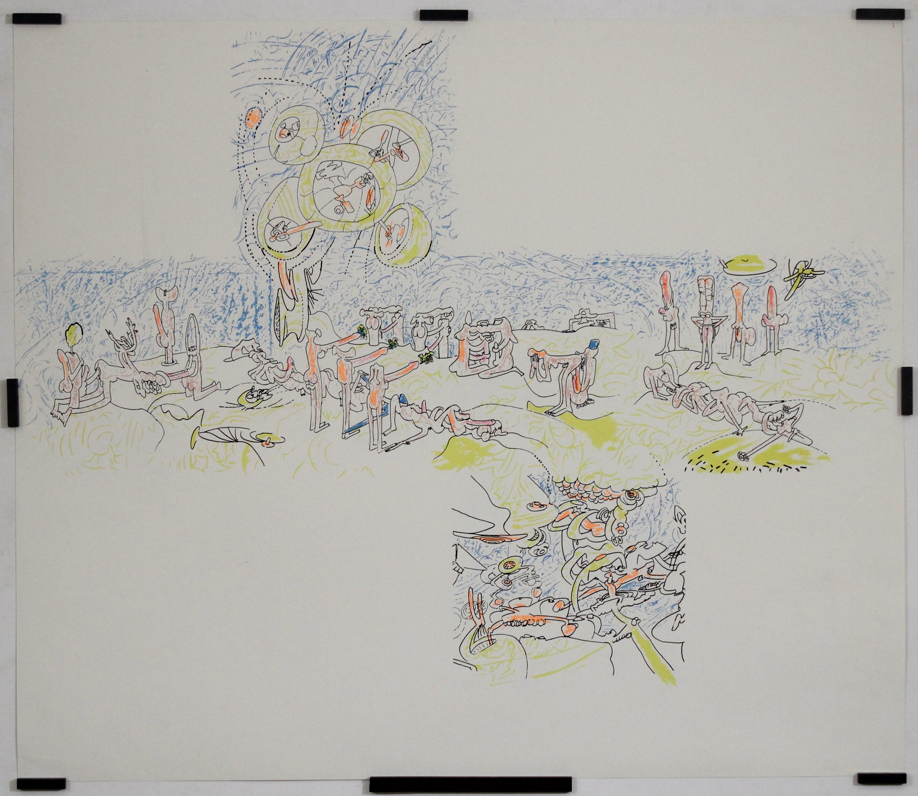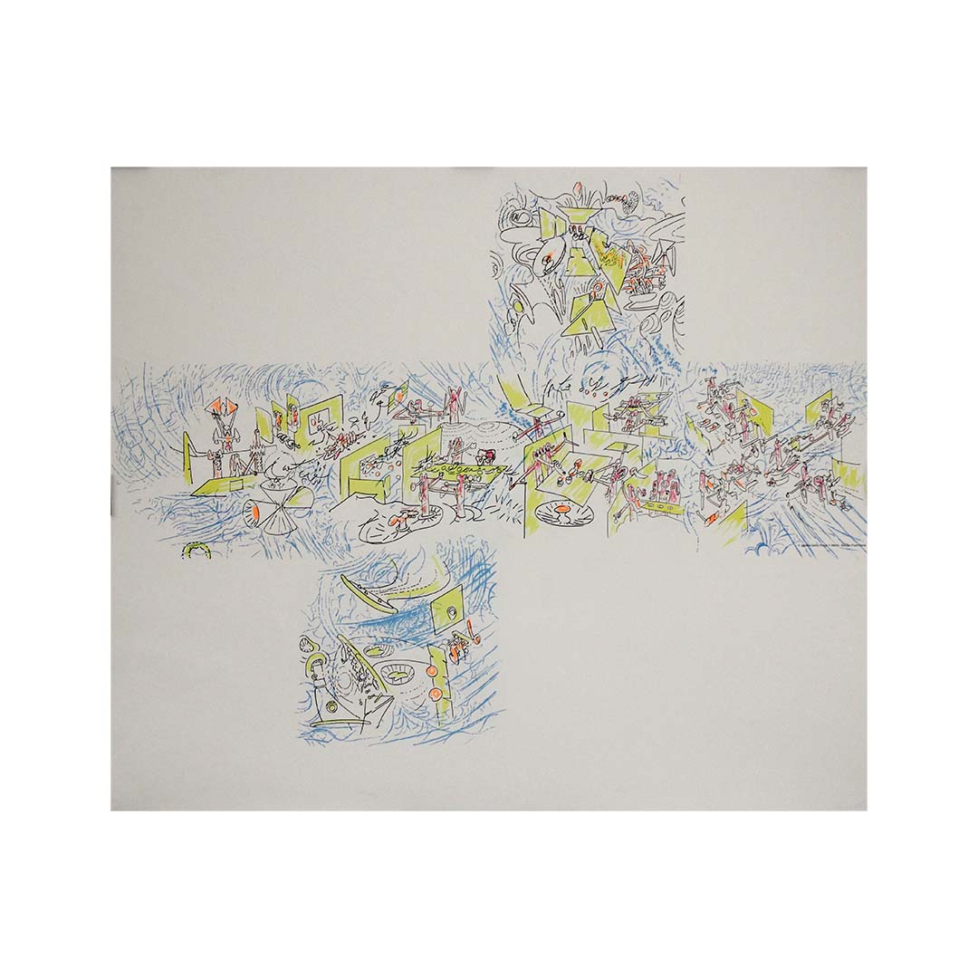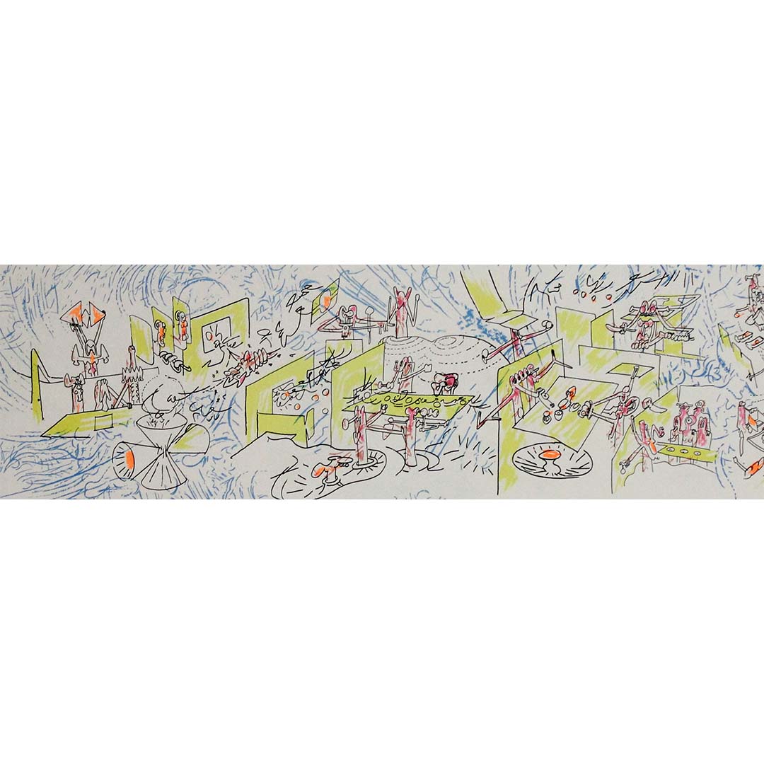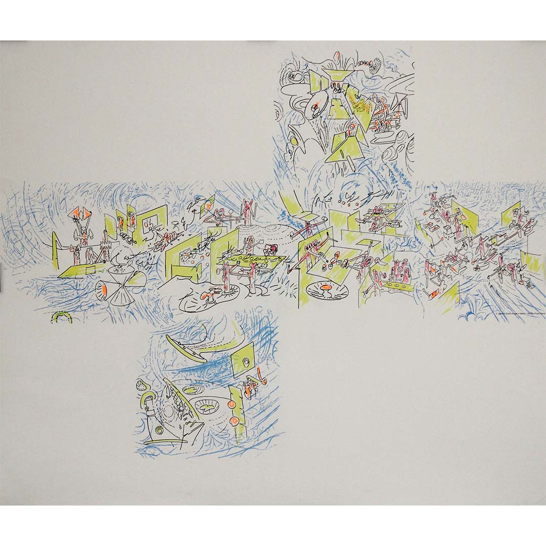 La composition se caractérise par un travail de lignes abstrait et complexe, rehaussé de touches de jaune, de rouge et de bleu éclatants, formant un réseau onirique de figures, de structures et de mouvements. Ces éléments, à la fois chaotiques et structurés, créent une impression de fluidité et de transformation, signature du style artistique de Matta. Ses formes biomorphiques et ses paysages cosmiques caractéristiques sont bien présents, évoquant un monde à la fois mécanique et organique.