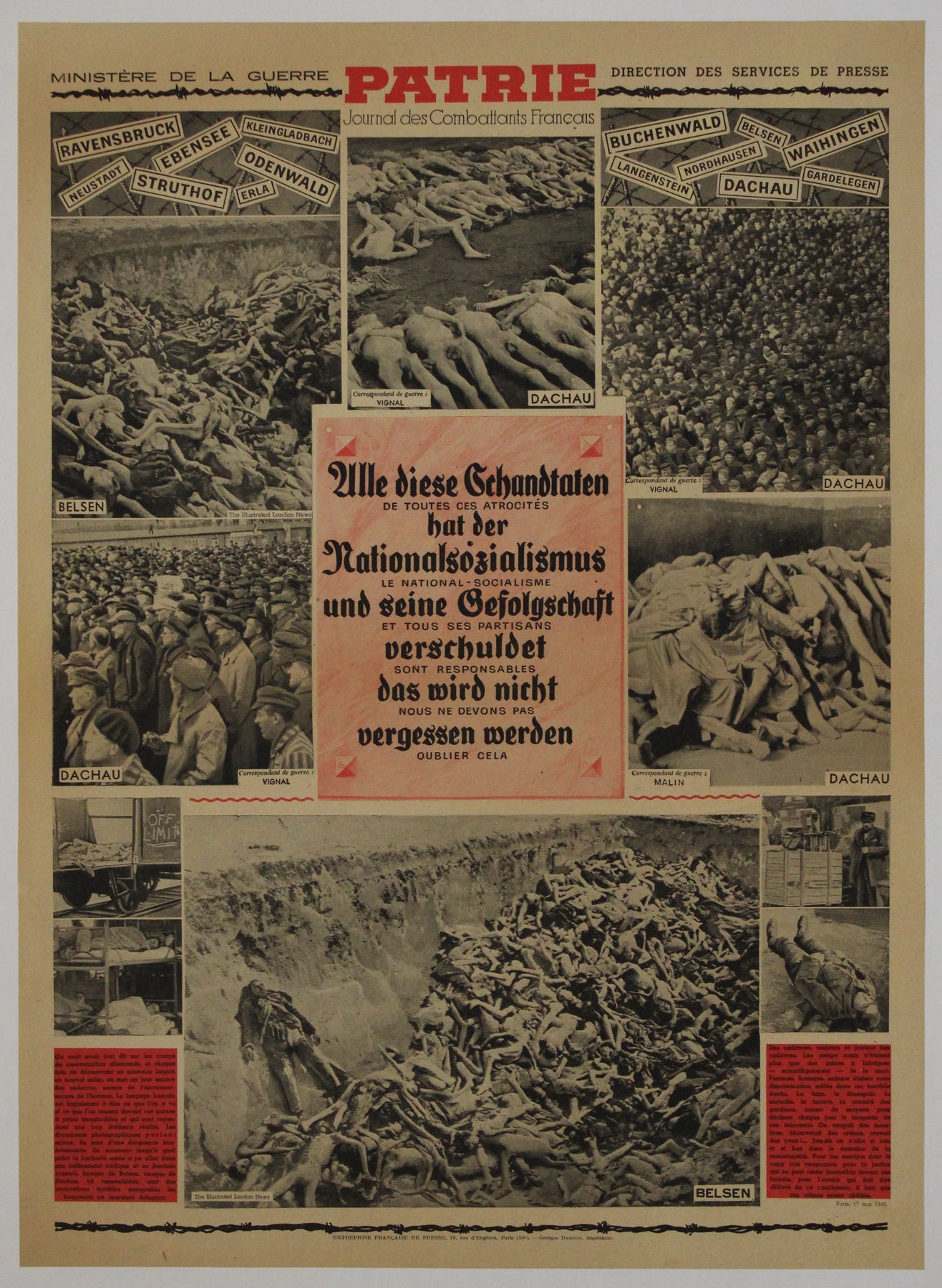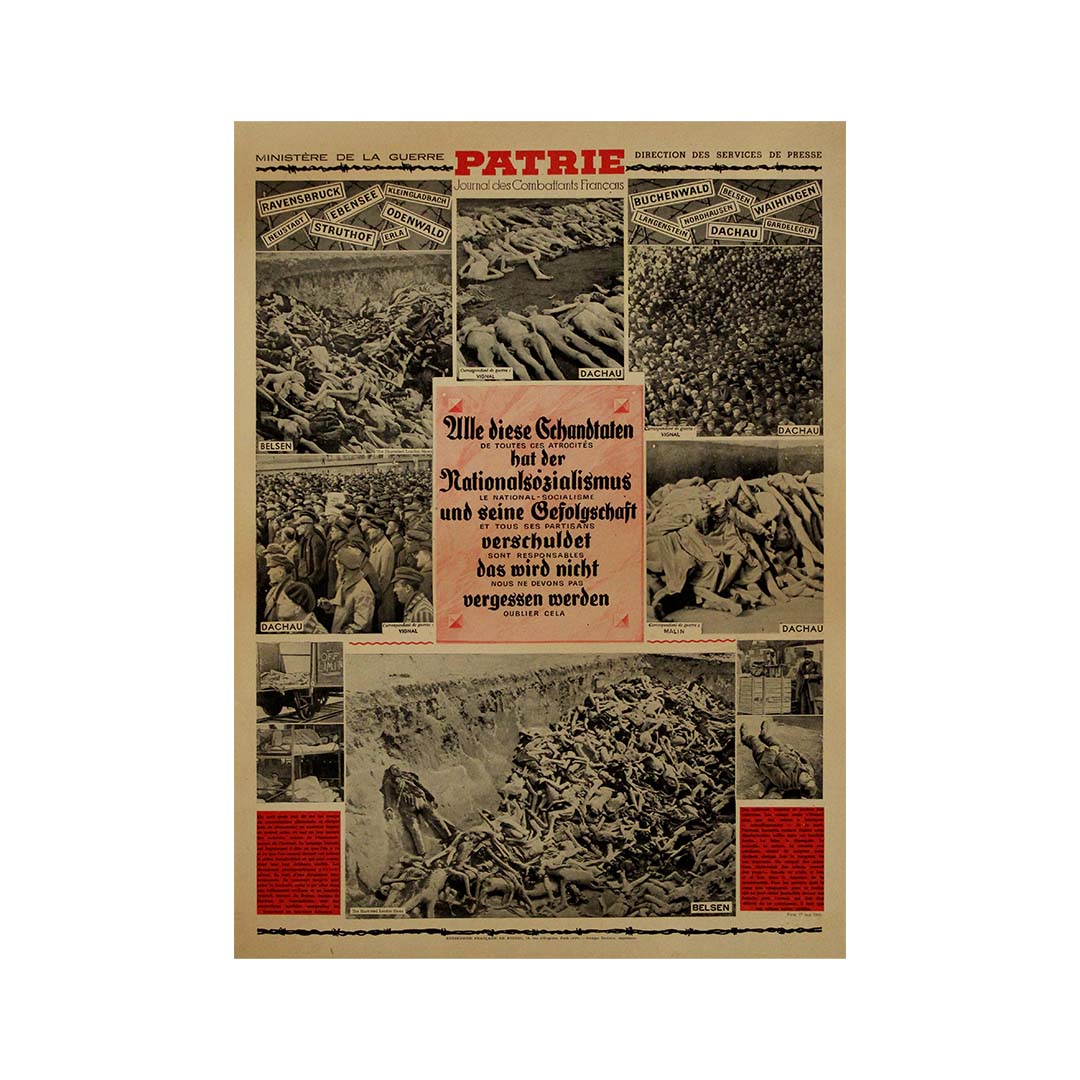 Cette affiche originale de 1945, « Patrie – Journal des Combattants Français » , a été publiée par le ministère français de la Guerre comme un rappel poignant des atrocités commises sous le régime nazi. Parue au lendemain de la Seconde Guerre mondiale, elle constitue un témoignage historique éloquent, réaffirmant la nécessité du devoir de mémoire et de la justice.