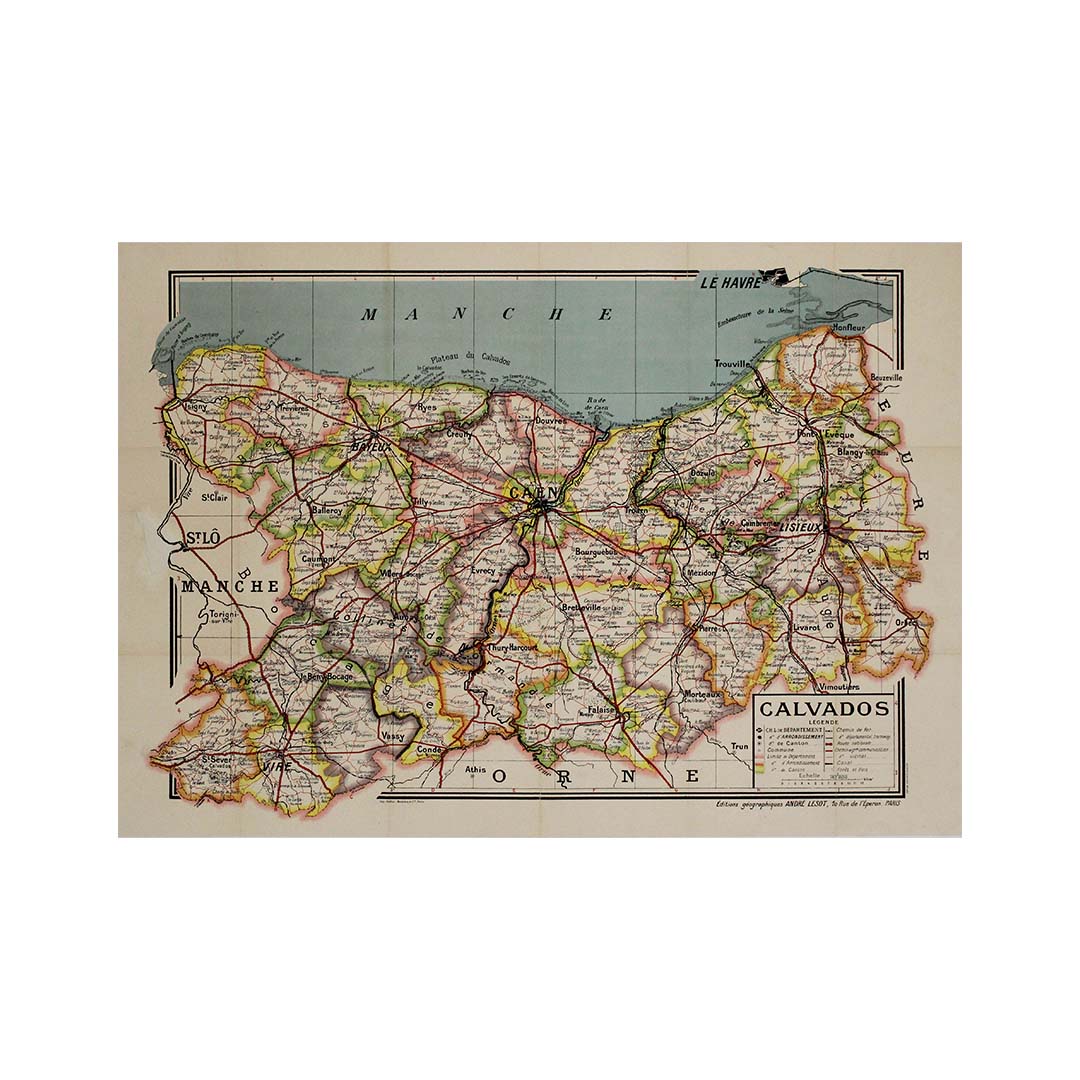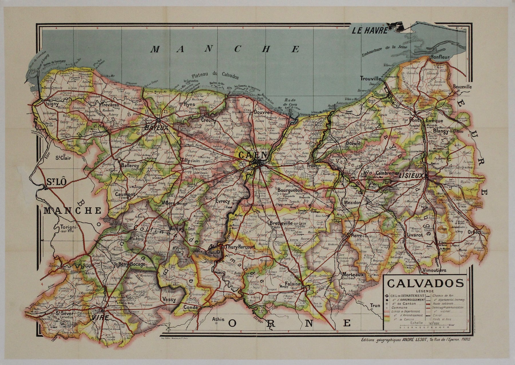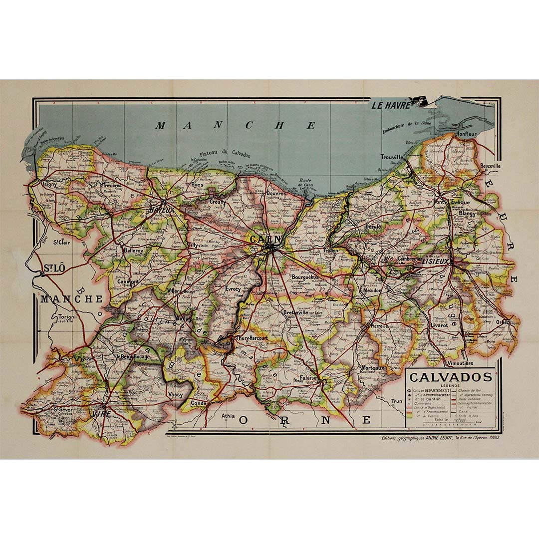 Dans les années 1950, les cartes de ce type étaient des outils indispensables aux voyageurs, géographes et historiens, servant à la fois des fins pratiques et pédagogiques. Cette édition particulière illustre le paysage du Calvados après la guerre, une région profondément marquée par la Seconde Guerre mondiale, notamment par le débarquement de Normandie en 1944.