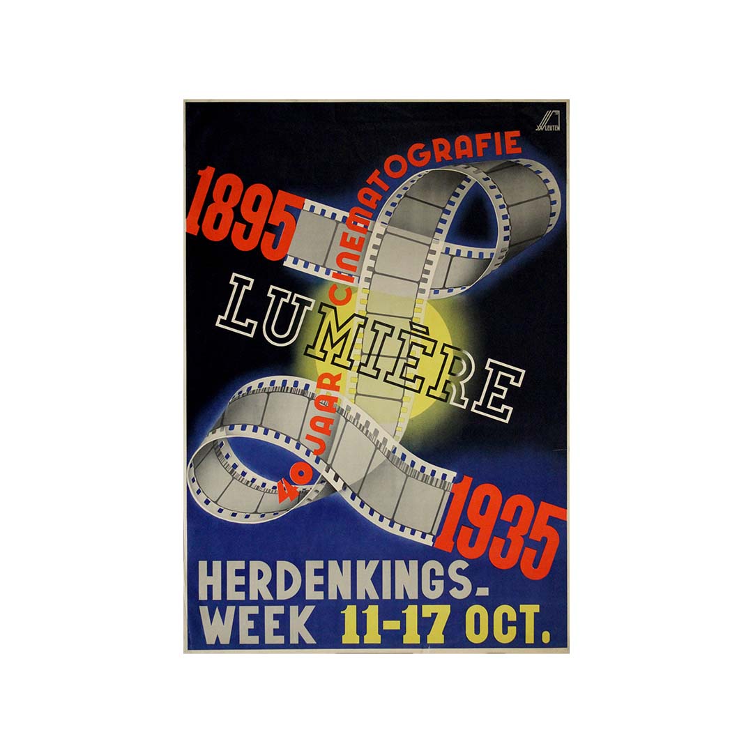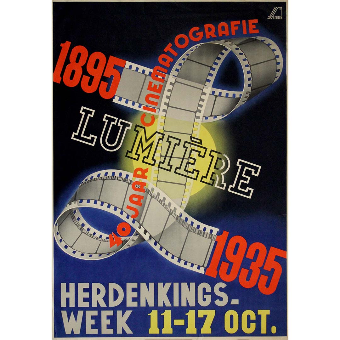 En 1935, pour commémorer les 40 ans du cinéma (1895-1935), l'artiste W. Leuten a conçu cette affiche saisissante de style Art déco pour un événement spécial célébrant l'anniversaire des frères Lumière. Cet hommage visuel illustre l'impact révolutionnaire d'Auguste et Louis Lumière, pionniers du cinéma, dont l'invention du Cinématographe en 1895 a marqué la naissance du cinéma moderne.