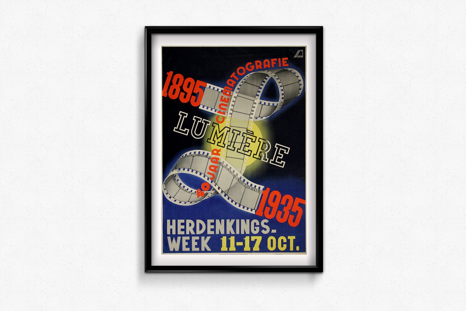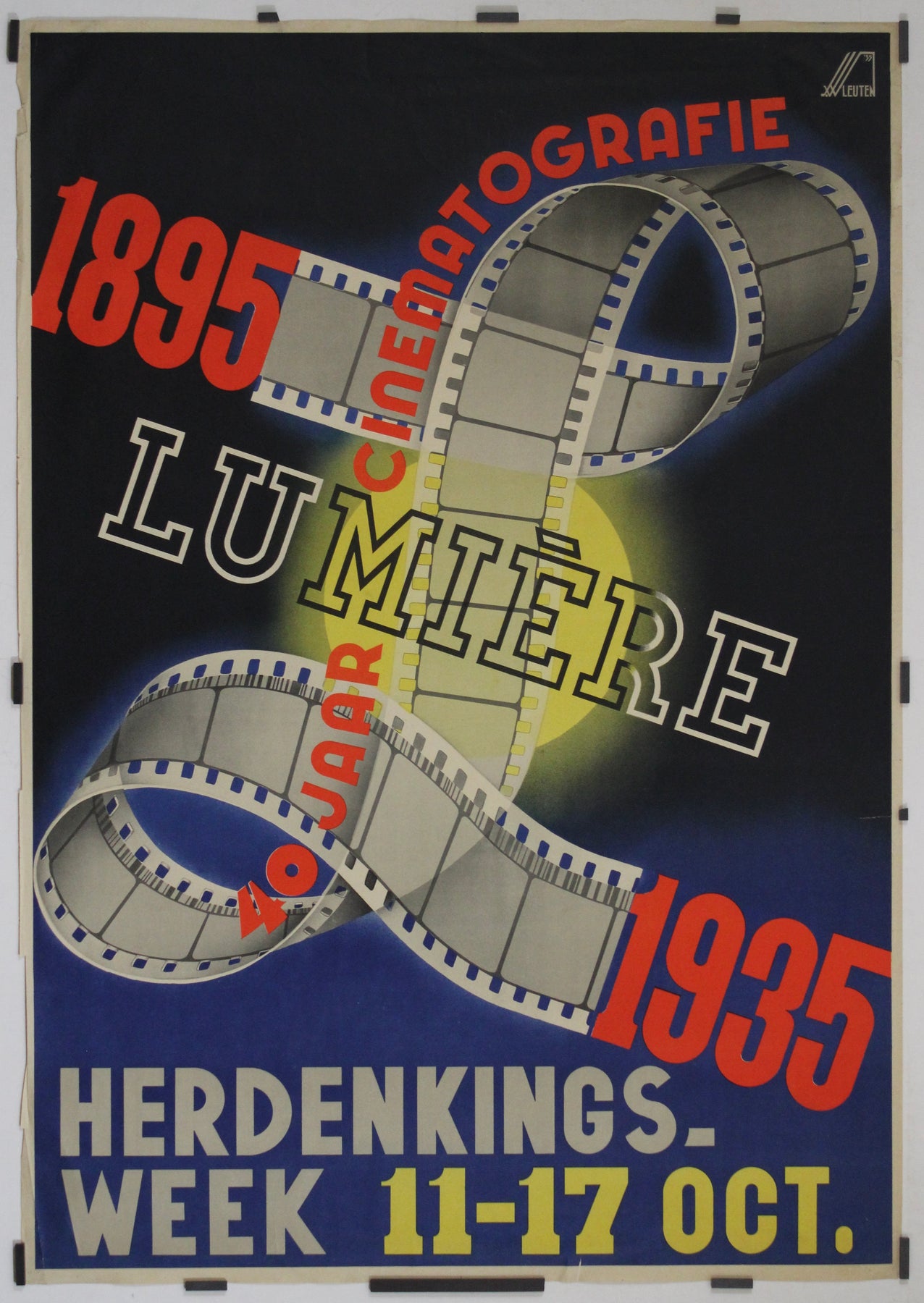 Conçue pour la Semaine commémorative (Herdenkingsweek) qui s'est tenue du 11 au 17 octobre 1935, l'affiche reflète l'esthétique Art déco de l'époque, avec sa composition géométrique audacieuse, ses angles aigus et son utilisation dynamique de la typographie. Les mots « 40 Jaar Cinematografie » (40 ans de cinématographie) en rouge, qui serpentent le long de la pellicule, rappellent les progrès remarquables accomplis par le cinéma depuis ses débuts.