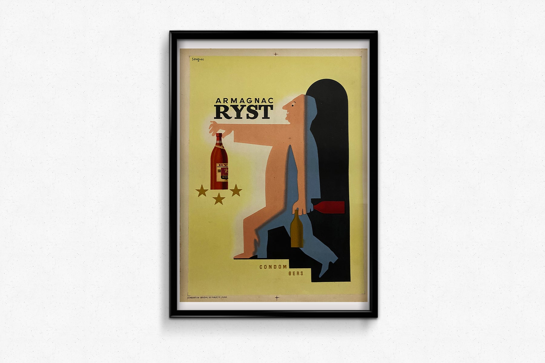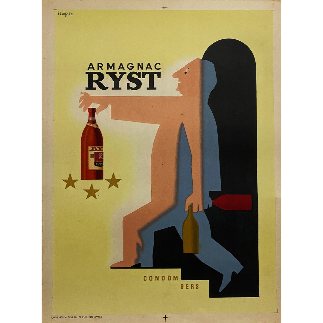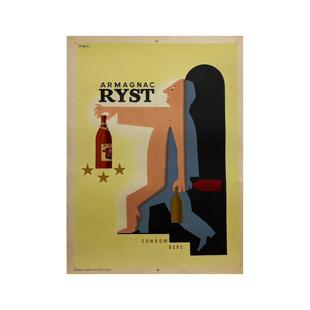 Cette affiche a été créée pour promouvoir l'Armagnac Ryst. L'Armagnac est une eau-de-vie de vin produite dans les départements français du Gers, des Landes et du Lot-et-Garonne. Joseph Dupeyron, distillateur, a fondé en 1905 la maison Ryst-Dupeyron, une demeure familiale située au cœur de la Gascogne, pour y entreposer ses élixirs.