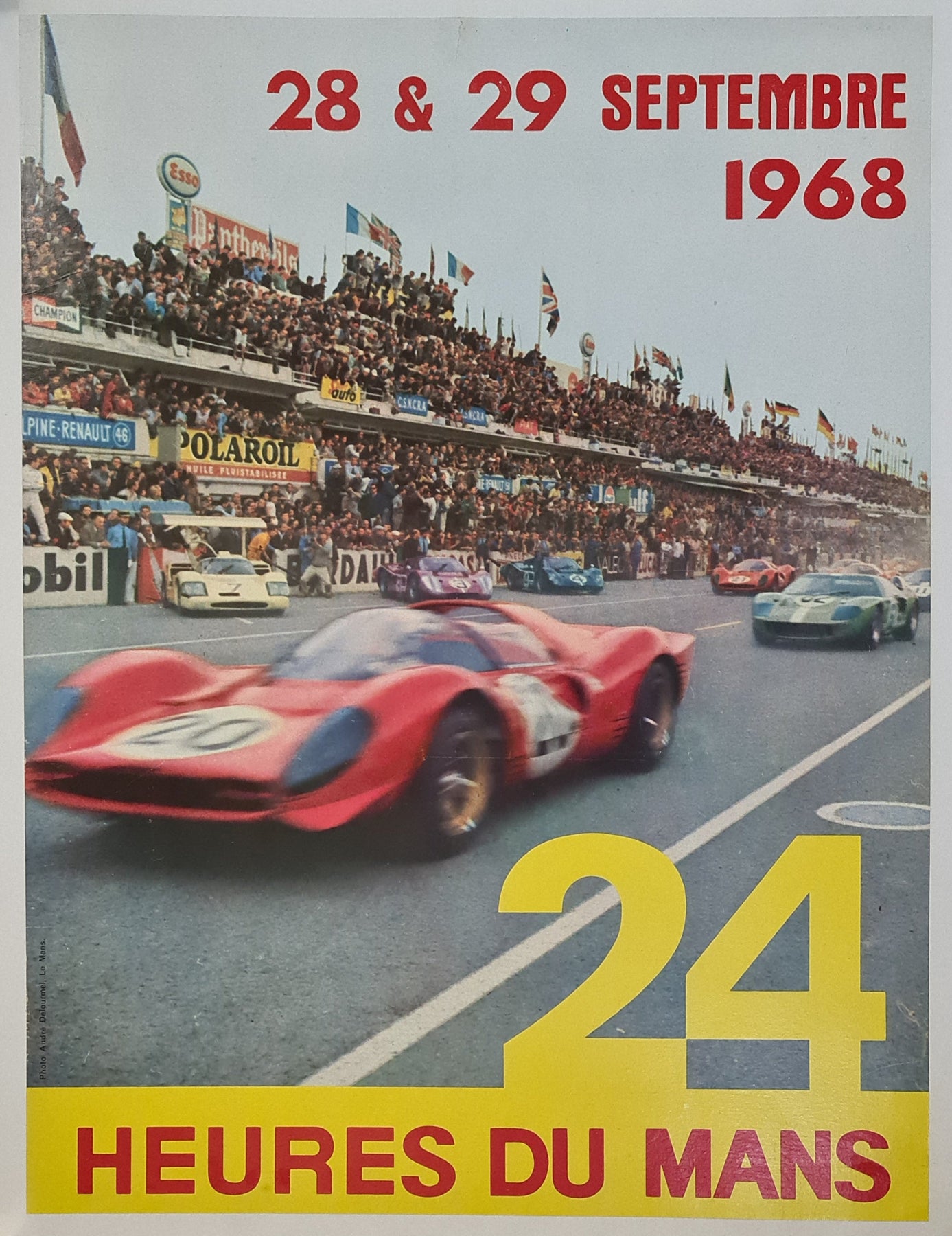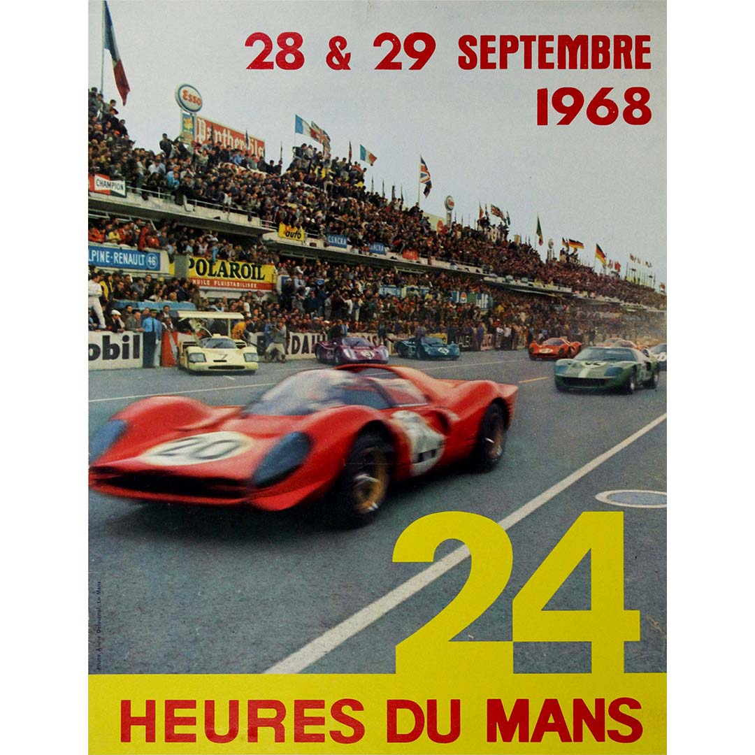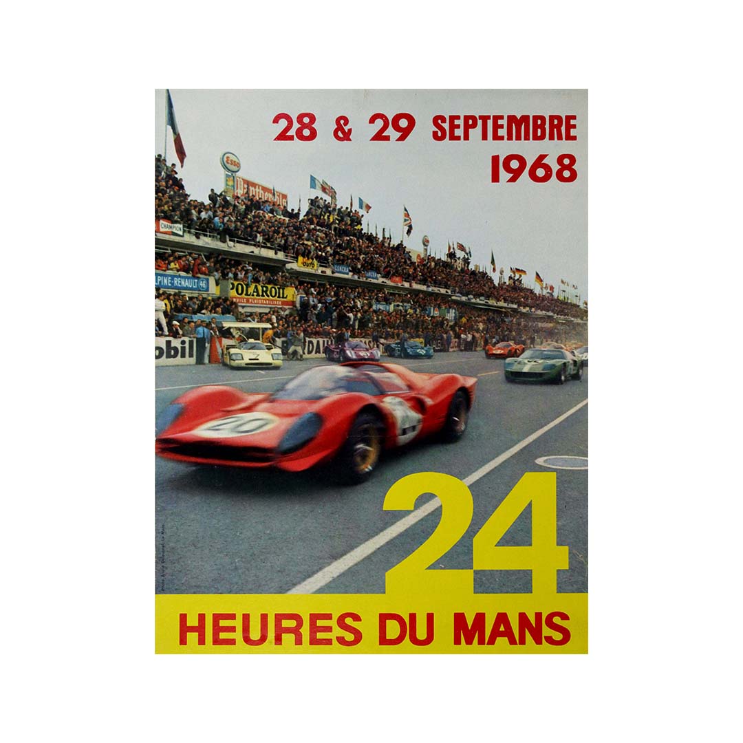 L'affiche originale de 1968 pour les 24 Heures du Mans, illustrée par les photographies d'André Delourmel, capture l'essence de l'une des courses d'endurance les plus mythiques au monde. Le sens aigu de la composition et le talent de Delourmel pour immortaliser l'instant transparaissent dans cet hommage visuel saisissant à cette course historique.