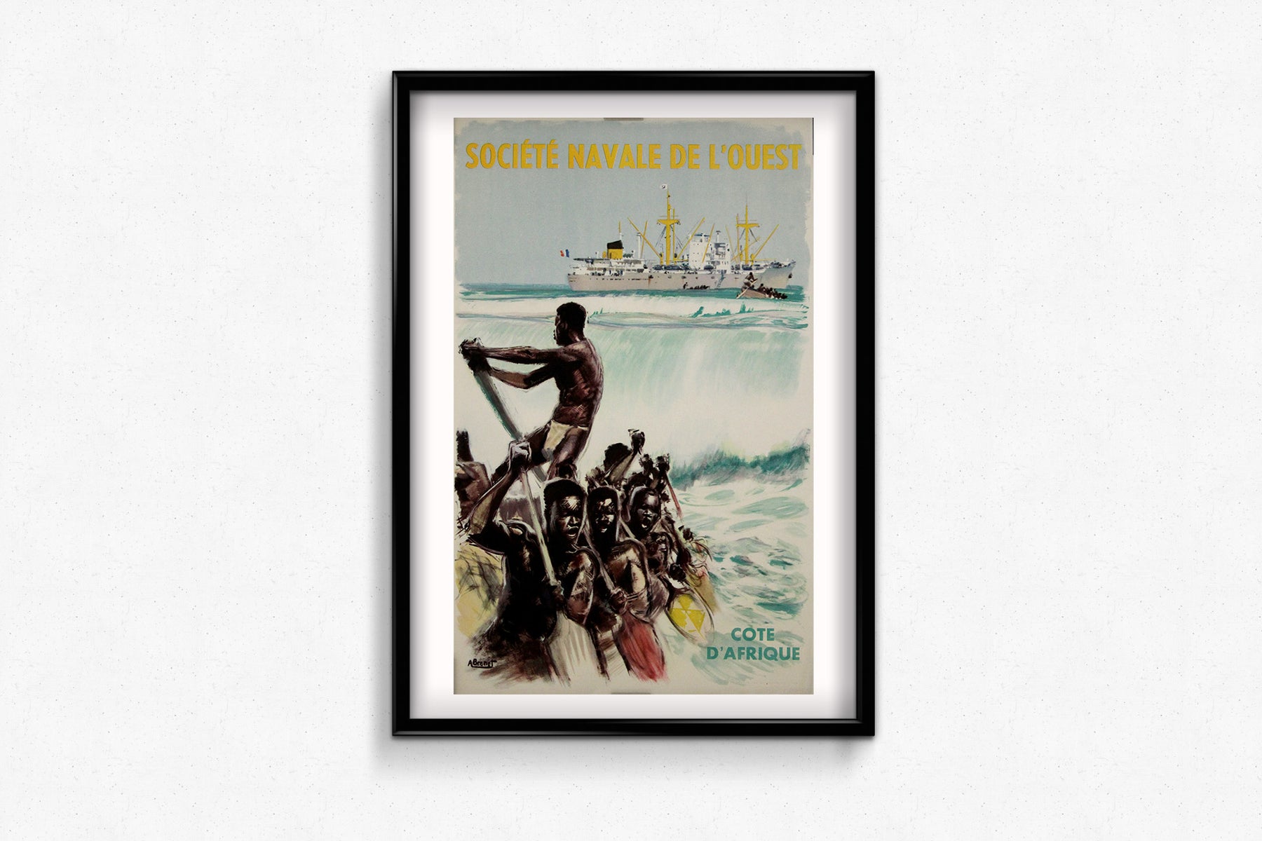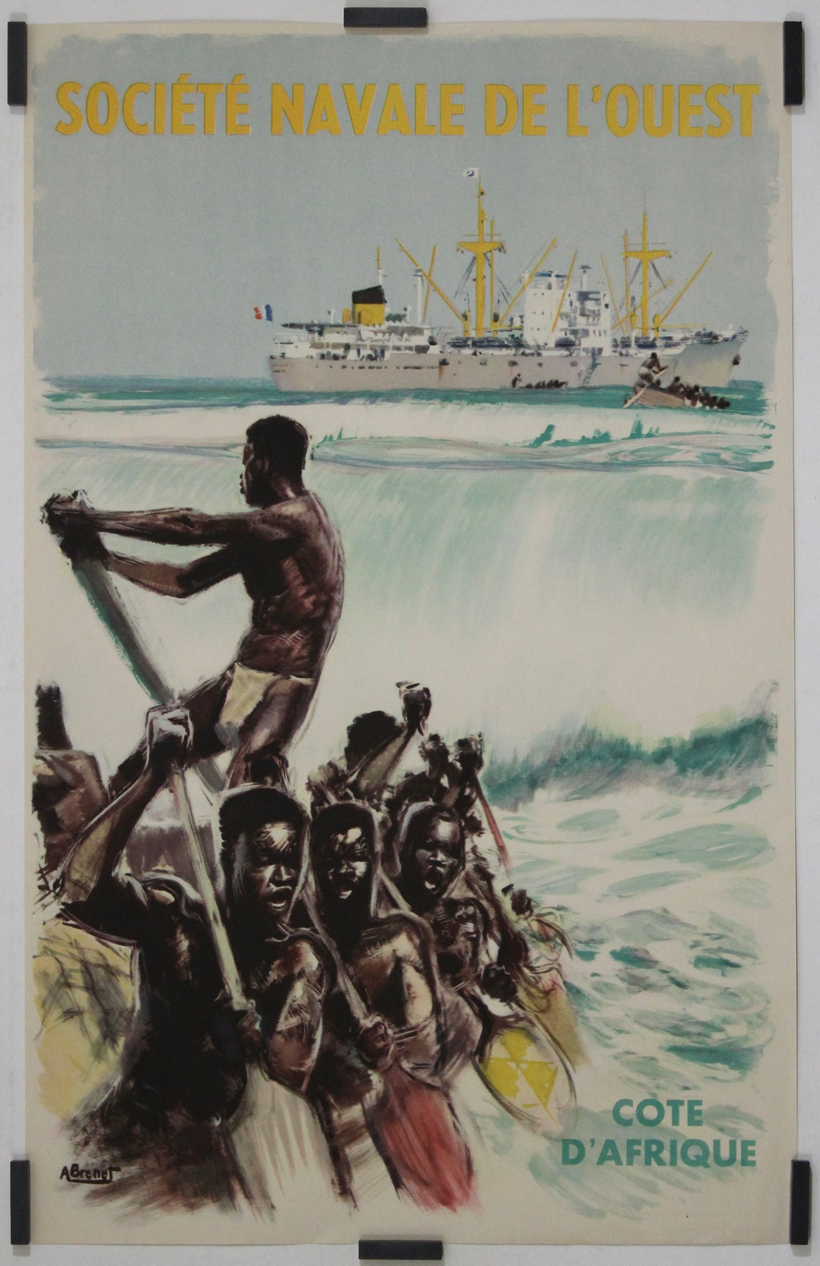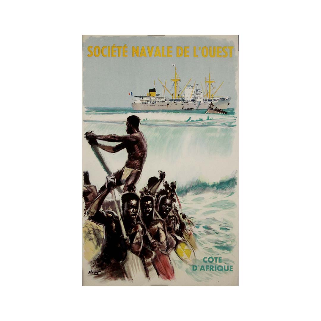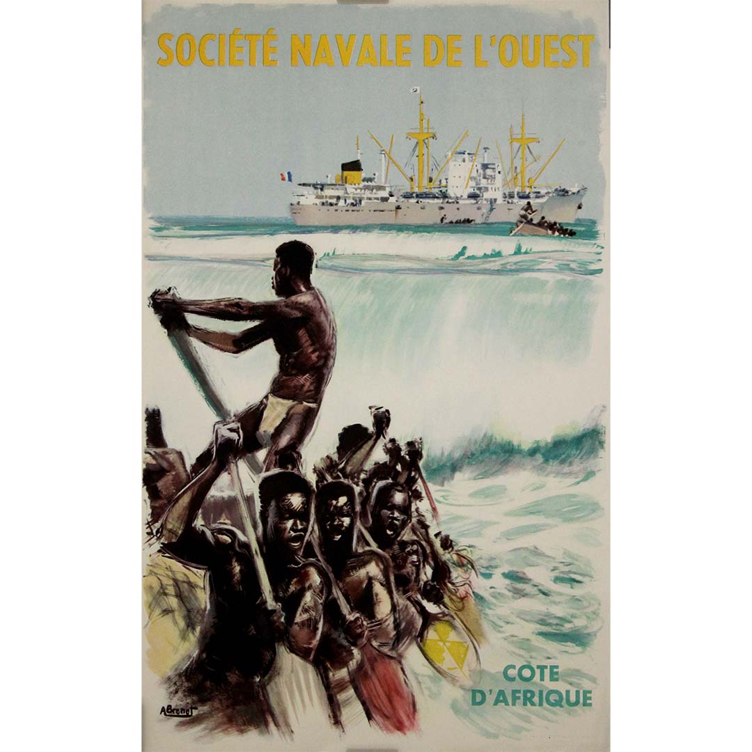 Cette affiche originale d'Albert Brénet, datant d'environ 1950, a été créée pour la Société Navale de l'Ouest afin de promouvoir le transport maritime et le commerce le long des côtes ouest-africaines. Réputé pour ses représentations magistrales de navires et de scènes maritimes, Brénet capture la puissance et l'élégance des paquebots transatlantiques, célébrant ainsi l'âge d'or de la marine marchande française.