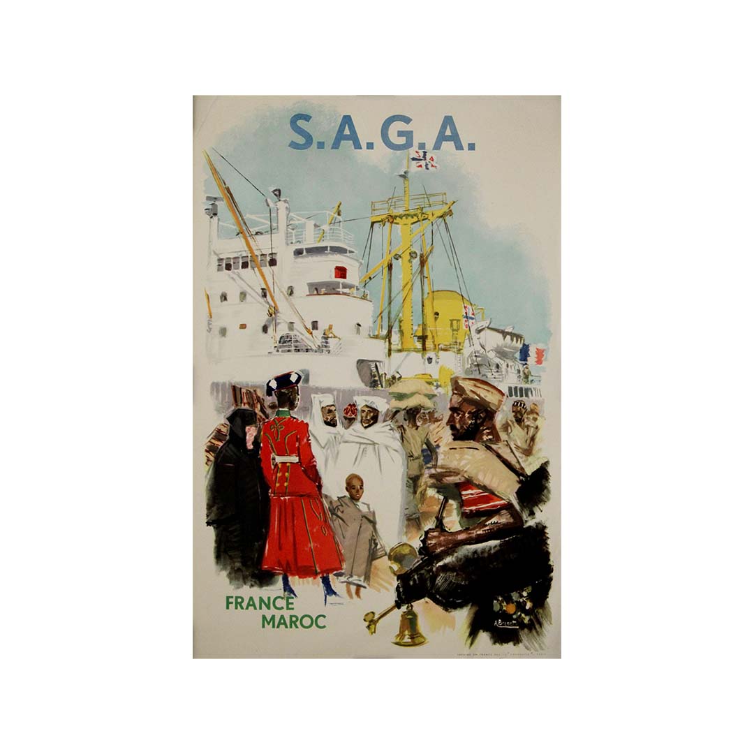 SAGA a joué un rôle essentiel dans la logistique commerciale de l'après-guerre, garantissant une liaison maritime solide entre la France et le Maroc. L'entreprise s'est spécialisée dans le transport de marchandises, reflétant l'essor des échanges commerciaux entre l'Europe et l'Afrique du Nord au milieu du XXe siècle. Des affiches comme celle-ci servaient non seulement de supports publicitaires, mais aussi de témoignages artistiques de l'âge d'or du commerce maritime, célébrant le développement du réseau mondial d'échanges commerciaux et industriels.