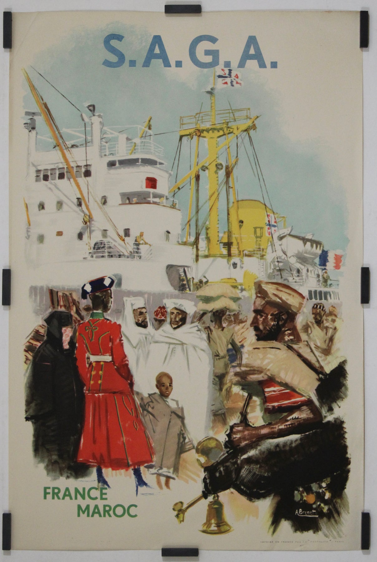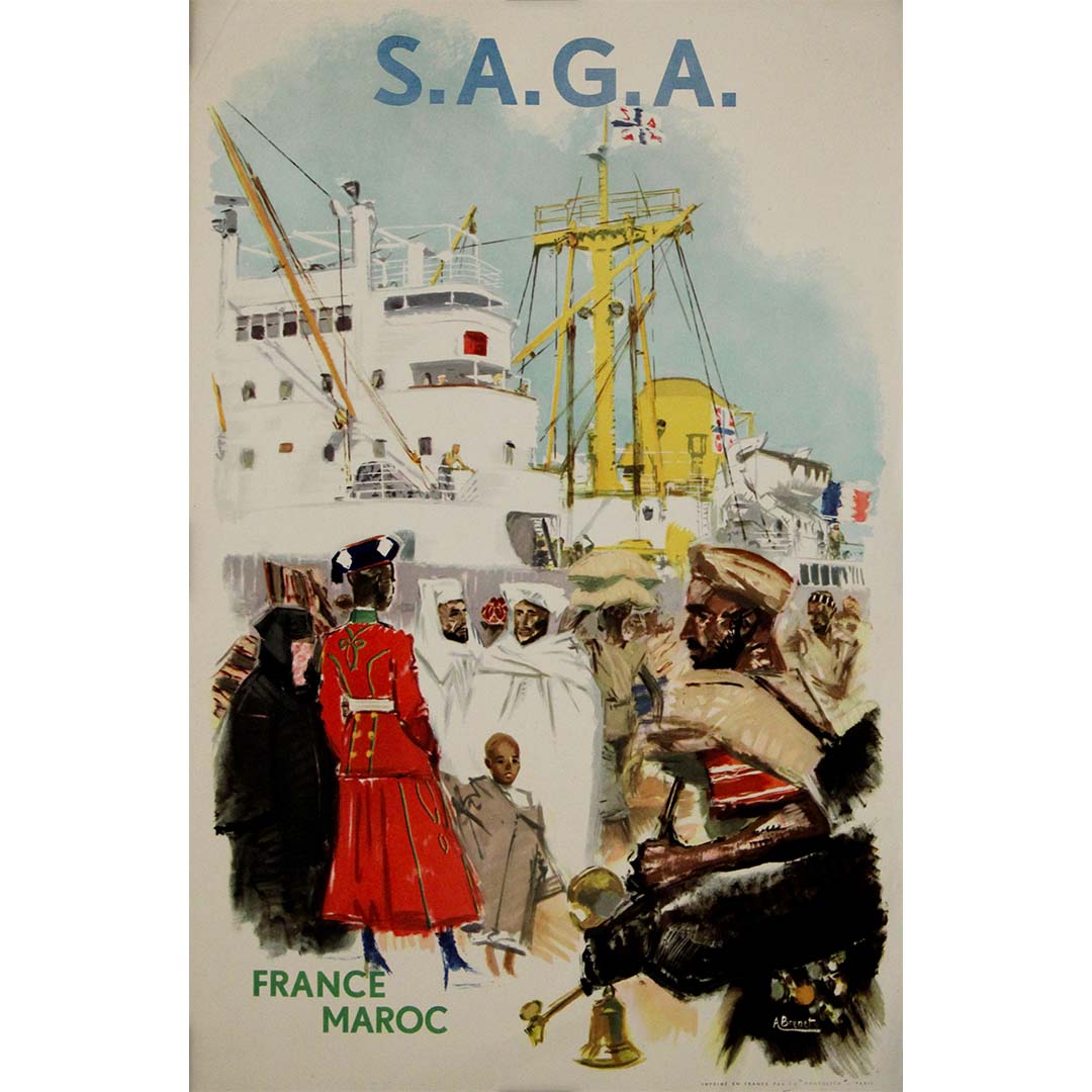 Cette affiche originale d'Albert Brénet, datant d'environ 1950, a été créée pour la SAGA (Société Auxiliaire de Gérance et d'Affrètement) afin de promouvoir le transport maritime et de marchandises entre la France et le Maroc. Maître de l'art maritime et industriel, Brénet livre ici une composition saisissante qui capture le dynamisme du commerce et des voyages internationaux.