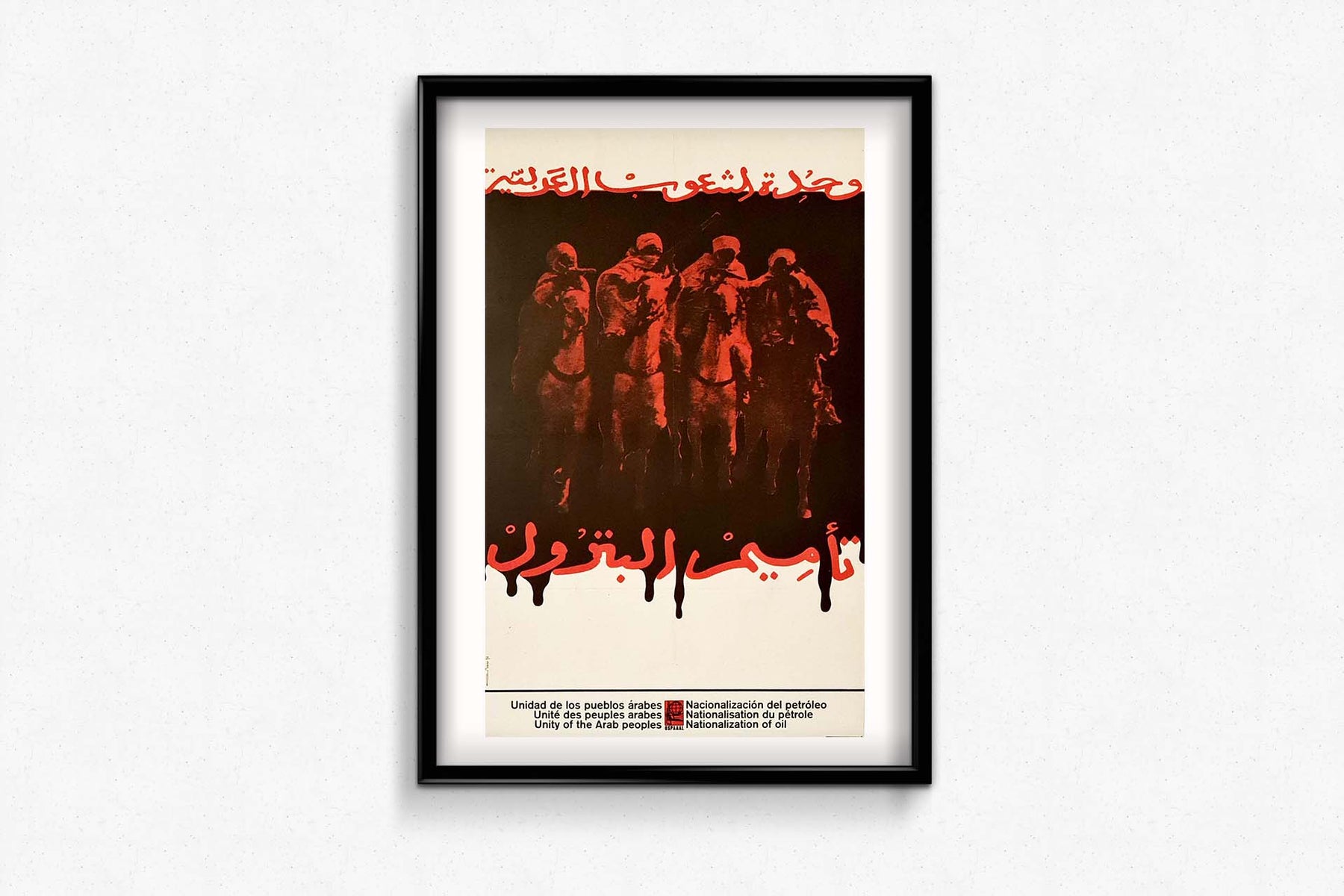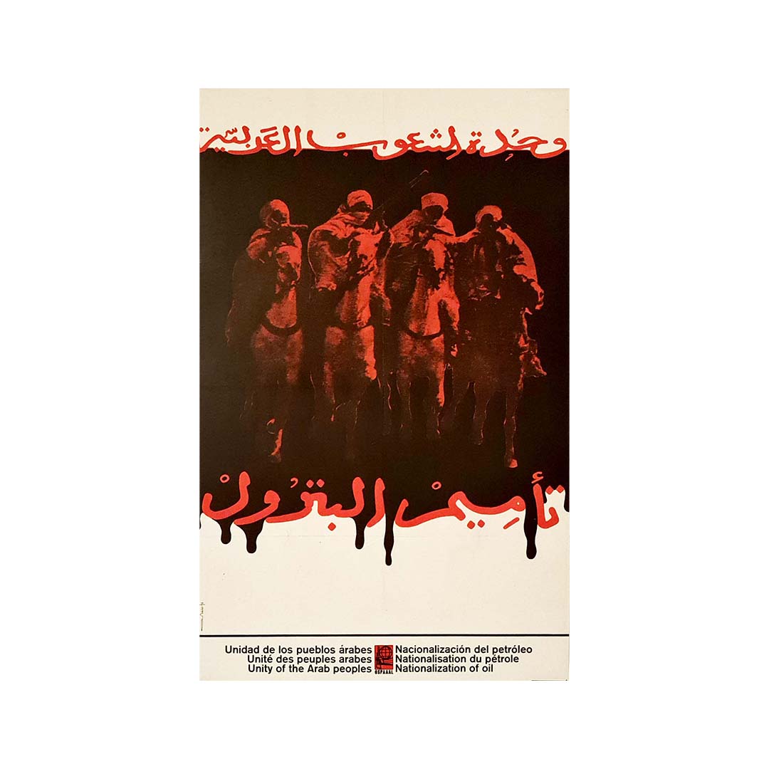 L'affiche représente quatre hommes à cheval, tenant des fusils et galopant vers le spectateur, avec le texte « Unité des peuples arabes - Nationalisation du pétrole » en arabe au-dessus et en dessous de l'image.