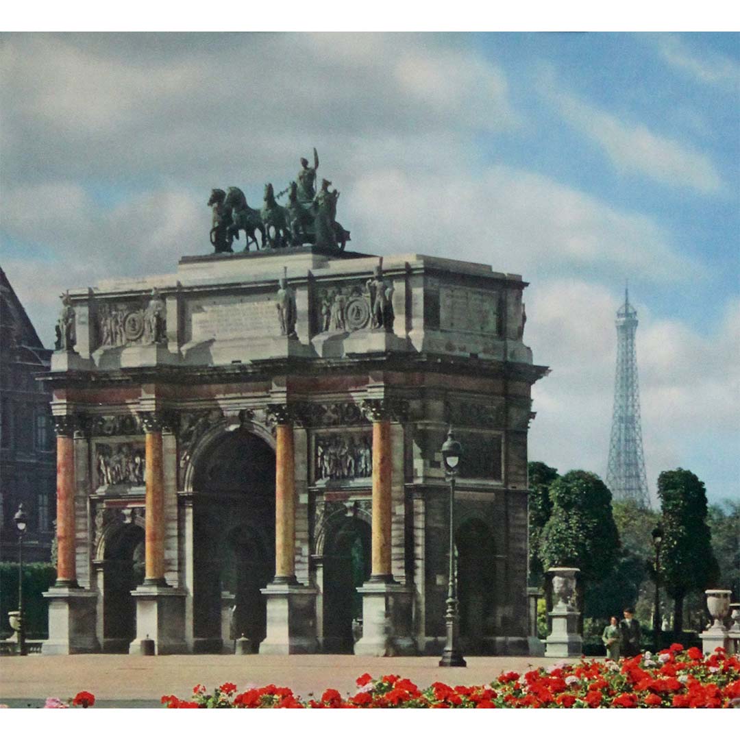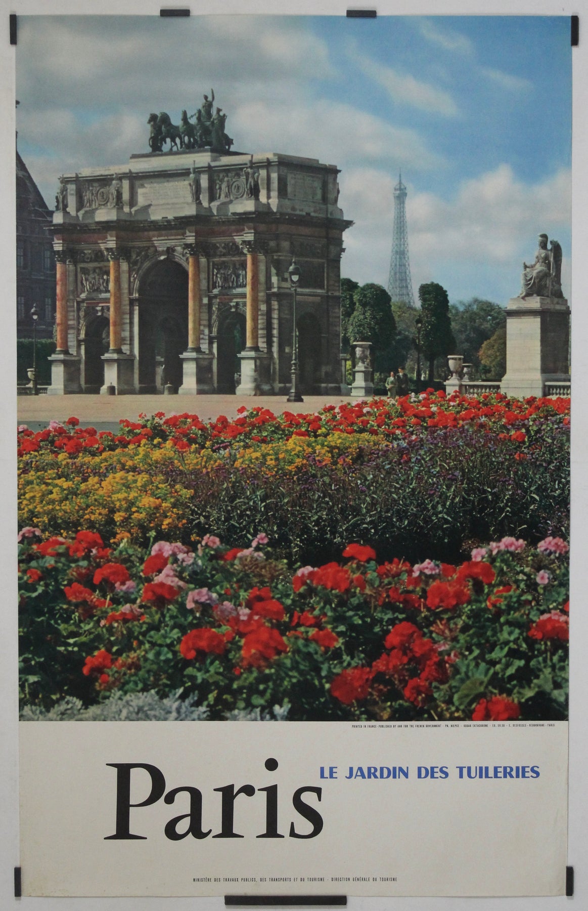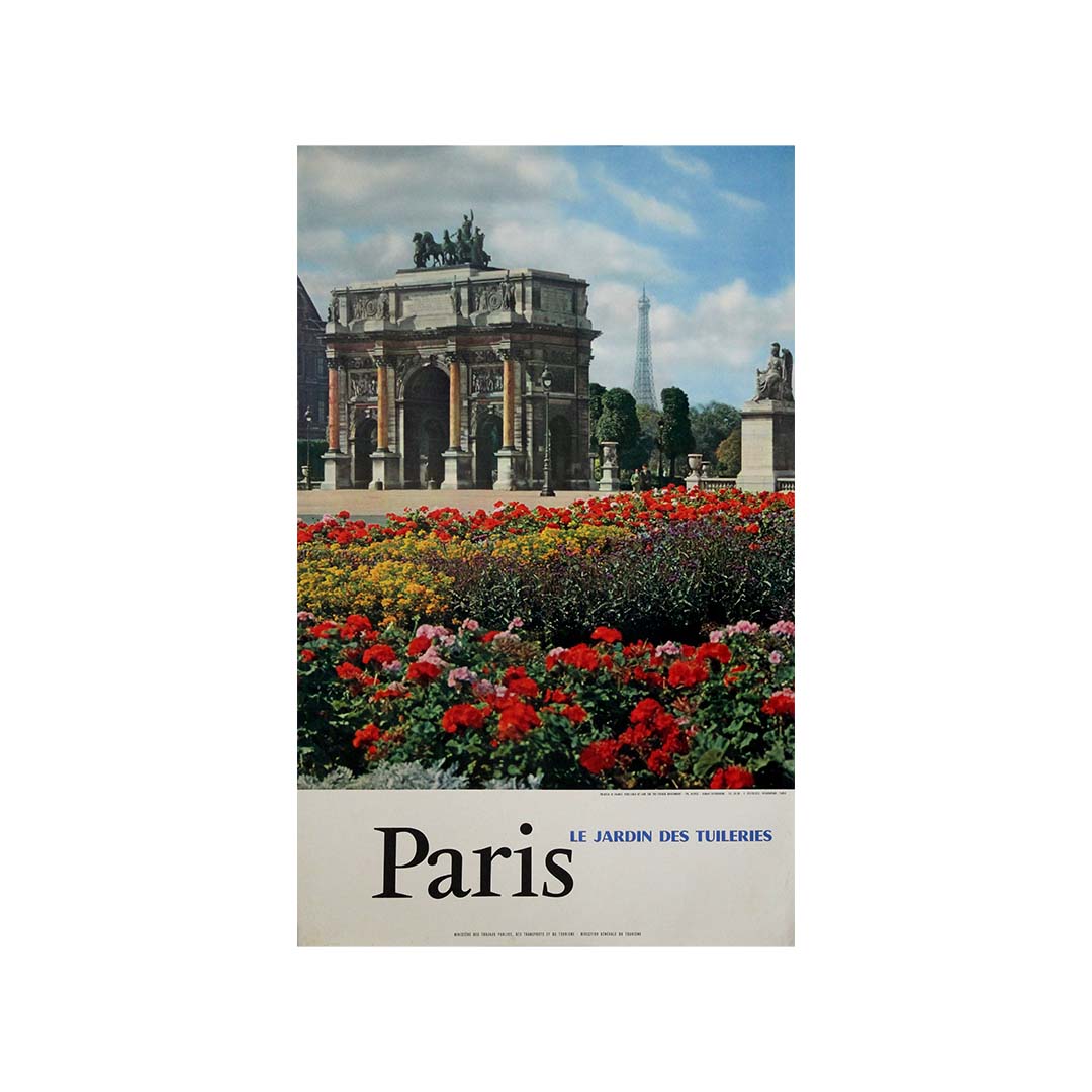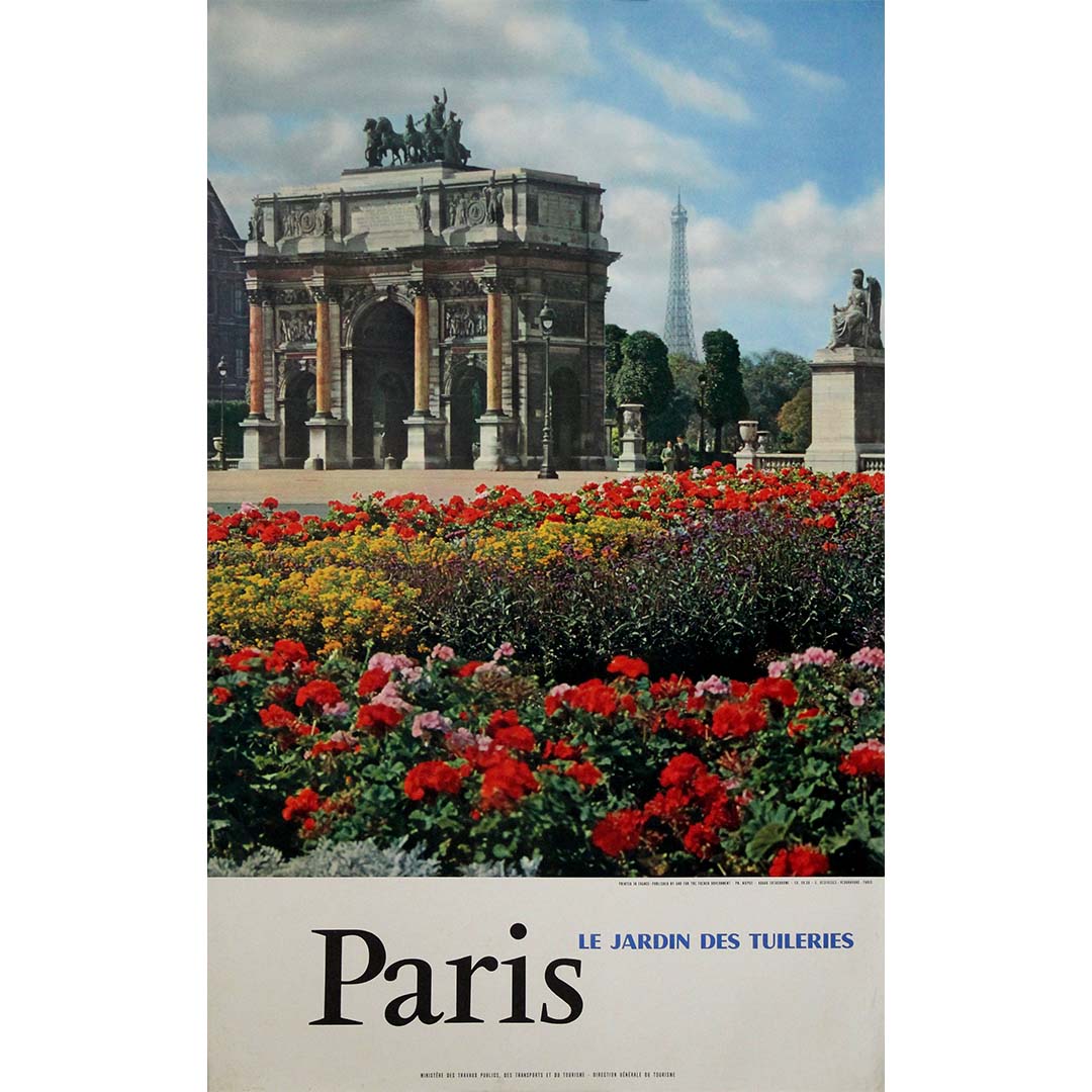 Publiée dans le cadre d'une vaste campagne française visant à relancer le tourisme dans les années 1950, l'affiche allie la netteté de la photographie documentaire au charme romantique des monuments parisiens emblématiques. Le jardin des Tuileries, conçu par André Le Nôtre au XVIIe siècle, constitue le cœur symbolique de la capitale, reliant le musée du Louvre à la place de la Concorde. À son entrée se dresse l'Arc de Triomphe du Carrousel, érigé par Napoléon Ier pour commémorer ses victoires militaires et inspiré de l'Arc de Constantin à Rome.